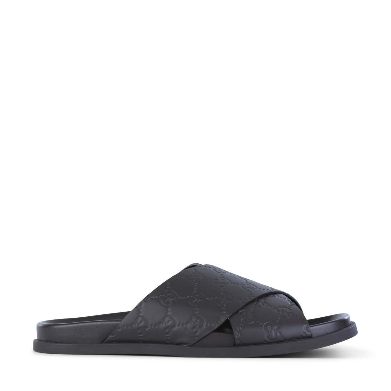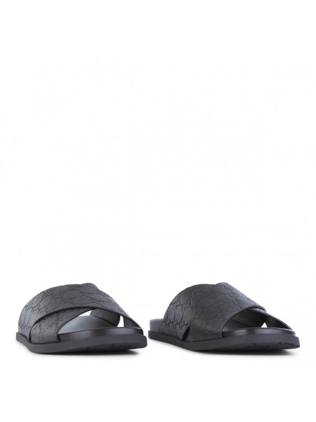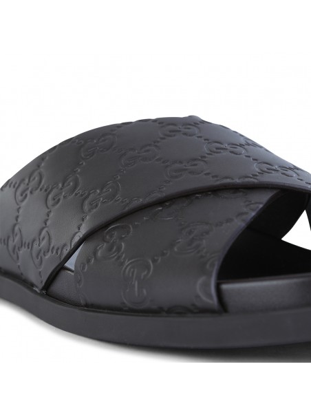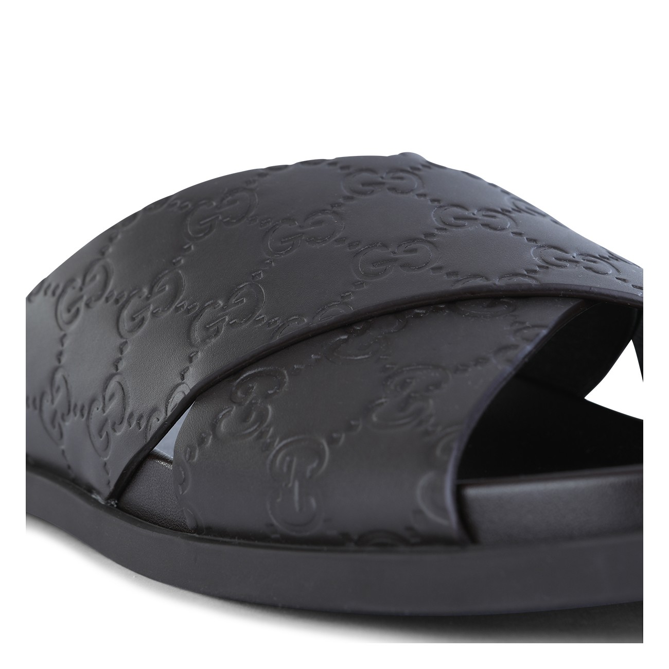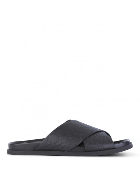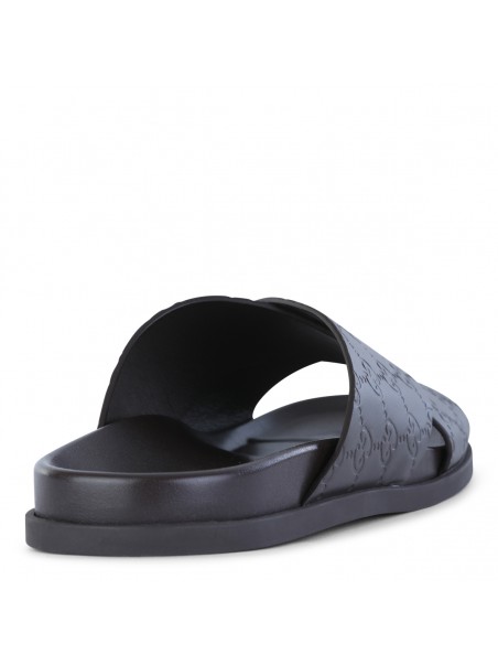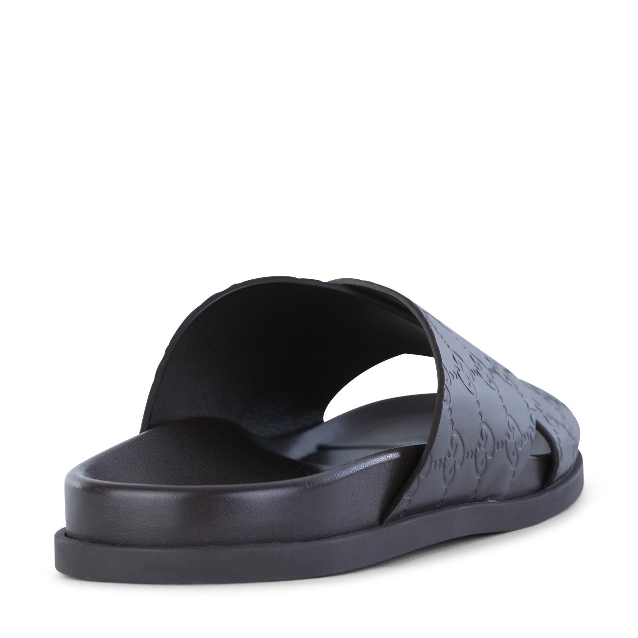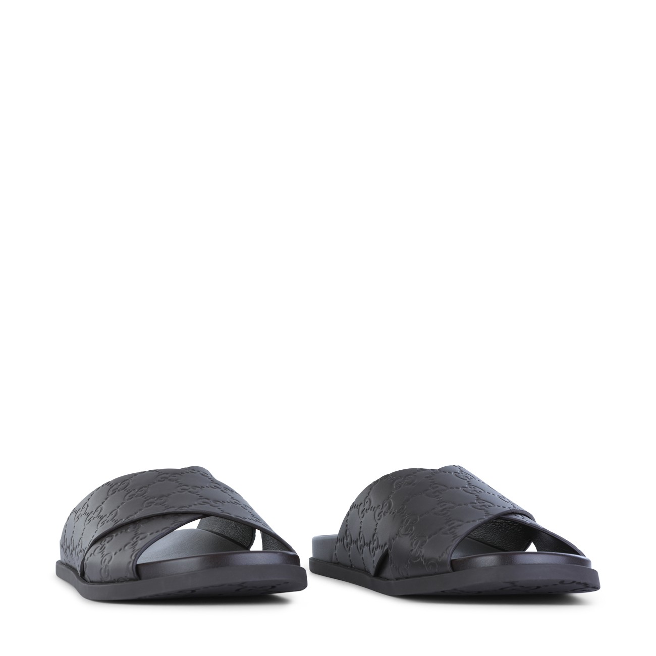 Black leather flats from Gucci featuring open square toe, all over monogram, slip-on style, branded footbed and flat rubber sole.