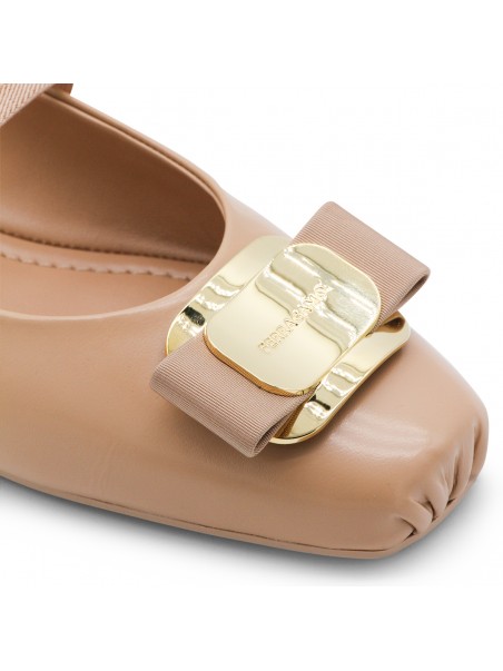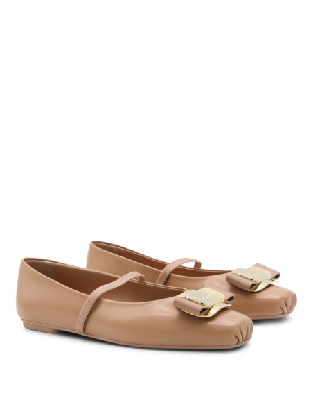 Beige leather flats from Ferragamo featuring square toe, frontal gold patch, upper strap, flip on style and leather sole.