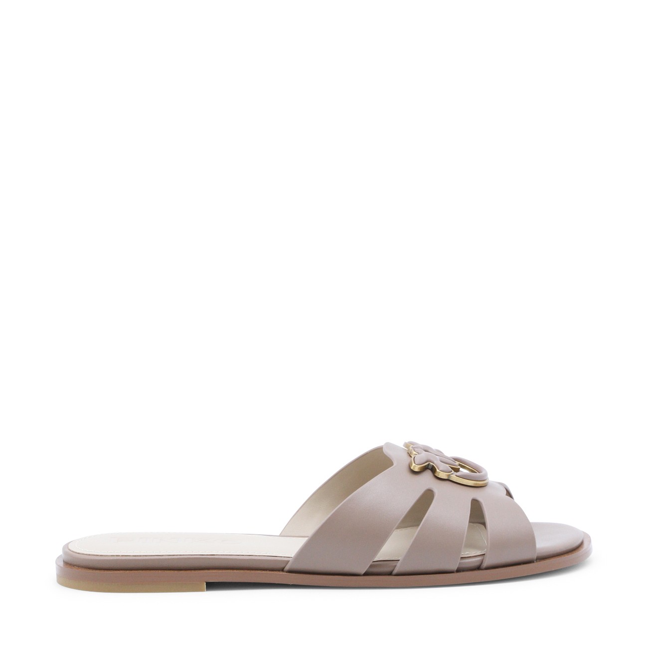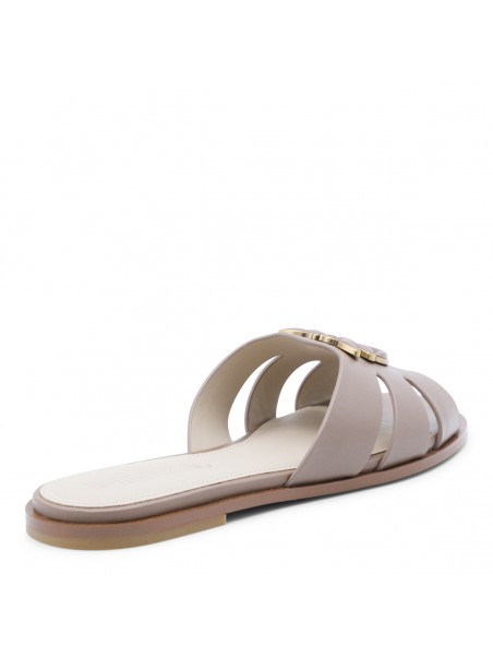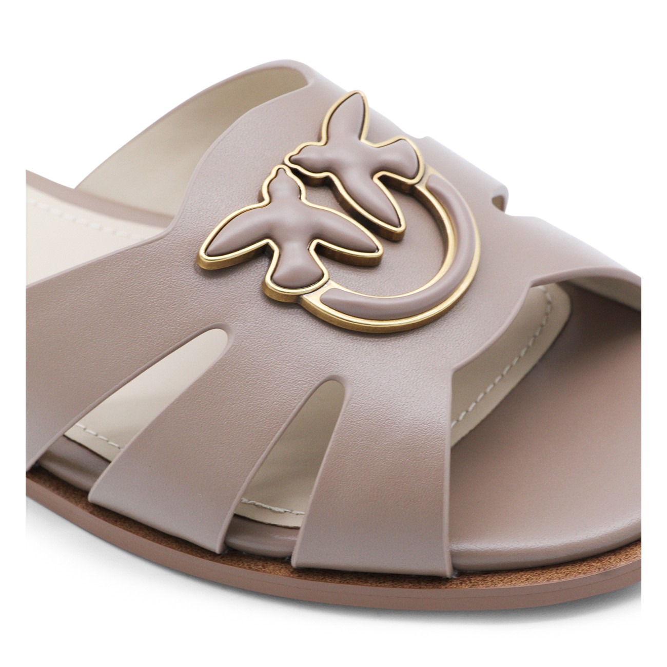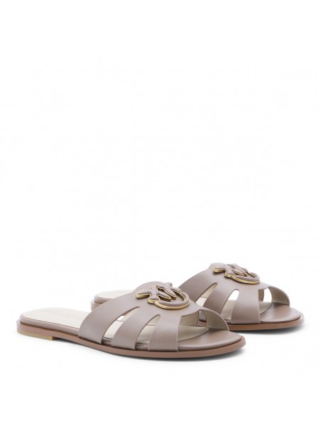 Nude leather Milly 04 flats from Pinko featuring round open toe, slip-on style, open back, wide band, upper logo detail and flat sole.