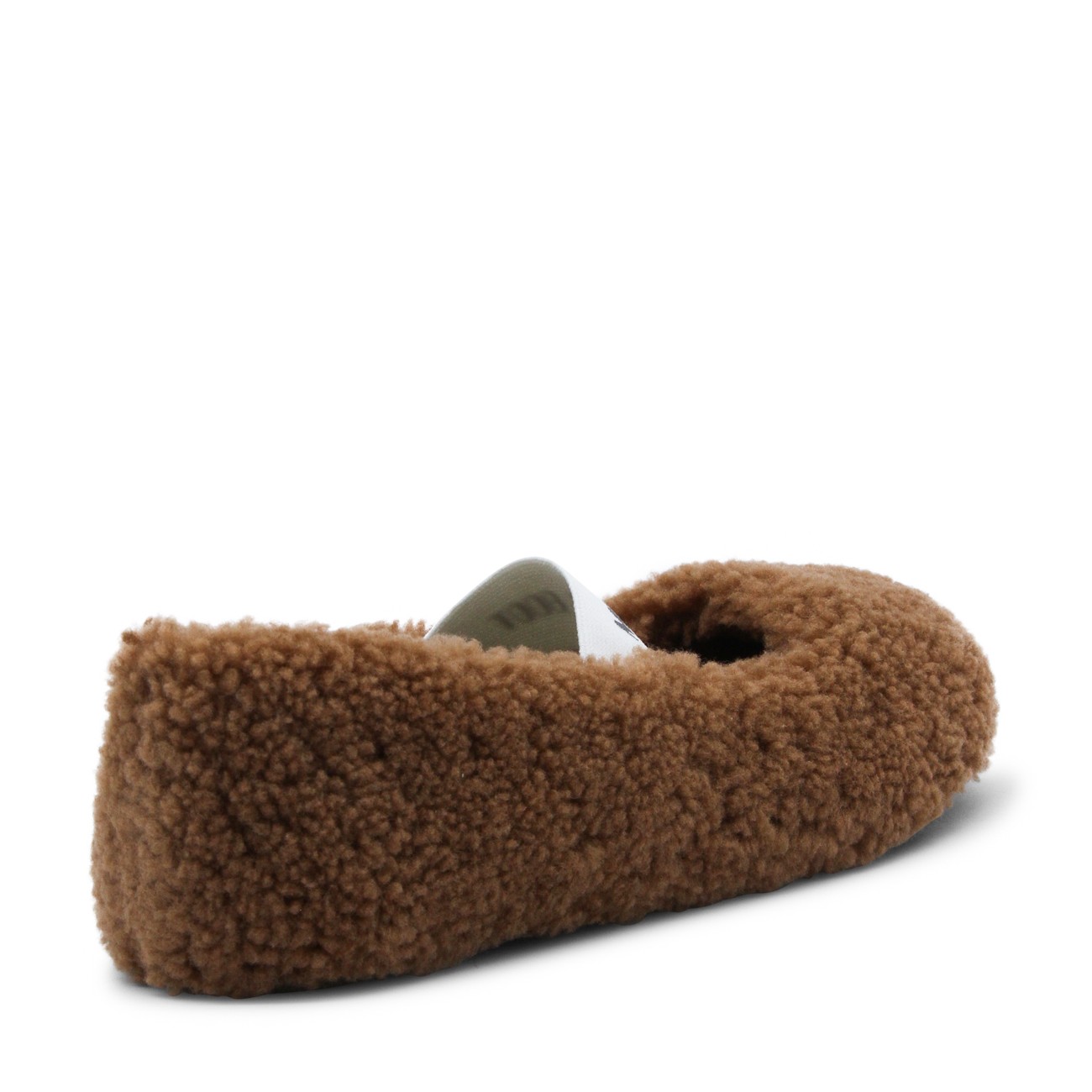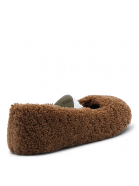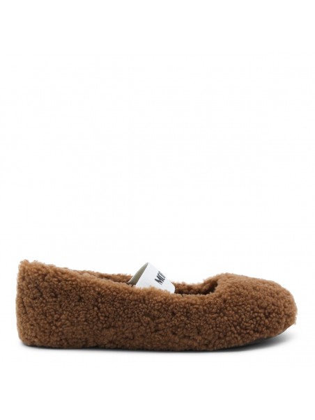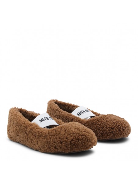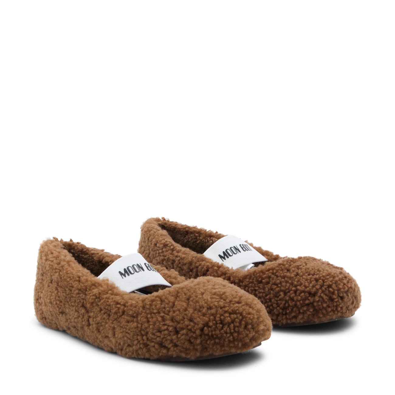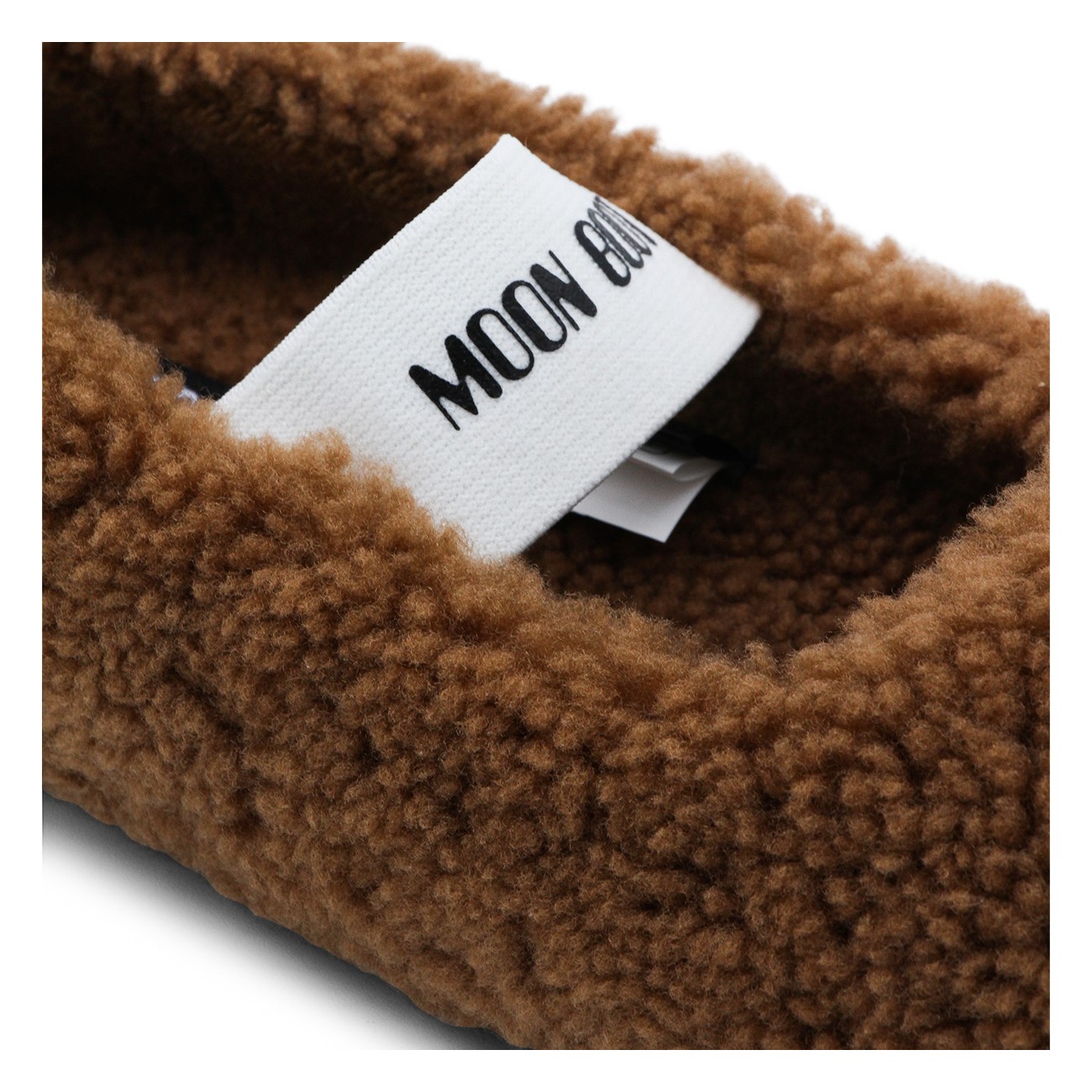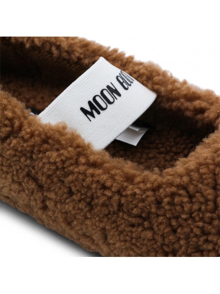 Cognac shearling ballerina from Moon Boot featuring round toe, slip-on style, logo-printed strap, rubber sole and shealing fur.