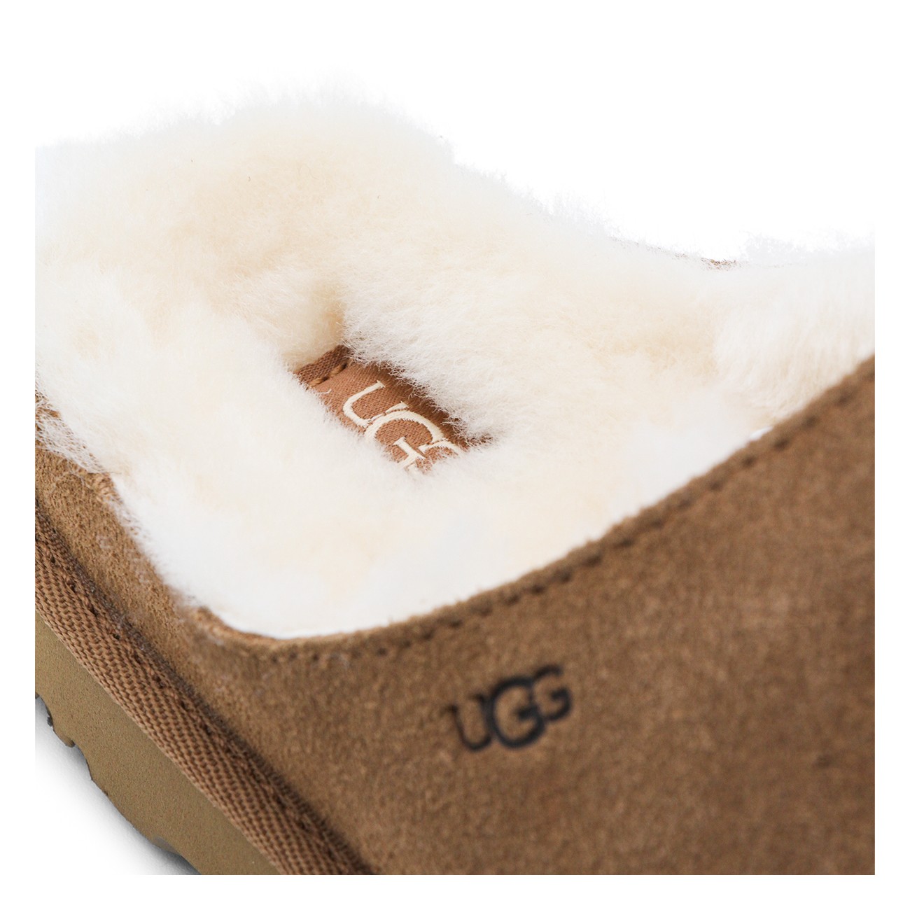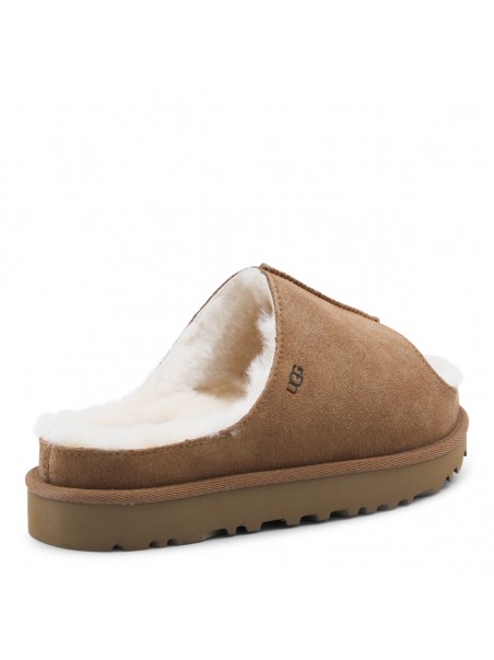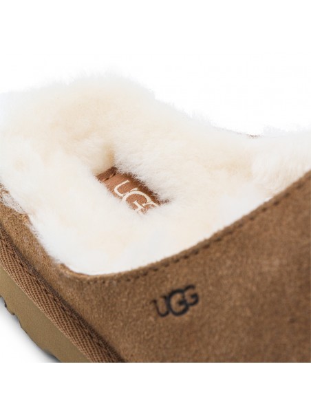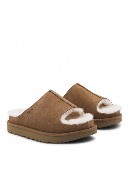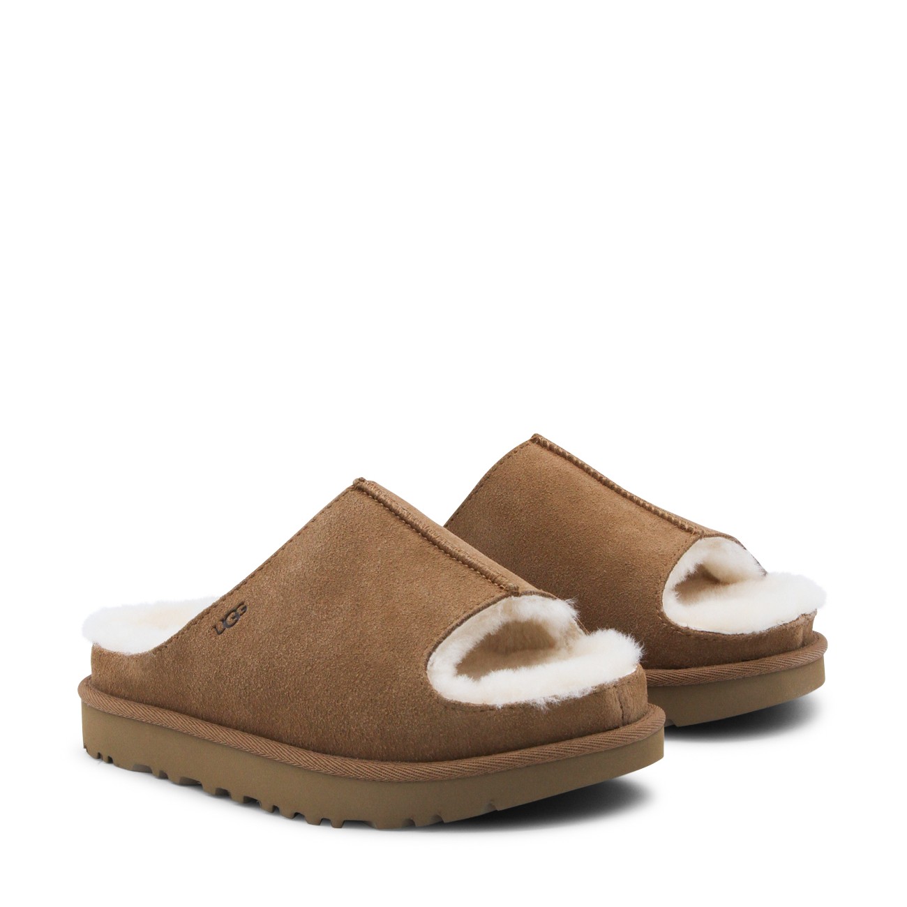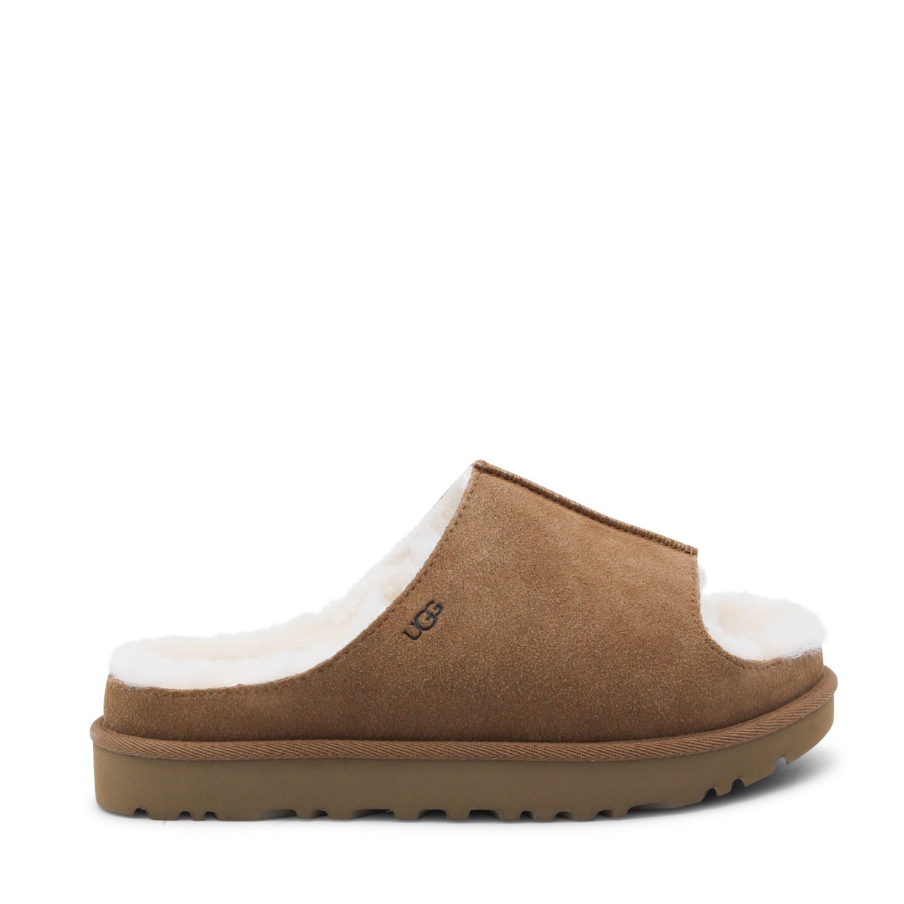 Chestnut Greenport slide flats from UGG featuring open toe, rubber sole, embossed logo at side and branded insole.