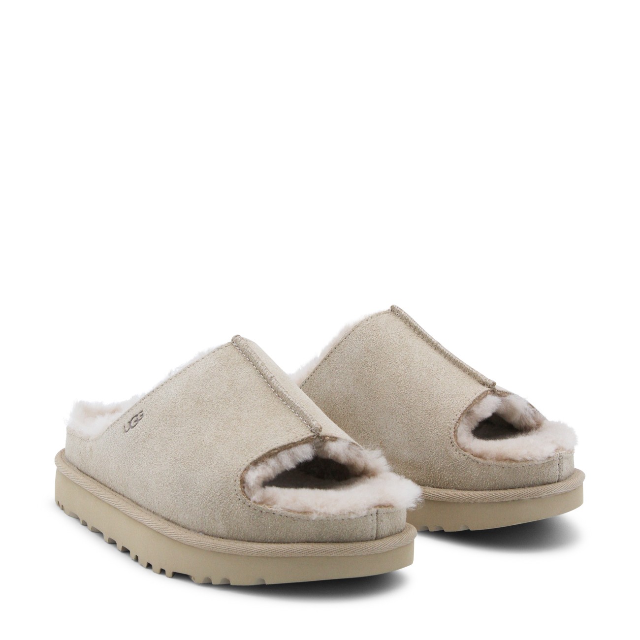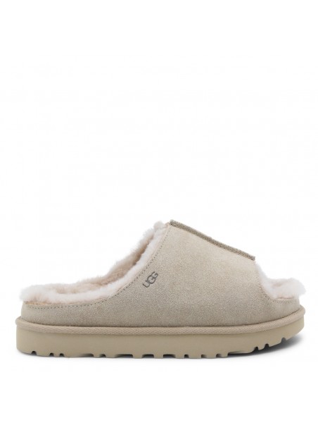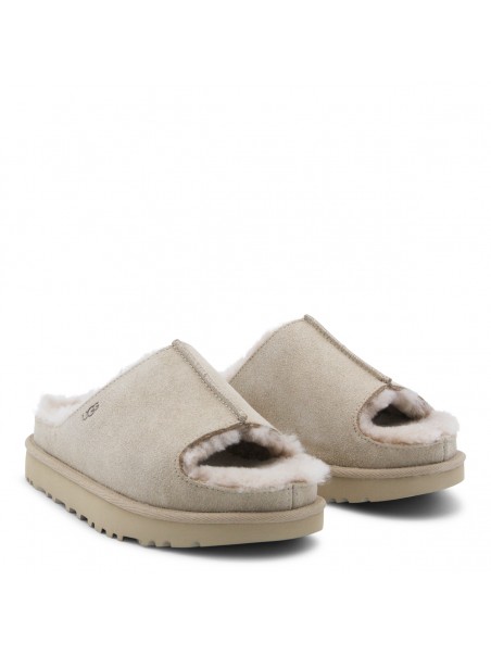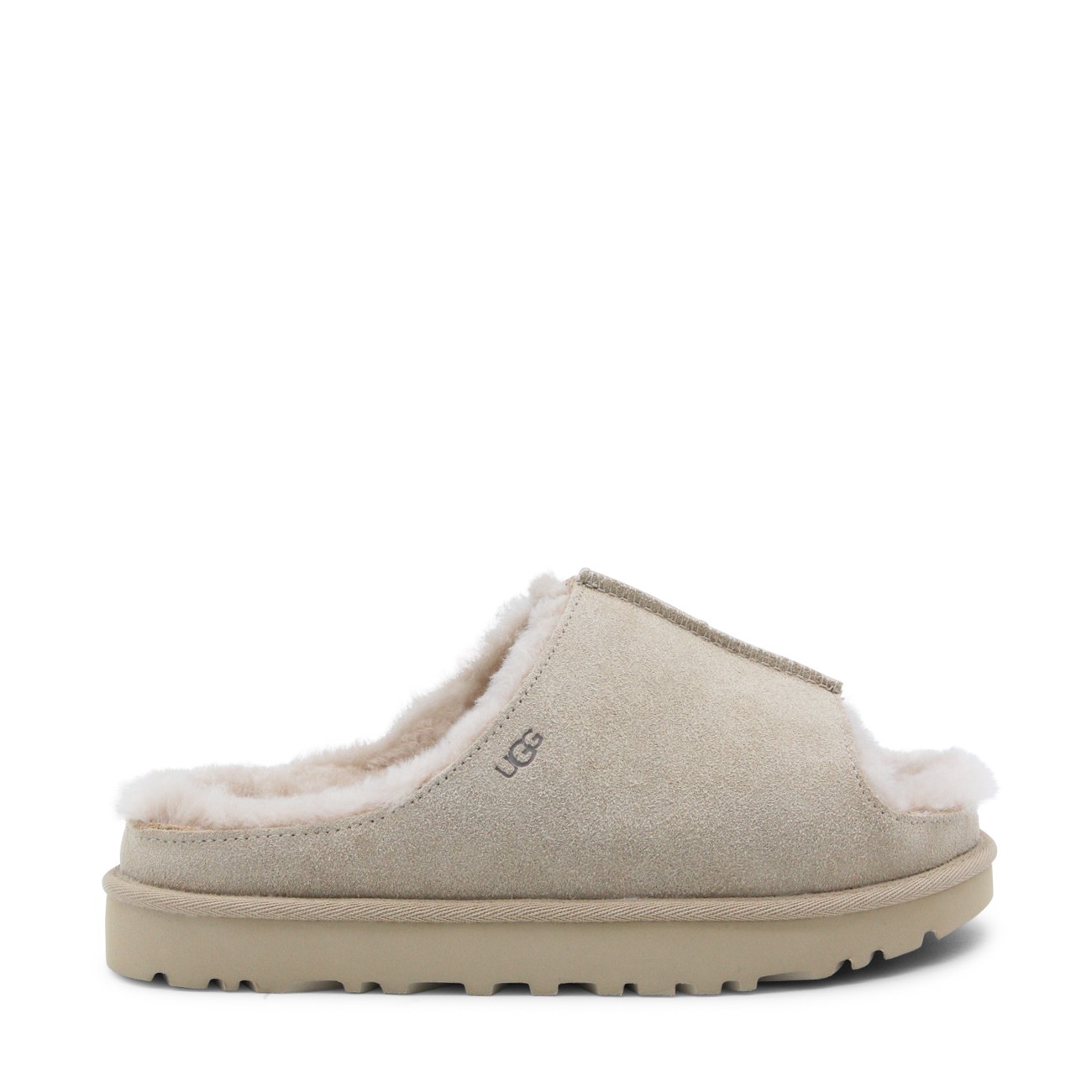 Sand Greenport slide flats from UGG featuring open toe, rubber sole, embossed logo at side and branded insole.