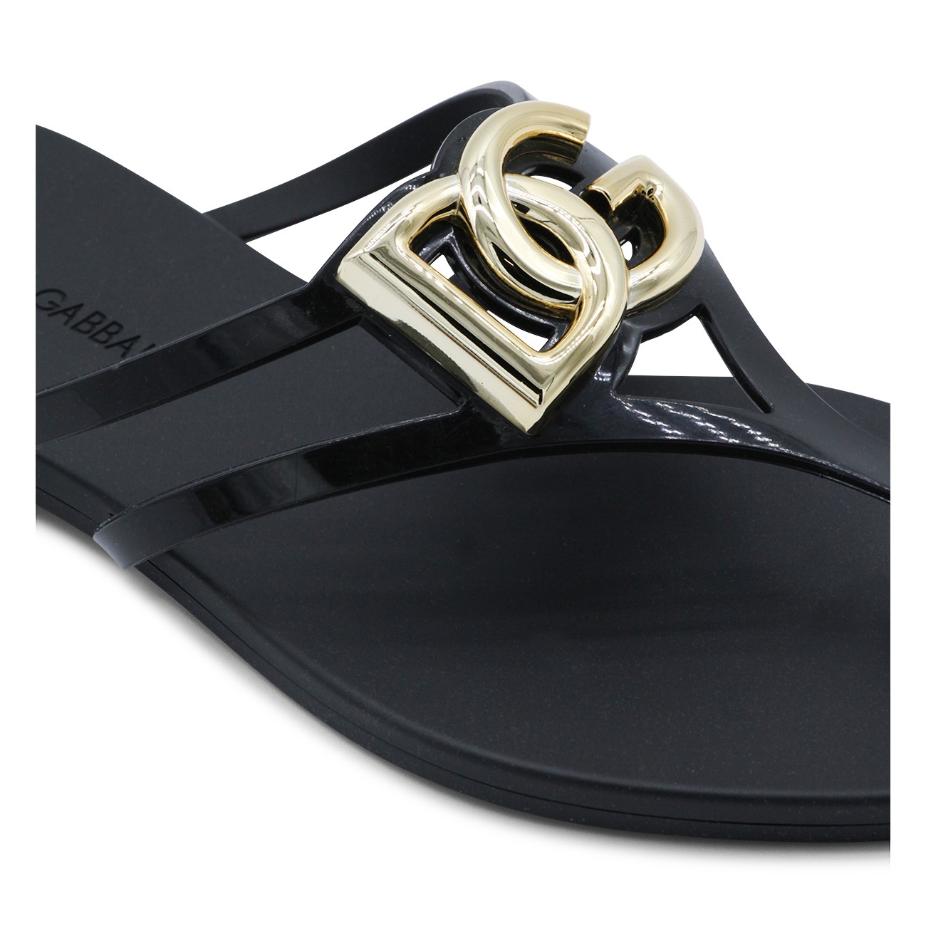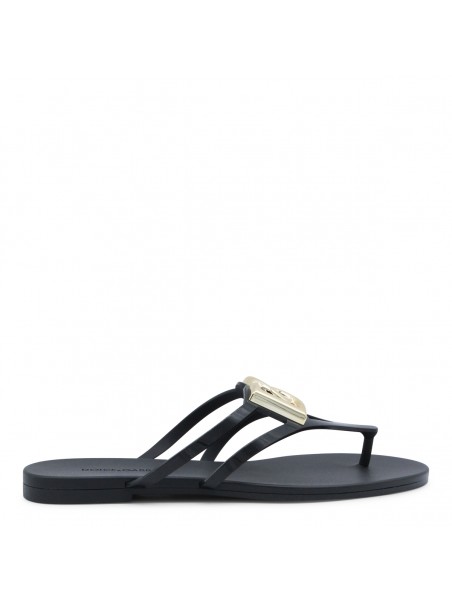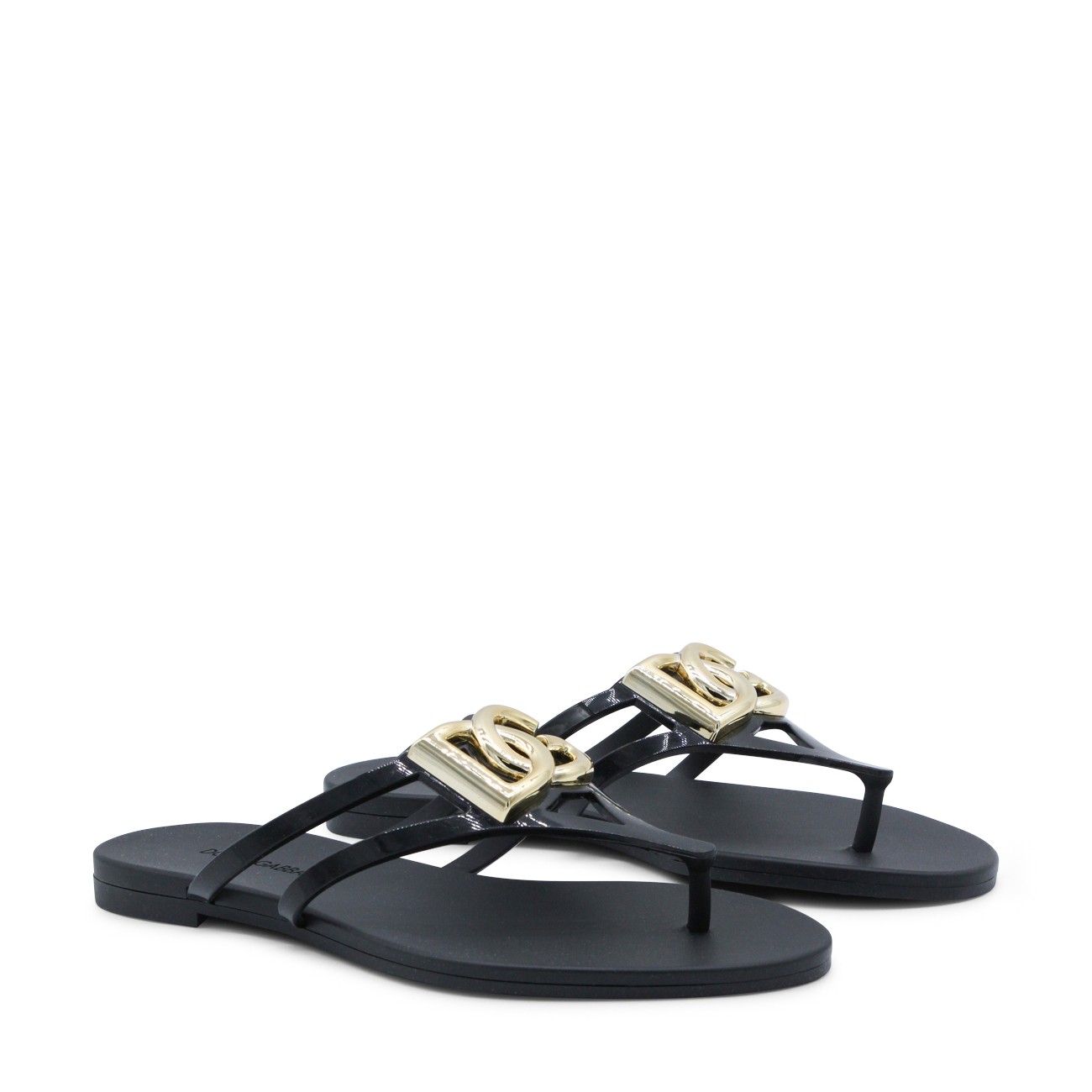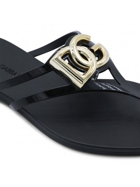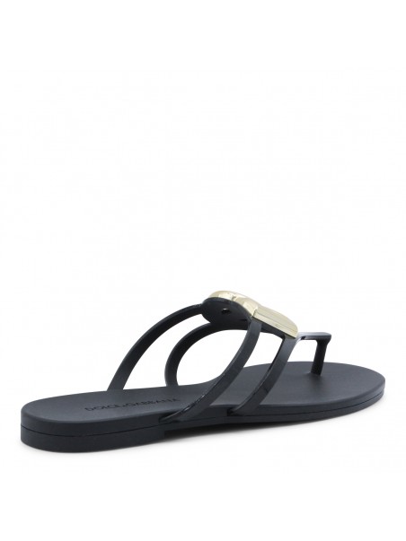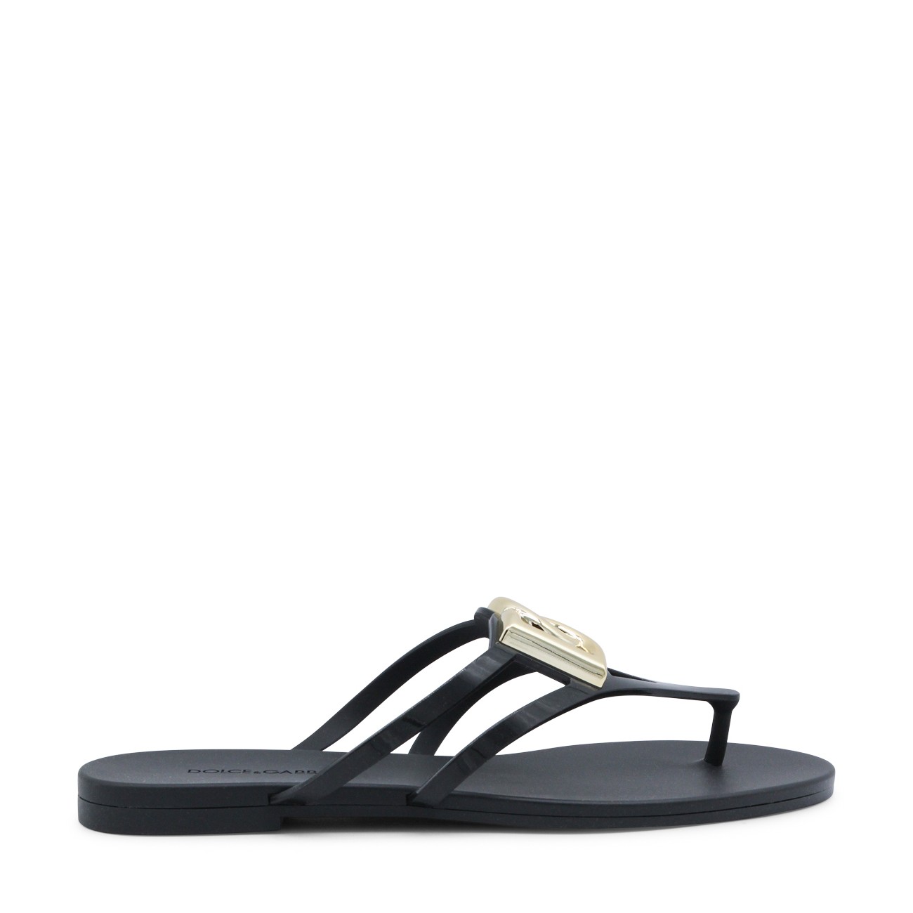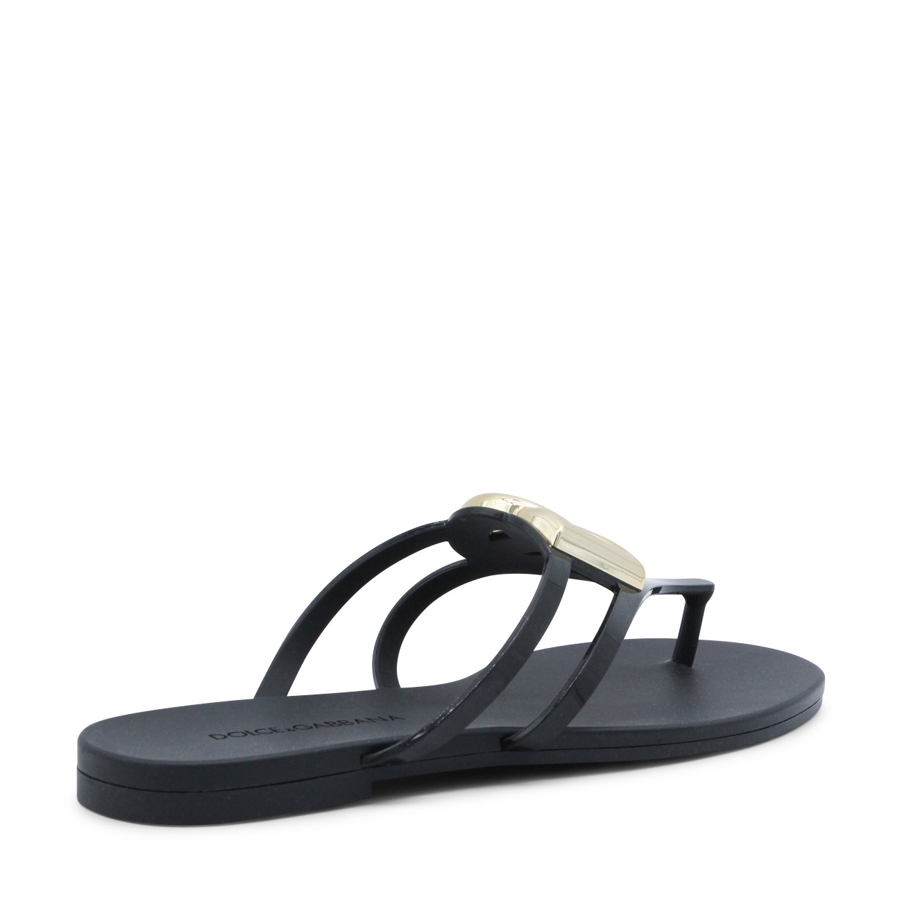 Black leather flats from Dolce&Gabbana featuring round open toe, gold tone hardware and open back with leather sole.