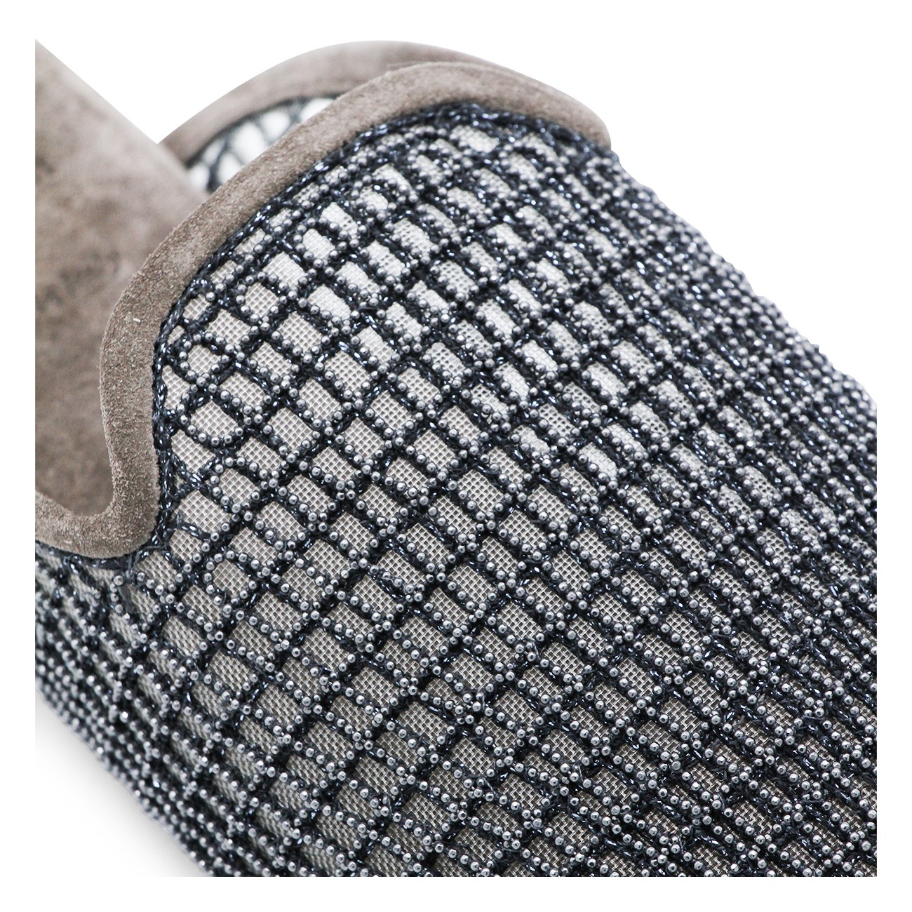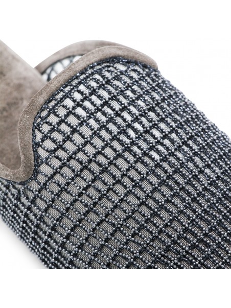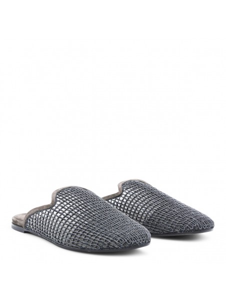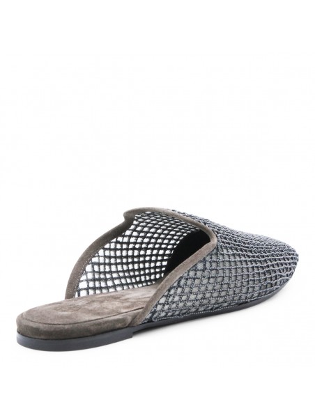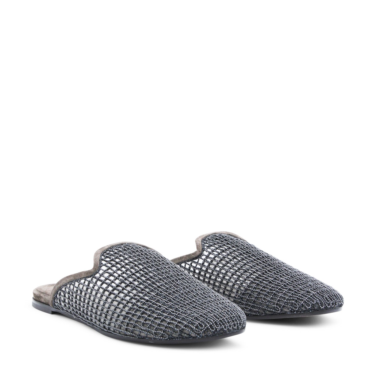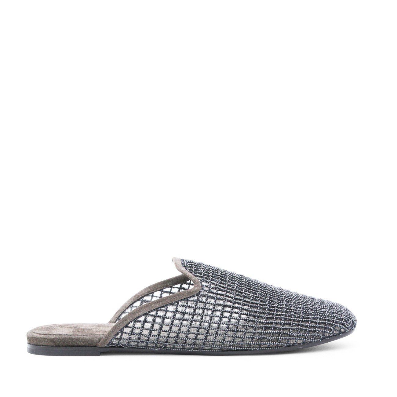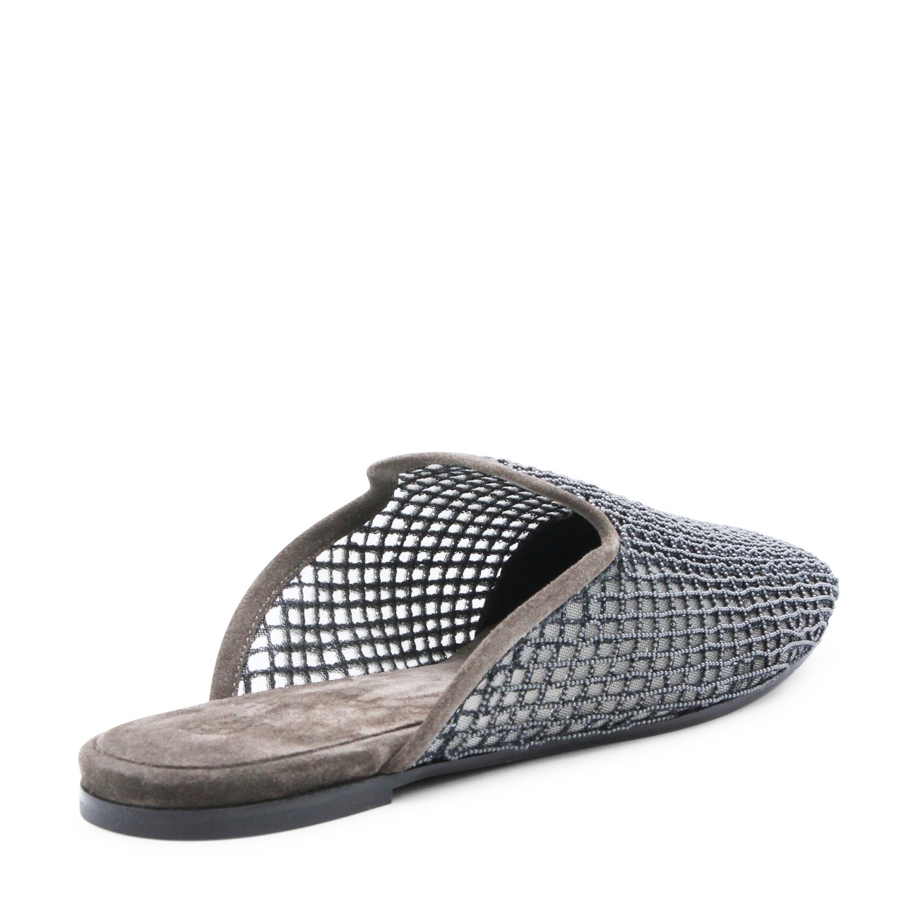 Grey leather flats from Brunello Cucinelli featuring round toe, open back and leather sole.
