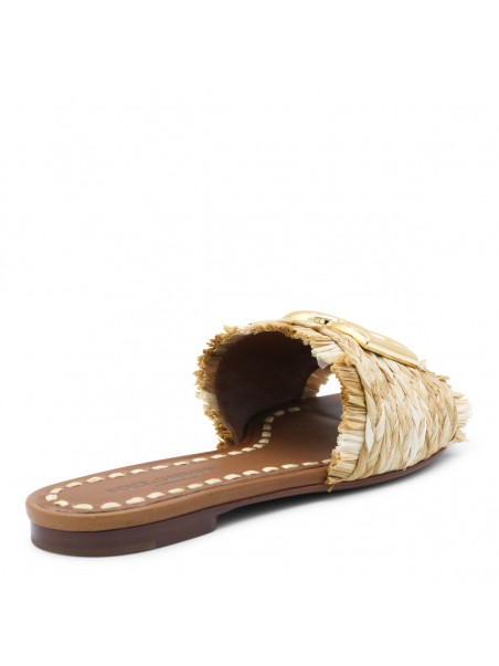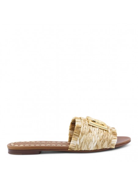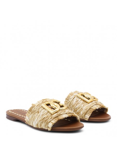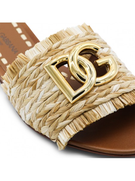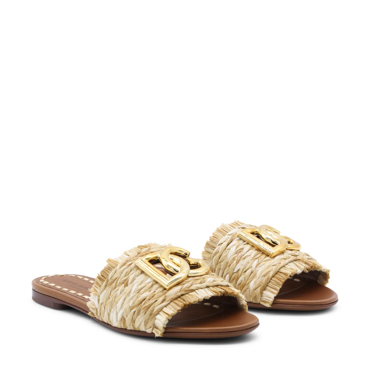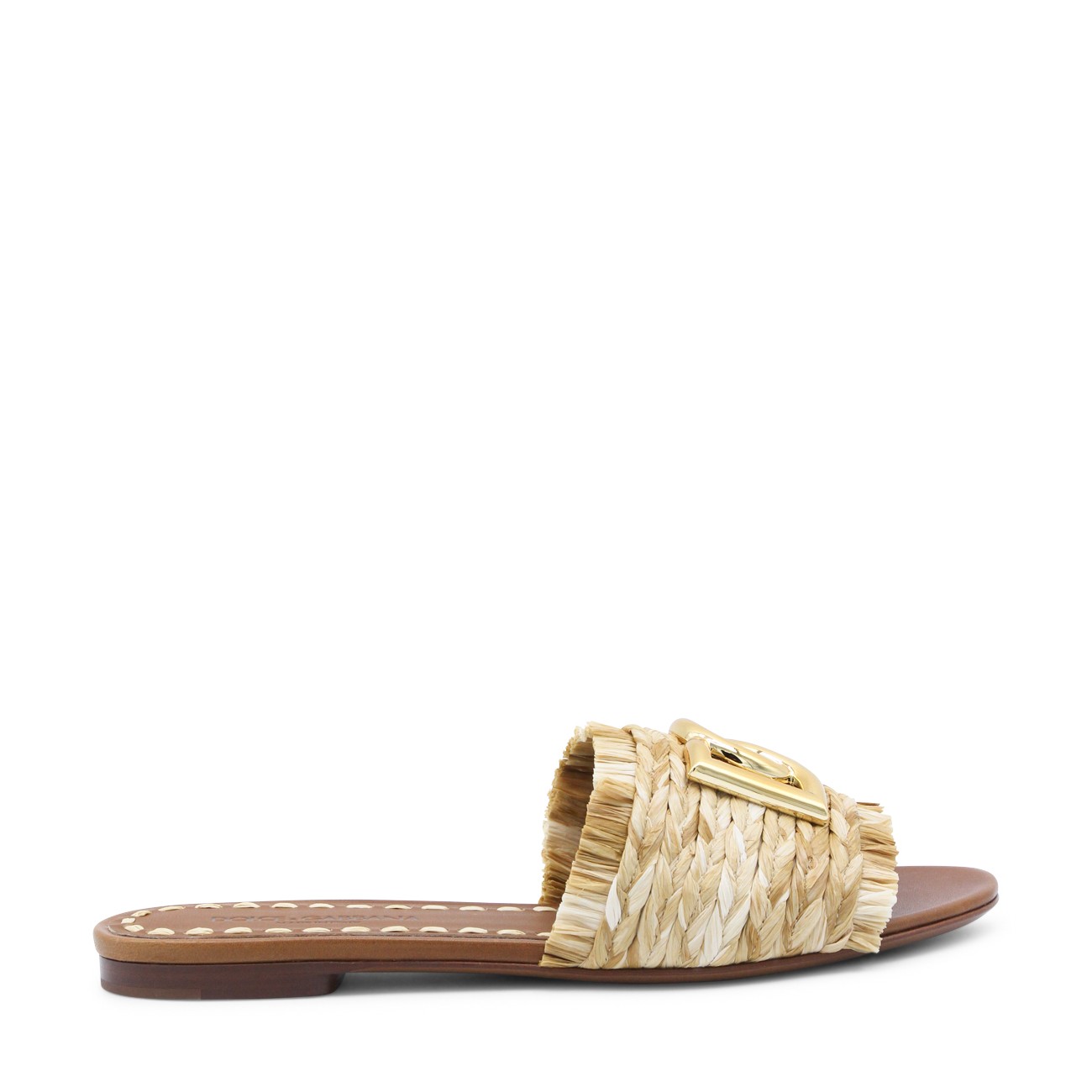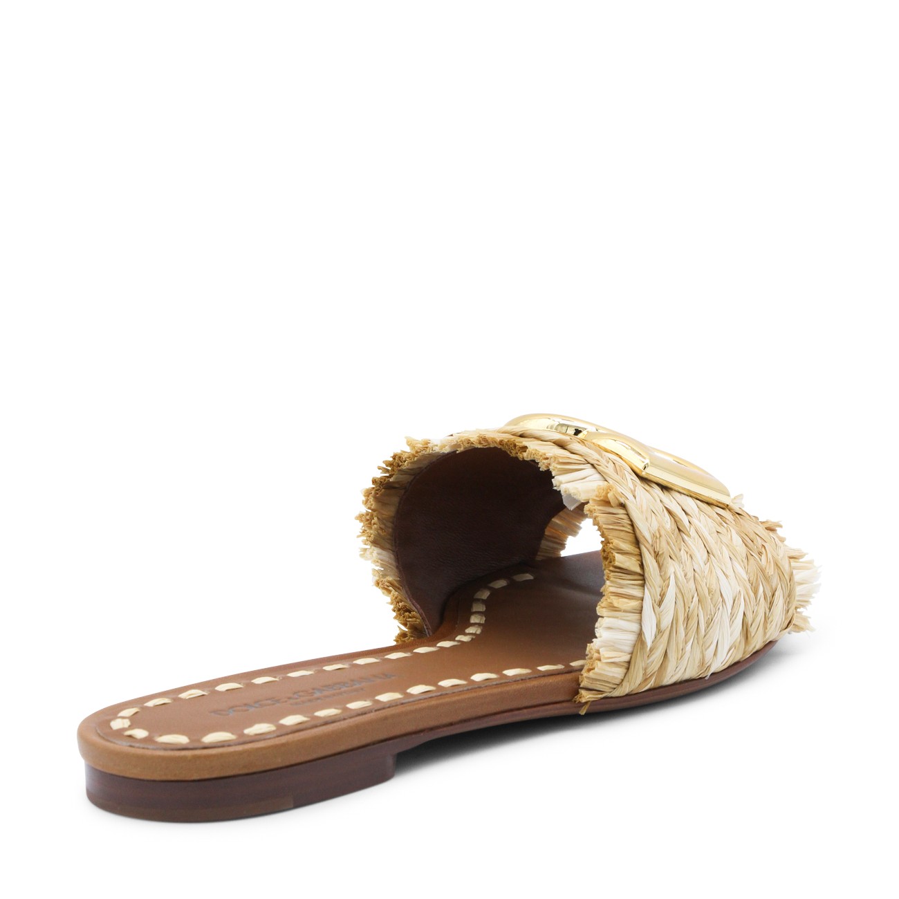 Brown leather flat from Dolce & Gabbana featuring round open toe, leather lining, leather sole and gold tone logo hardware and raffia braid.