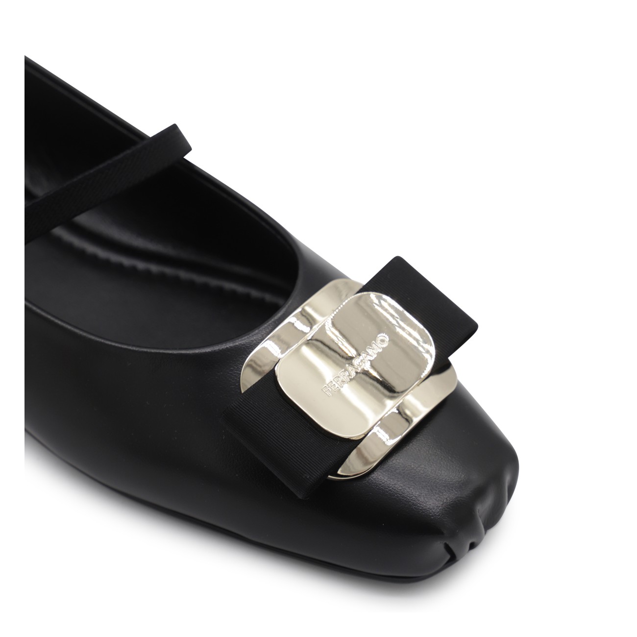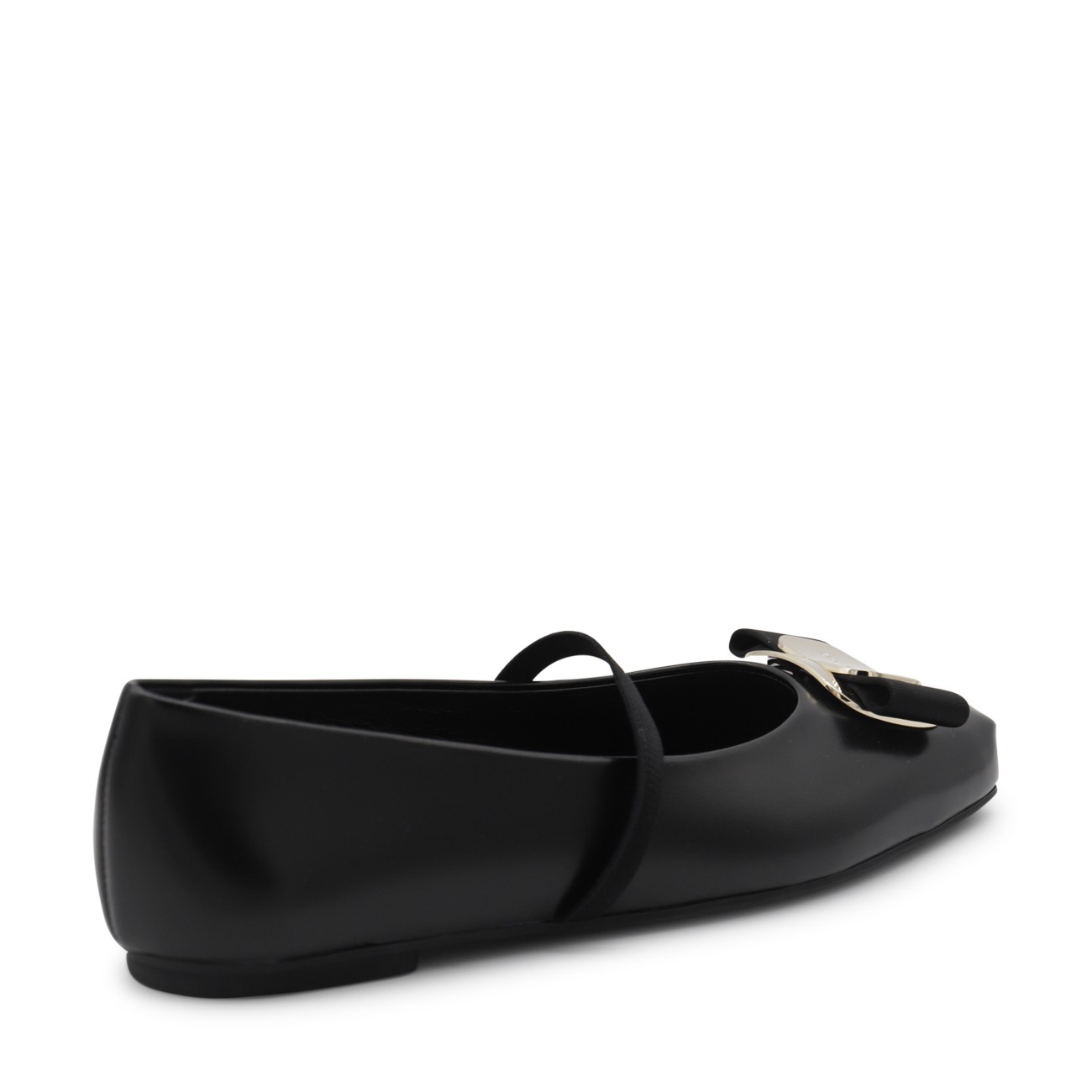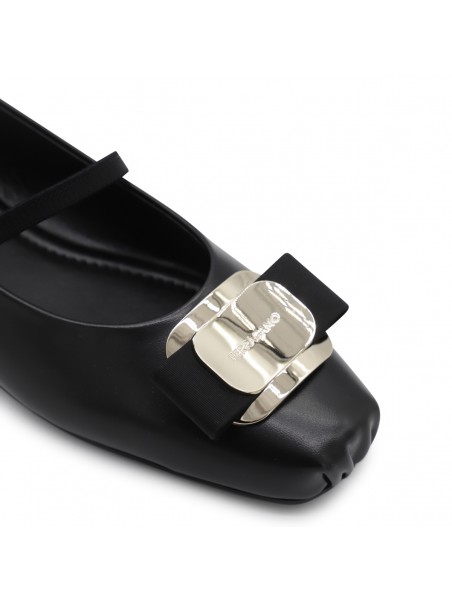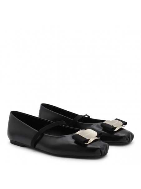Black leather flats from Ferragamo featuring round toe, frontal bow, leather sole and silver hardware.