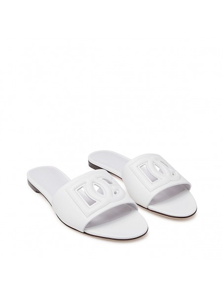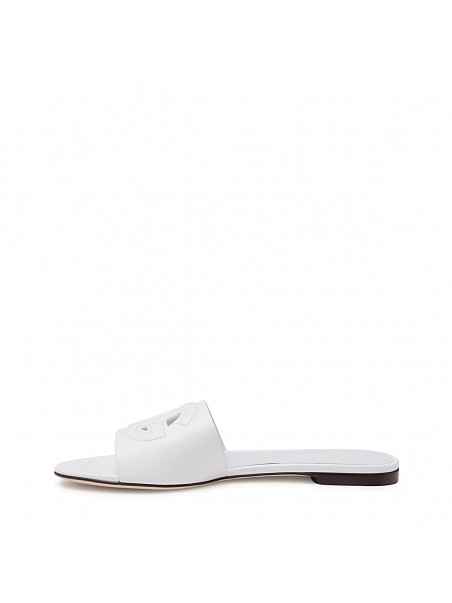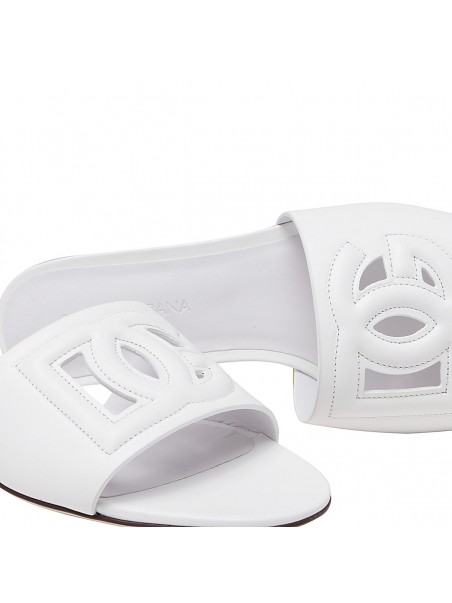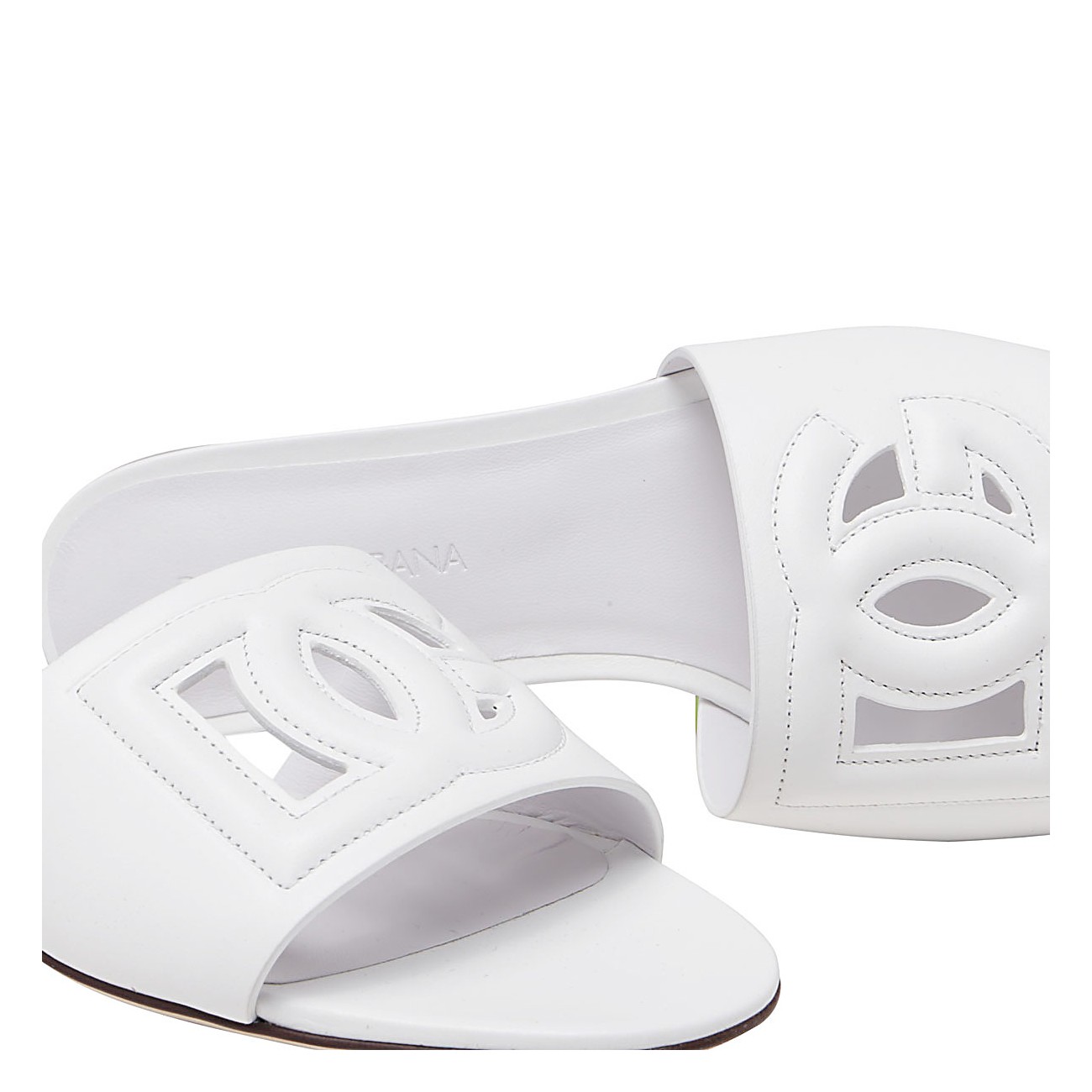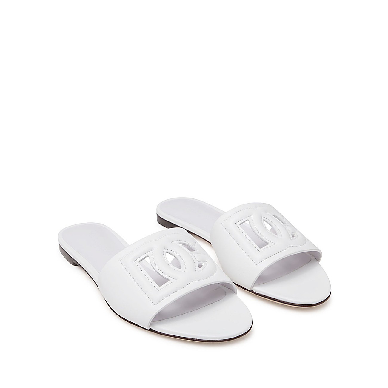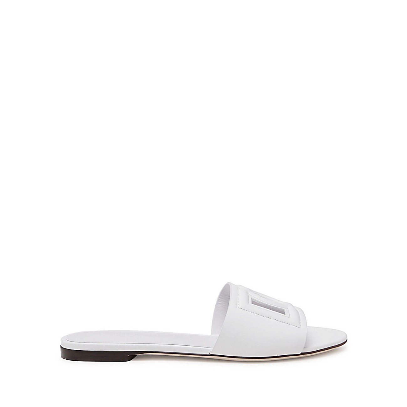 White leather DG Millennials slides from Dolce & Gabbana featuring embossed logo to the front, cut-out detailing, almond toe, branded insole and flat rubber sole.
