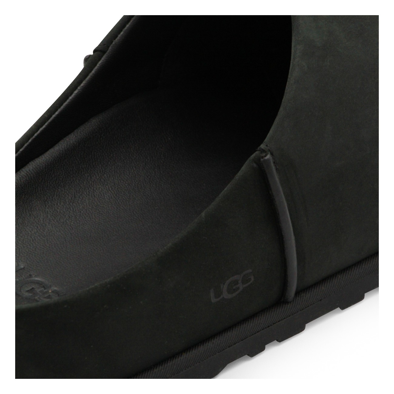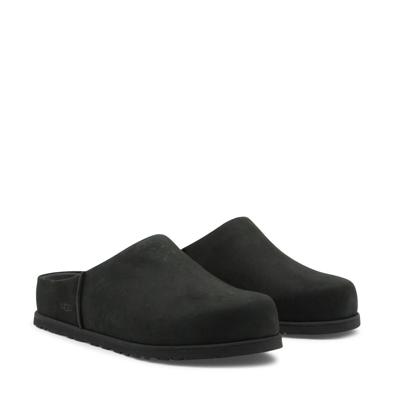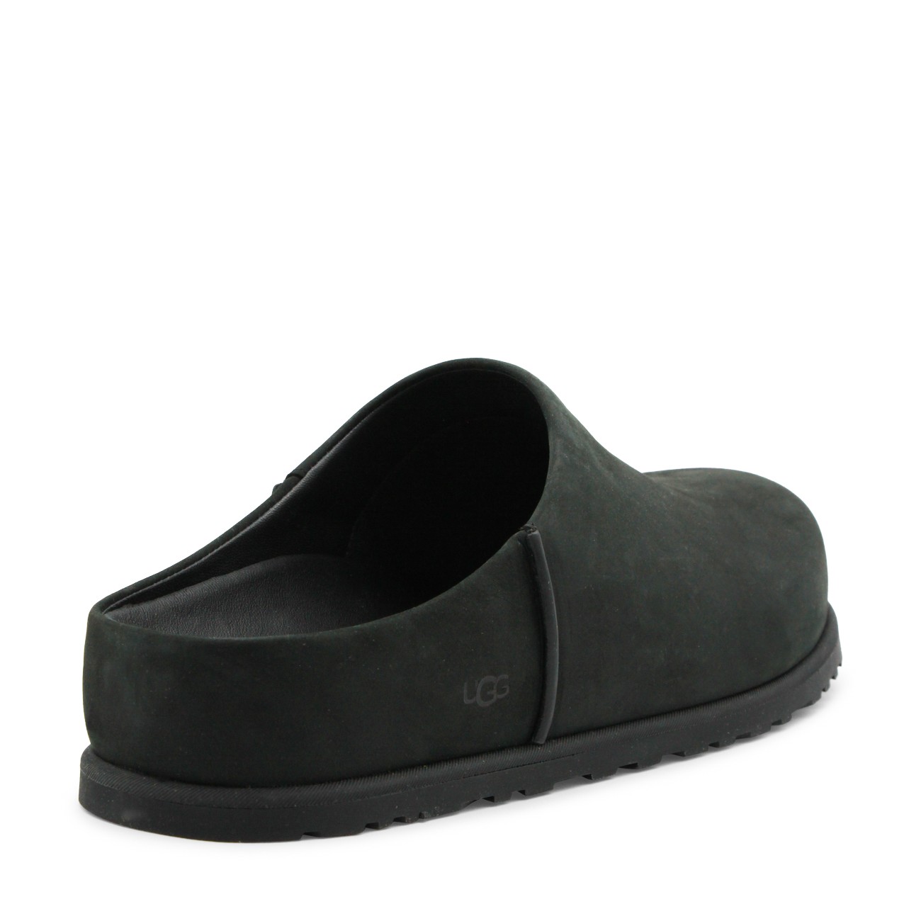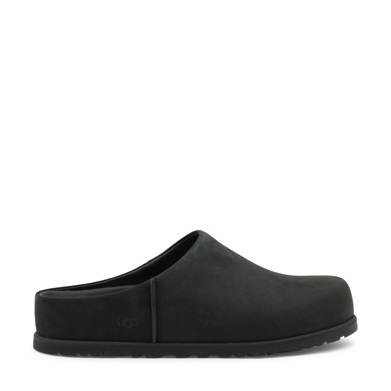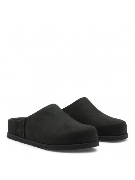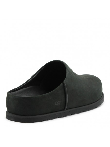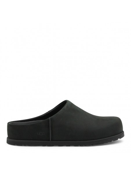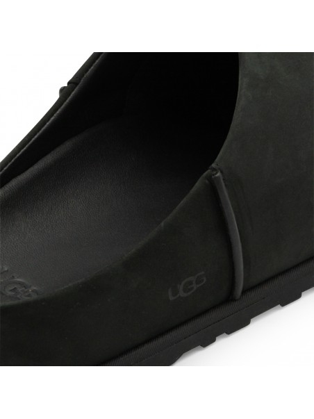 Black flats from Ugg featuring round toe, open back and leather sole.