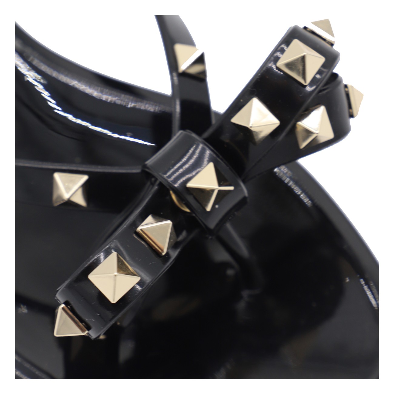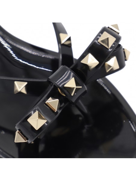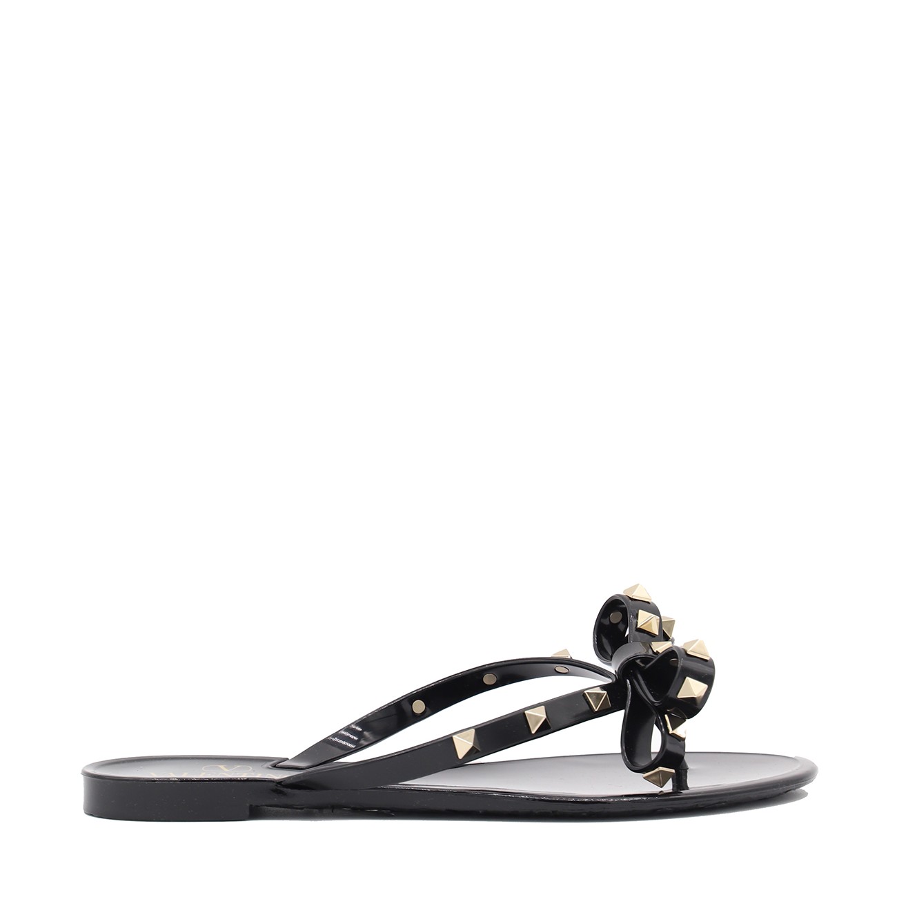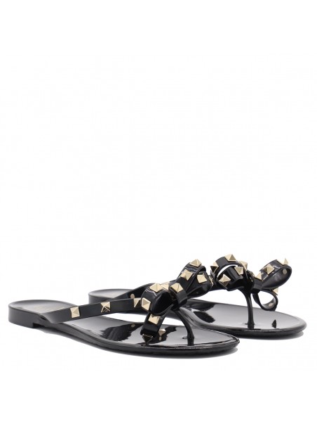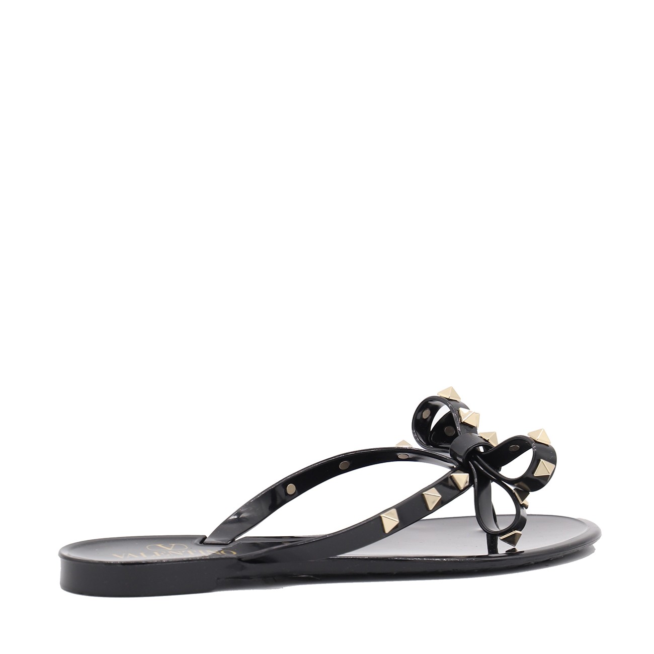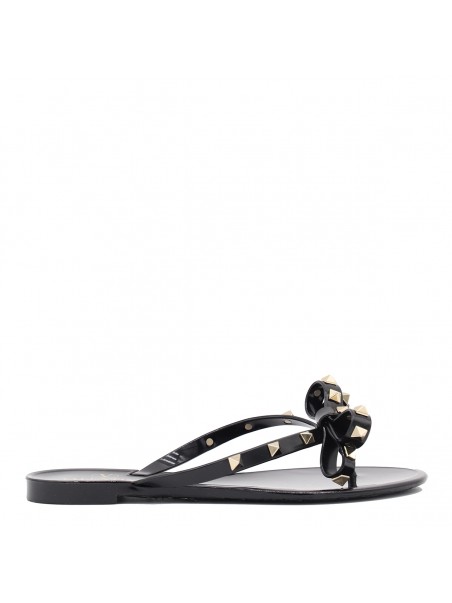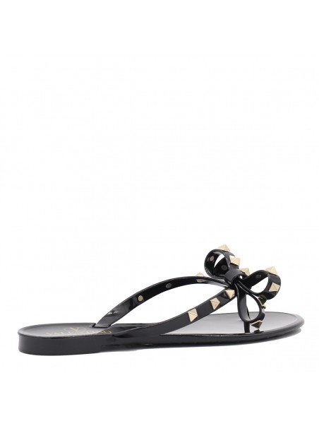 Black flats from Valentino Garavani featuring round open toe, frontal bow detail, gold tone studs and open back.