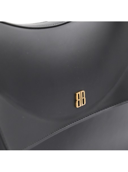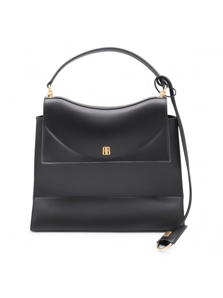 Black leather Nano M top handle bag from Balenciaga featuring top handle, frontal fastening, gold tone hardware, adjustable and removable strap and inside pocket.