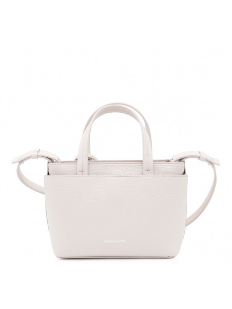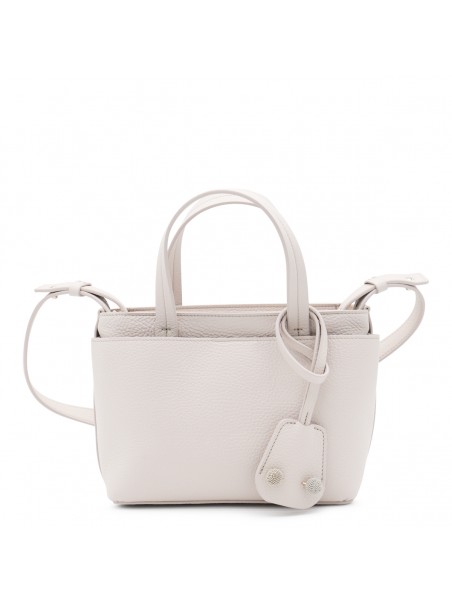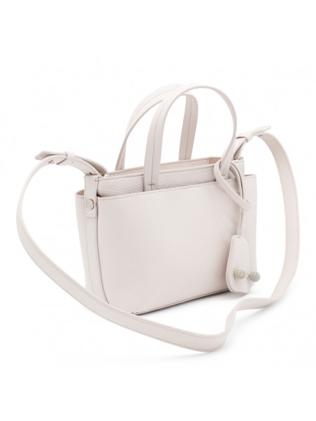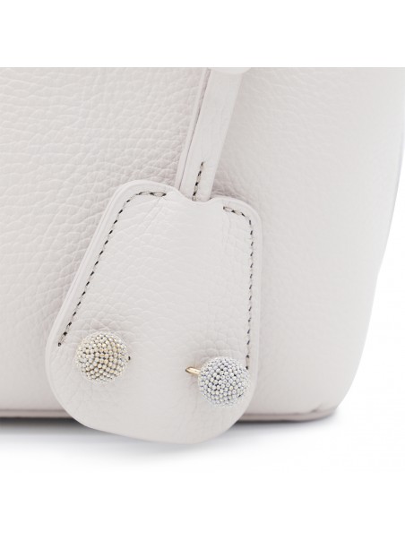 White leather top handle bag from Fabiana Filippi featuring top handles, adjustable shoulder strap, frontal logo, charms and comparments.