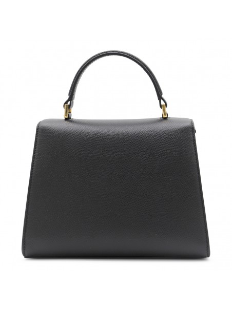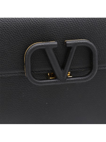 Black leather Vsling top handle bag from Valentino Garavani featuring top handle, chain-link adjustable shoulder strap, foldover top with magnetic closure, gold-tone metal hardware and main compartment.