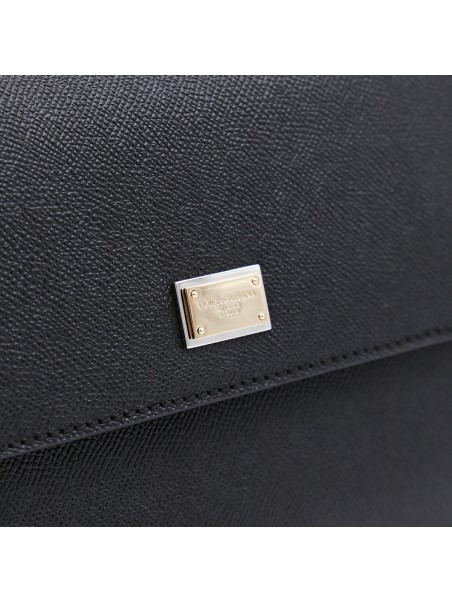 Black leather Sicily big top handle bag from Dolce & Gabbana featuring top handle, gold tone hardware, foldover top with magnetic closure, adjustable and removable shoulder strap, logo plaque, main compartment and internal zip pocket.
