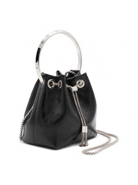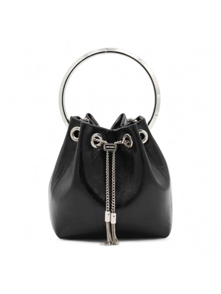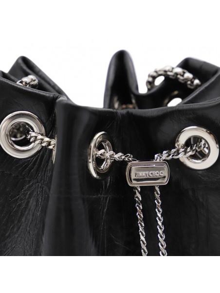 Black leather top handle bag from Jimmy Choo featuring top handle, chain-link shoulder strap, drawstring fastening and main compartment.