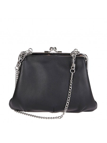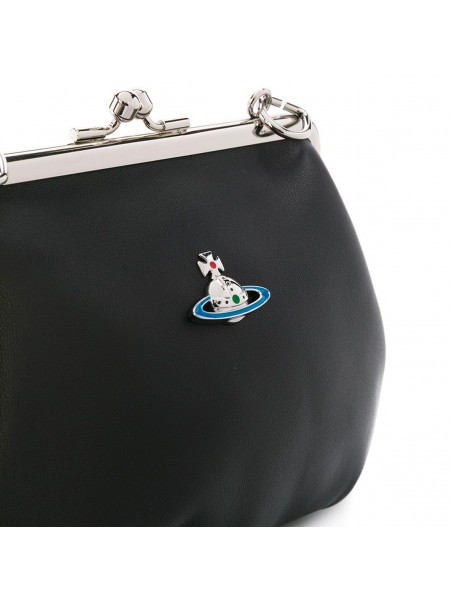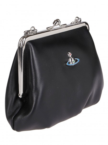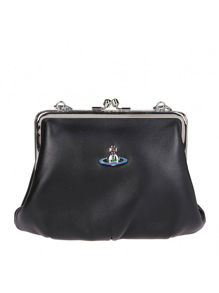 Black bag from Vivienne Westwood featuring on top clasp fastening, front logo plaque, internal zip pocket, chain-link removable shoulder strap, logo patch and grained texture.