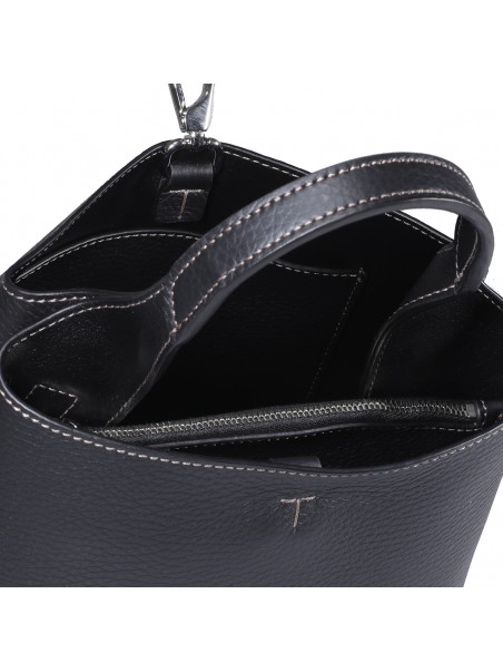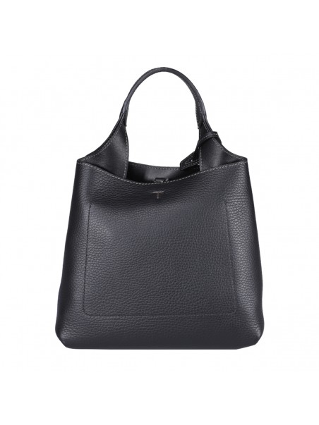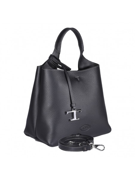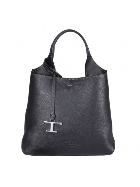 Black leather handle bag from Tod's featuring stamped logo on the front, removable pendant with metal T Timeless accessory, silver-tone hardware, closure with snap hook and metal ring, zipped internal flat pocket and branded bottom feet.