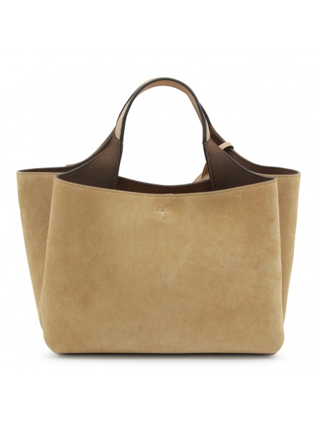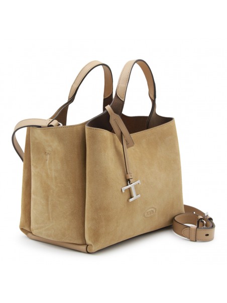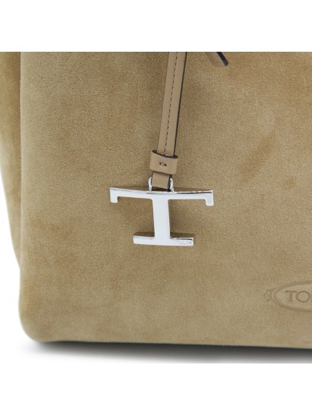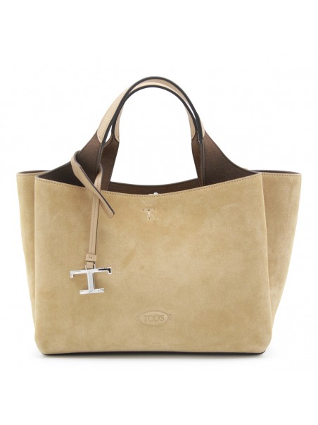 Beige suede leather top handle bag from Tod' featuring top handles, frontal silver tone logo, internal clasp fastening, adjustable shoulder strap and inside pocket.