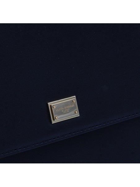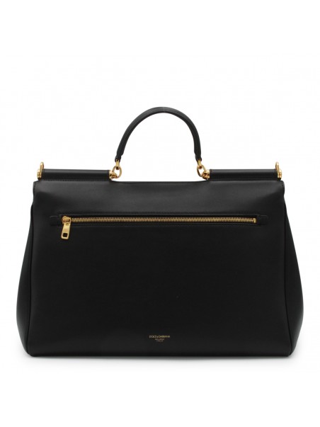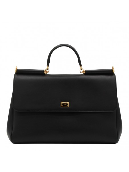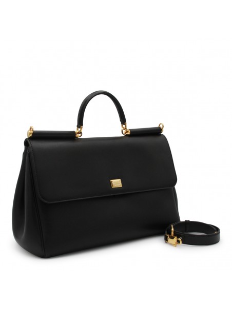 Black leather top handle bag from Dolce&Gabbana featuring top handle, frontal fastening, gold tone hardware, inside pocket and adjustable strap.