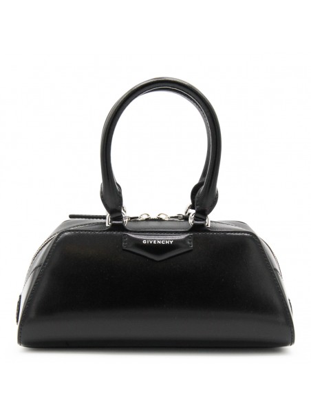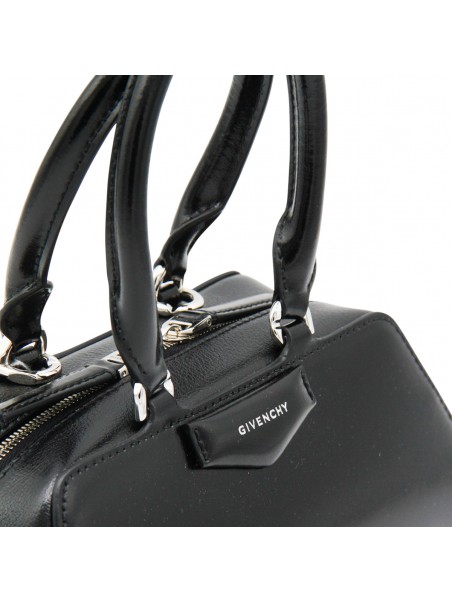 Black leather Antigona Cube mini top handle bag from Givenchy featuring top handles, silver tone hardware, patent finish, adjustable and removable shoulder strap, frontal logo and main compartment.