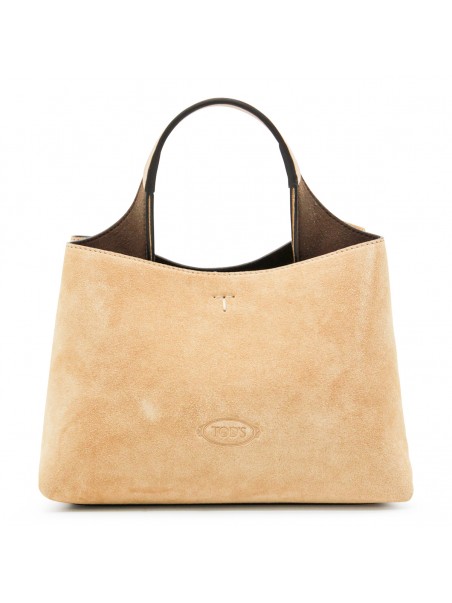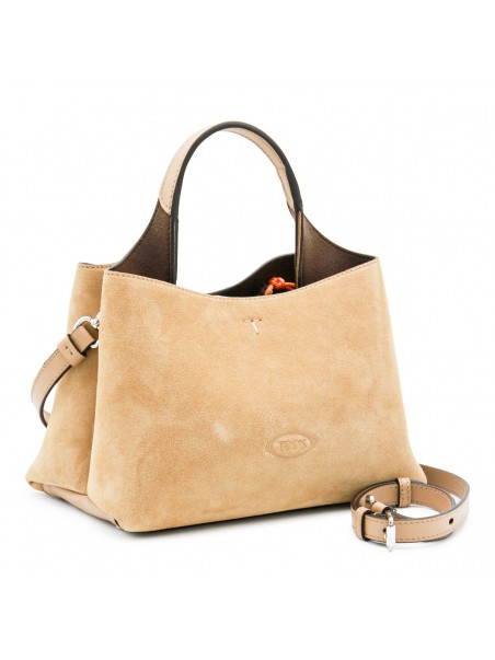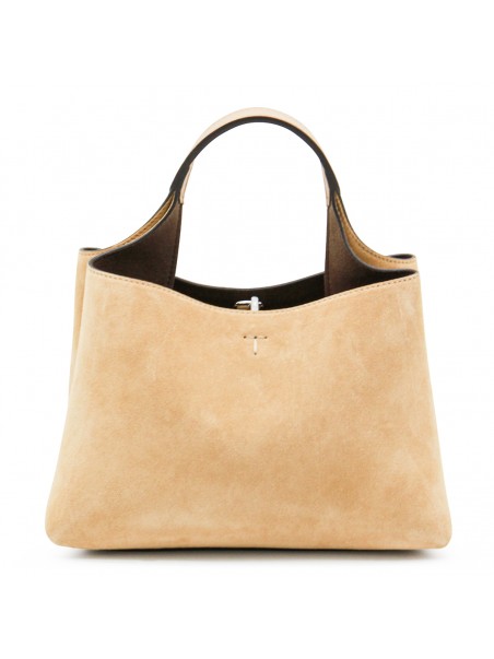 Beige suede top handle bag from Tod's featuring silver tone metal hardware, logo T chain, embossed logo at front, two compartments, zipped pocket and detachable shoulder strap.
