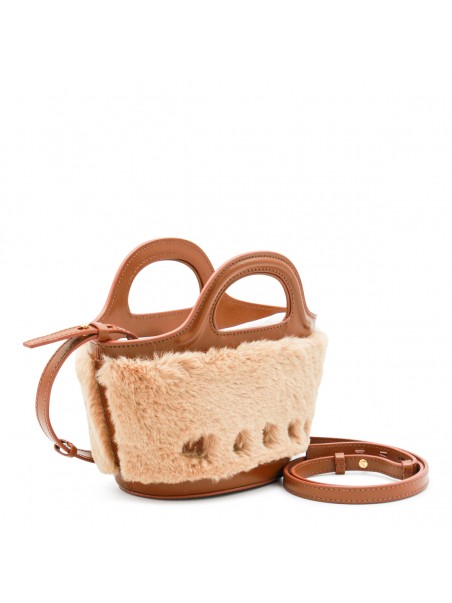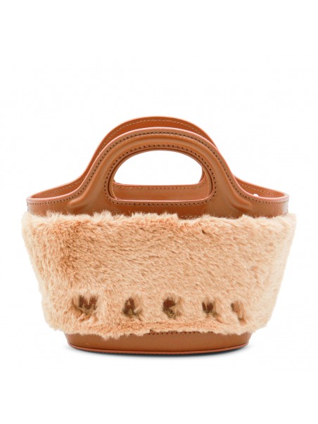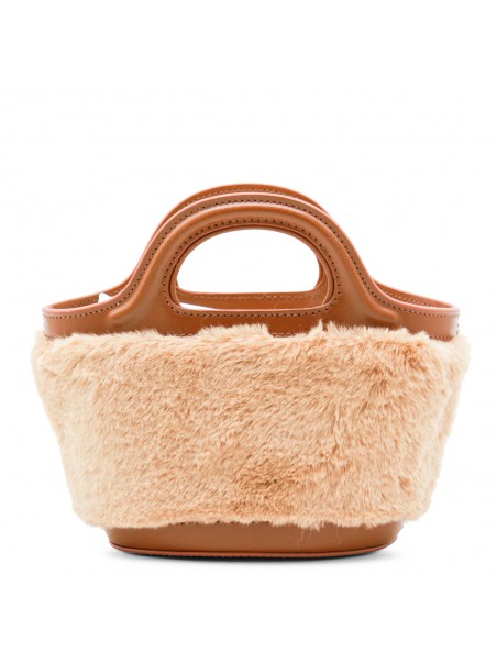Brown leather top handle bag from Marni featuring top handles, adjustable strap, frontal logo, hair detail and pocket.