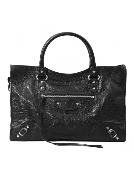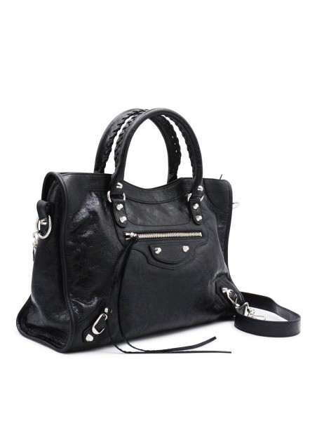 Black leather Le City medium top handle bag from Balenciaga featuring top handles, silver tone hardware, adjustable and removable shoulder strap, zip fastening, front zip pocket, main compartment and internal zip pocket.