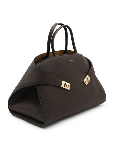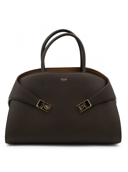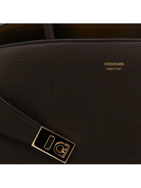 Dark brown leather Hug M top handle bag from Ferragamo featuring top handles, upper fastening, frontal logo, gold tone hardware and inside pocket.