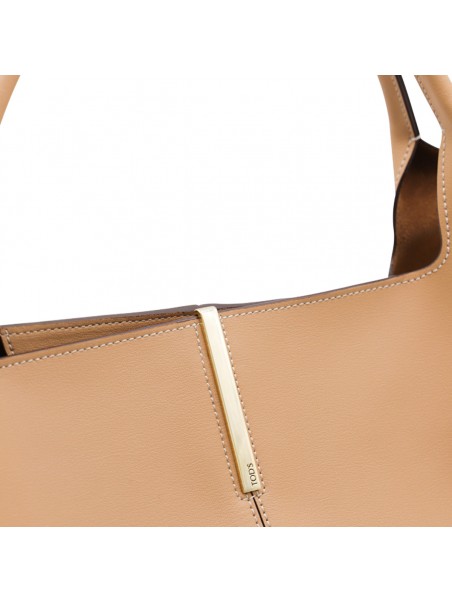 Camel leather top handle bag from Tod's featuring top handle, upper fastening, pocket and frontal zip detail.