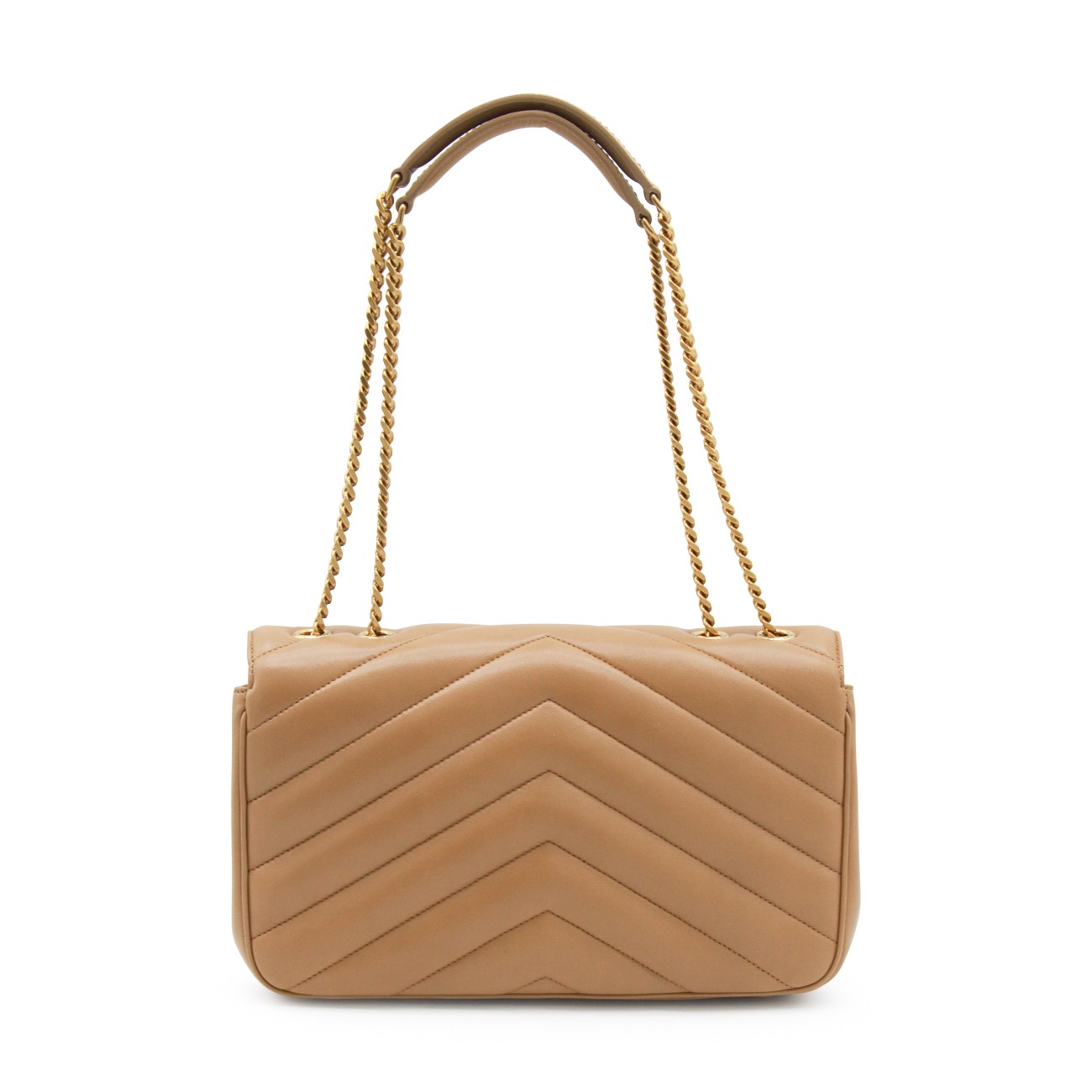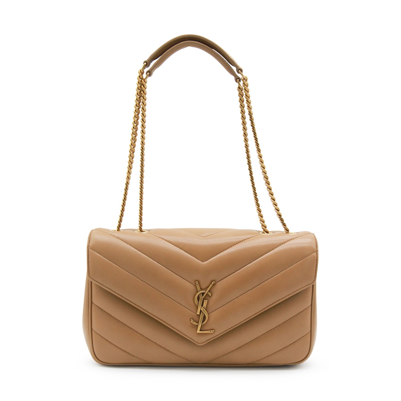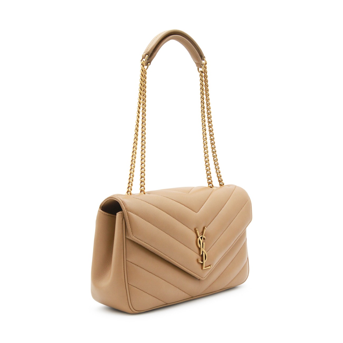 Beige medium Lou Lou top handle bag from Saint Laurent featuring frontal fastening, gold tone hardware, frontal logo and inside pocket.