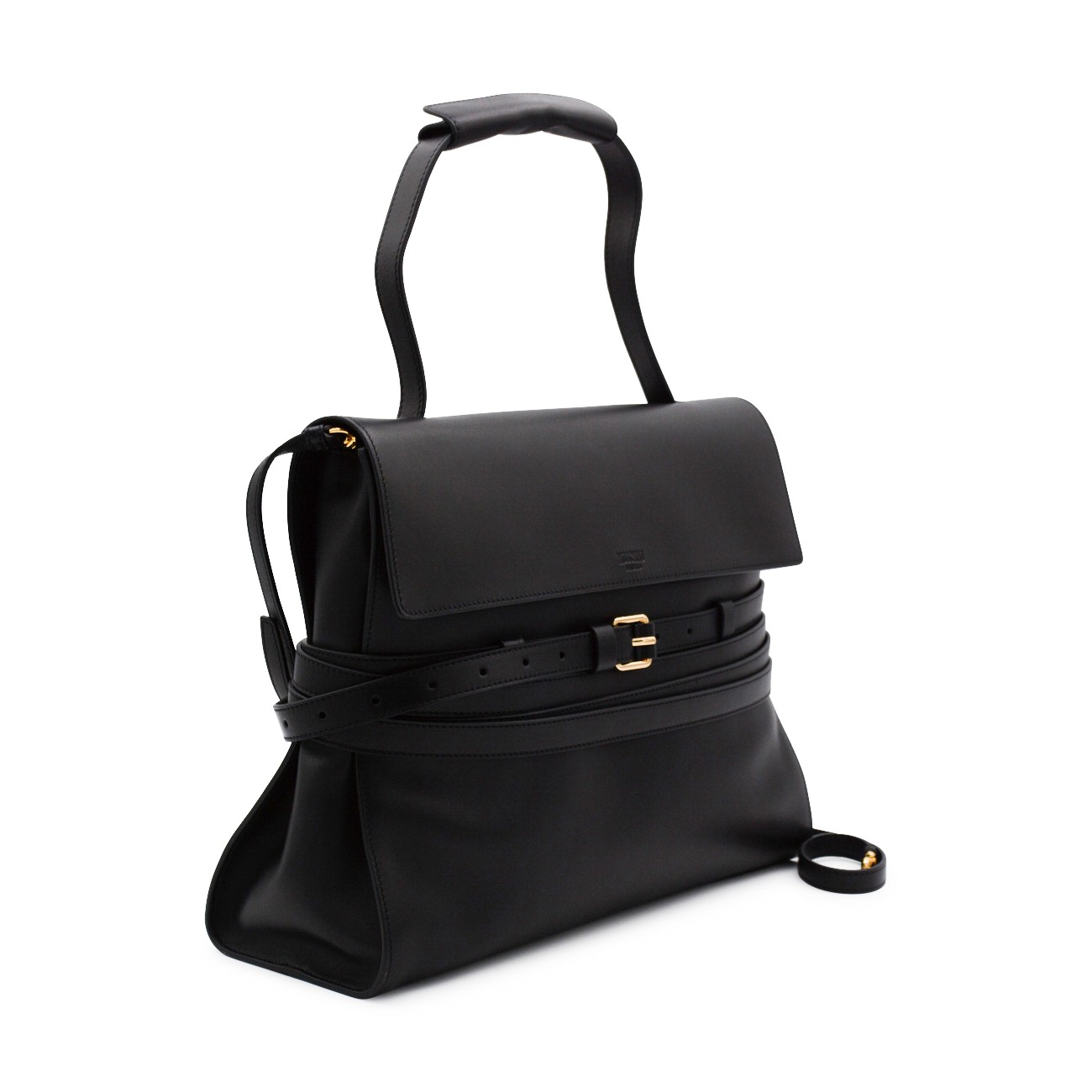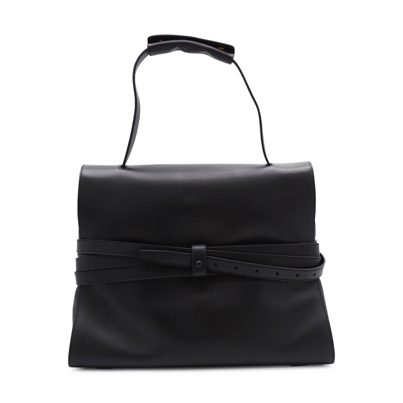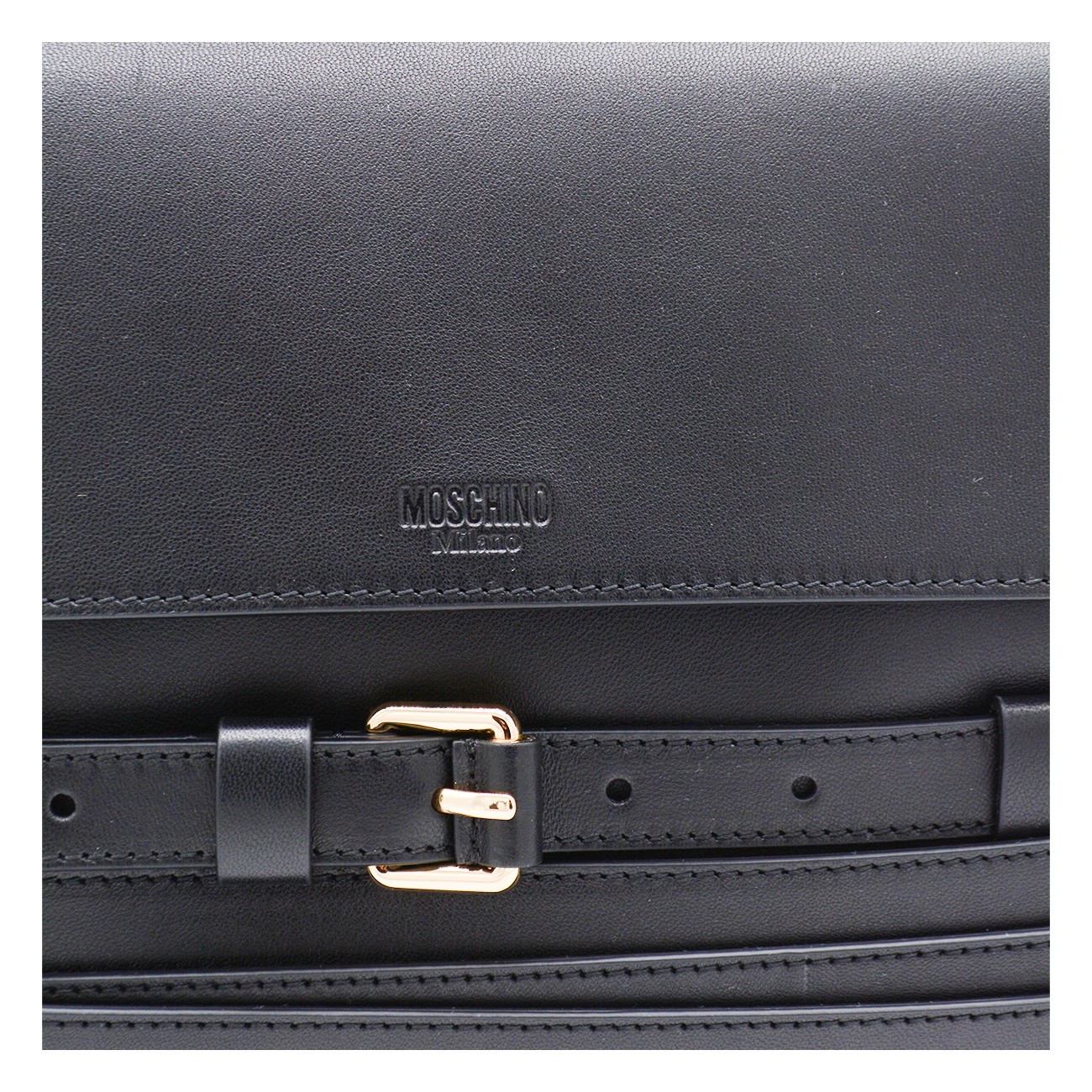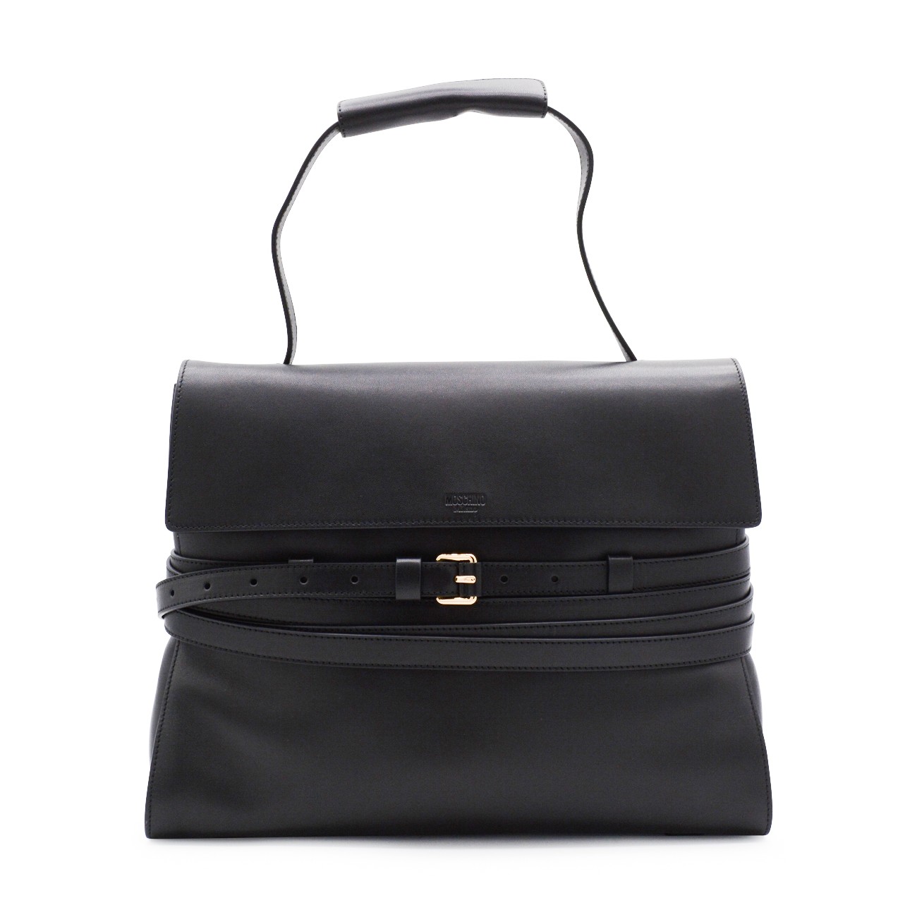 Black leather top handle bag from Moschino featuring top handle, leather laces, buckle fastening and inside pocket.