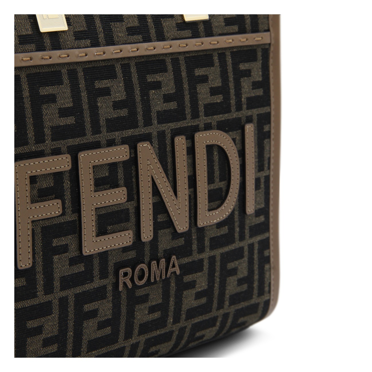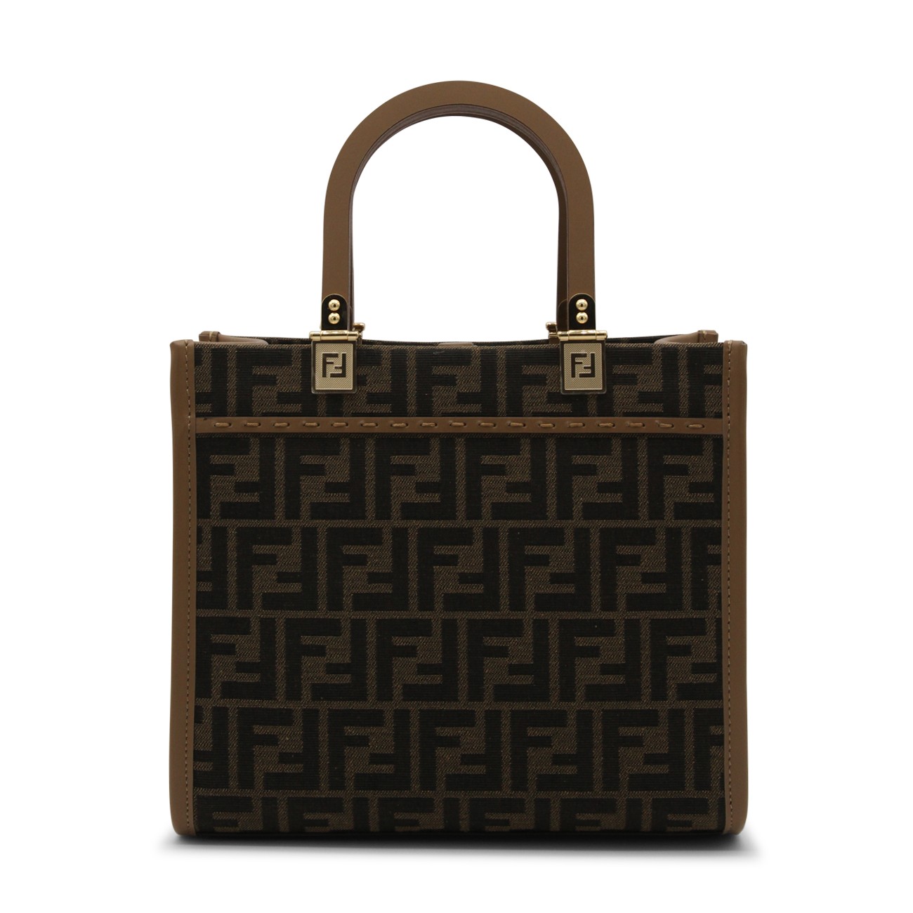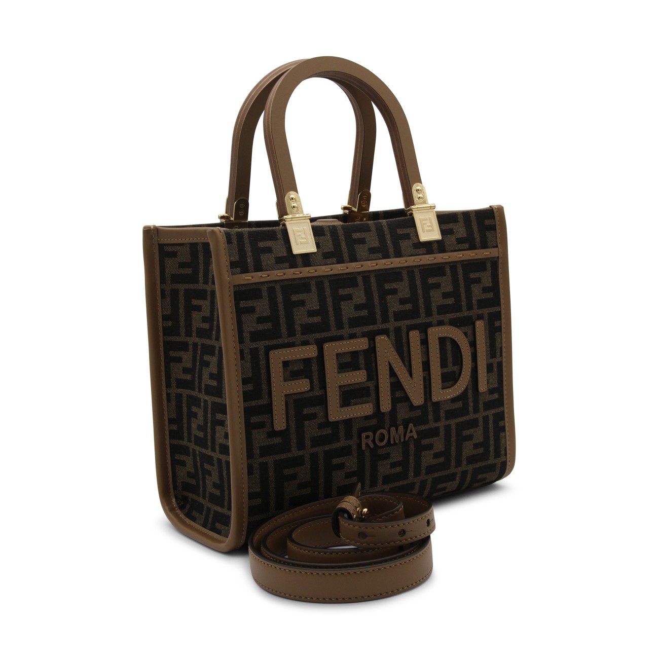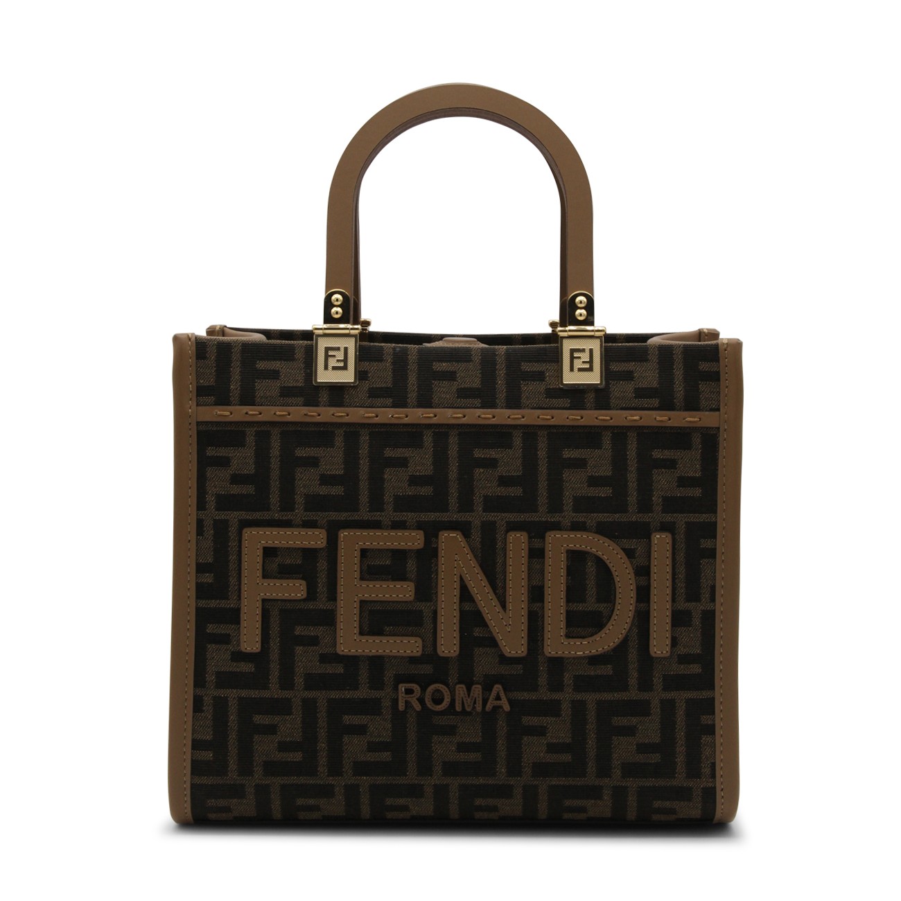 Brown leather Sunshine medium tote bag from Fendi featuring "FENDI ROMA" hot stamping, rigid plexiglass handles, all over logo motif, gold tone metal finishes and adjustble and detachable leather shoulder strap.