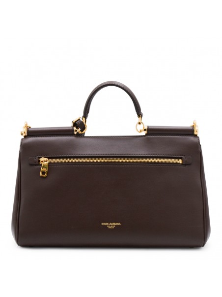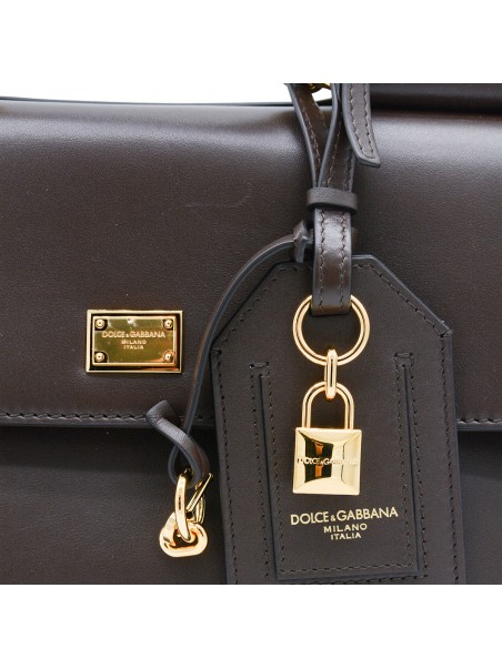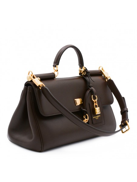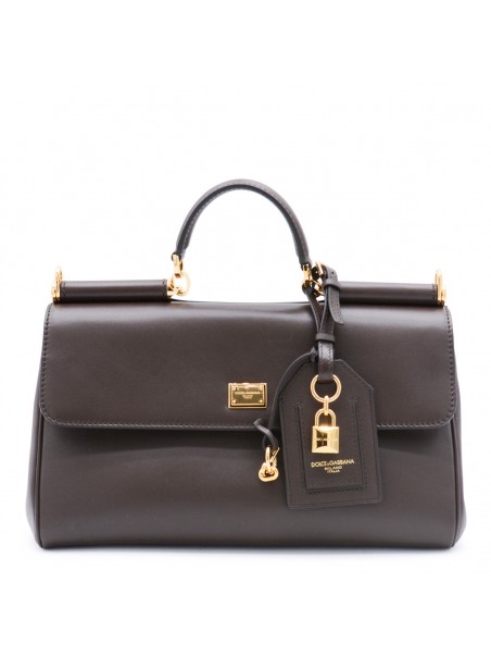 dark brown leather My Sicily to handle bag from Dolce & Gabbana featuring top handle, removable and adjustable leather shoulder strap, tuck-in closure, branded pendant, gold tone metal hardware, main compartment and internal pockets.
