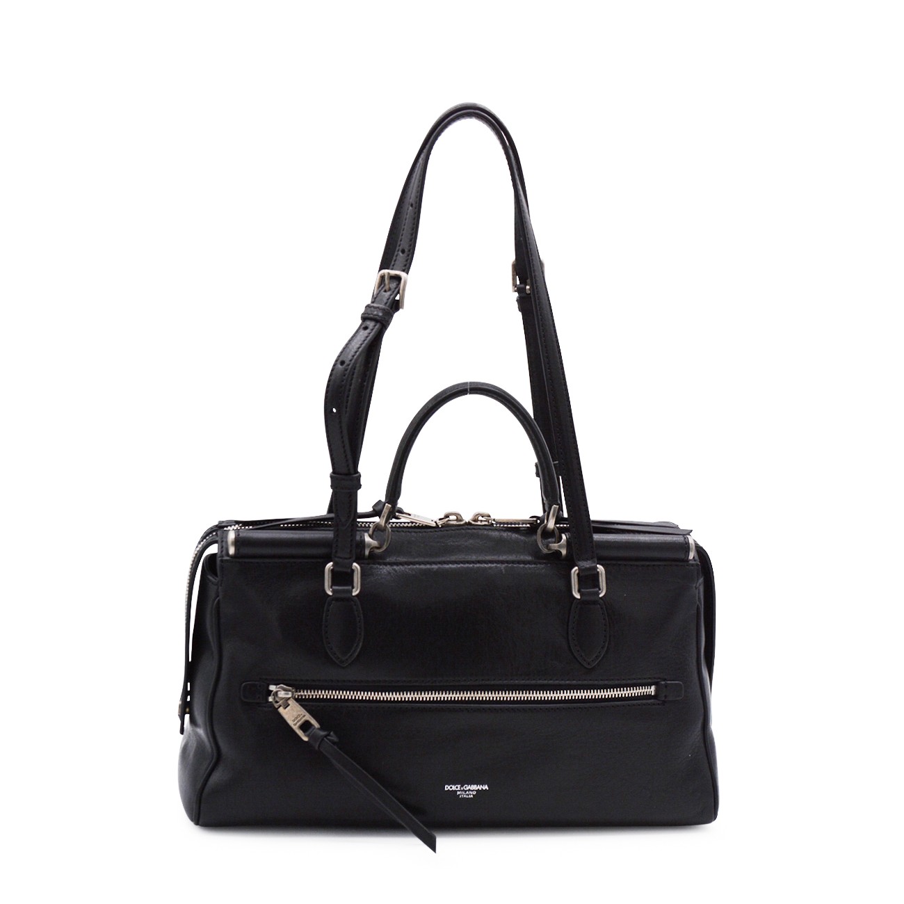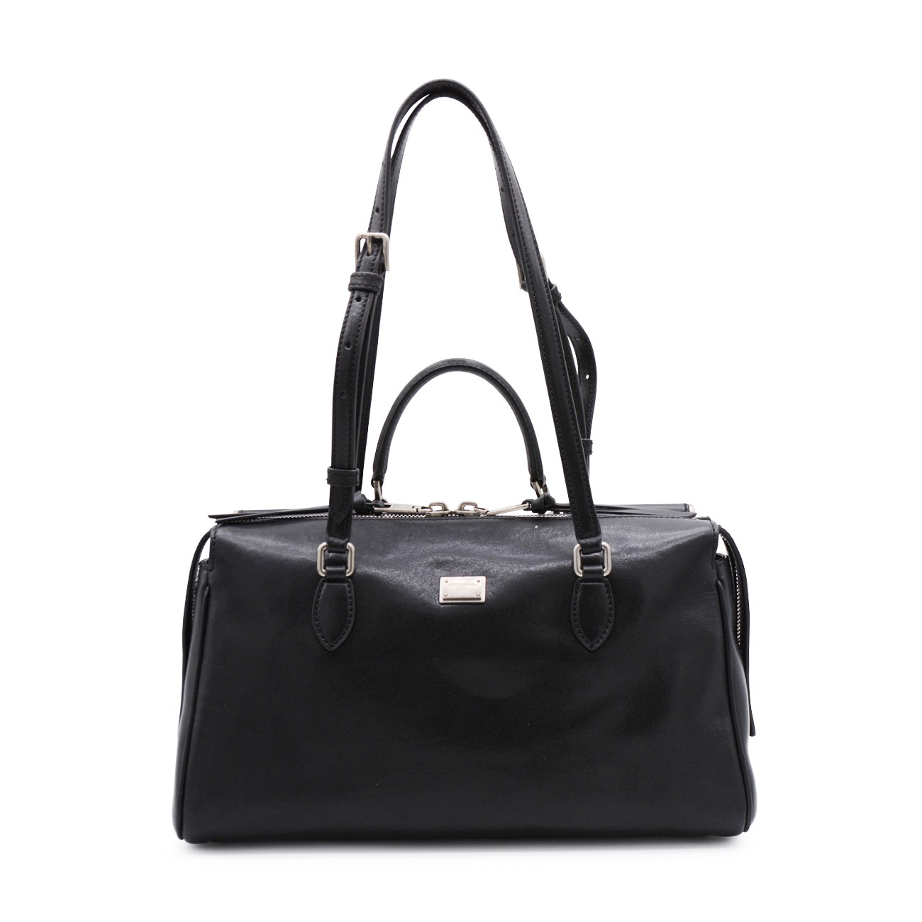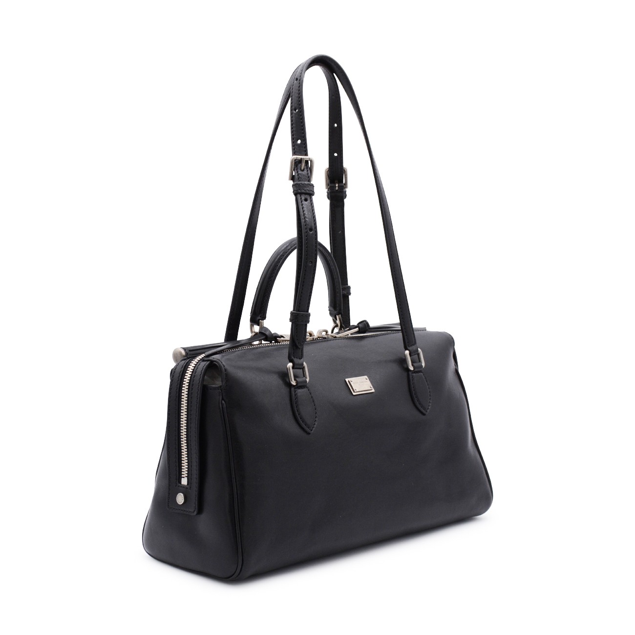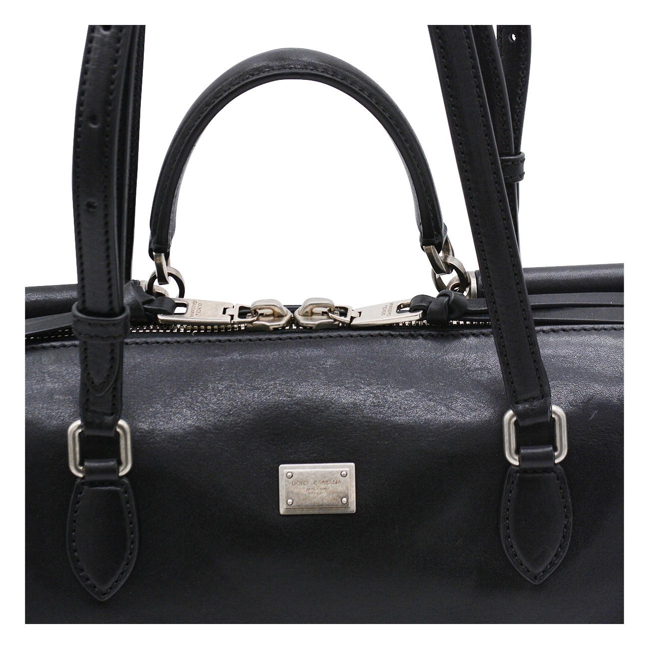 Black leather Vittoria top handle bag from Dolce & Gabbana featuring leather handle, frontalo logo plaque, zip fastening, main compartment and internal pockets.