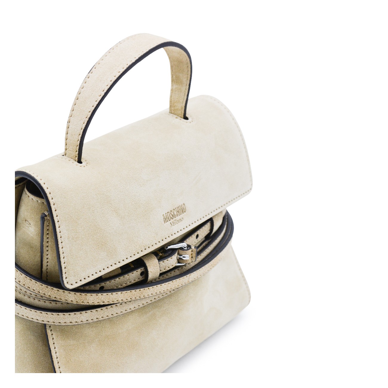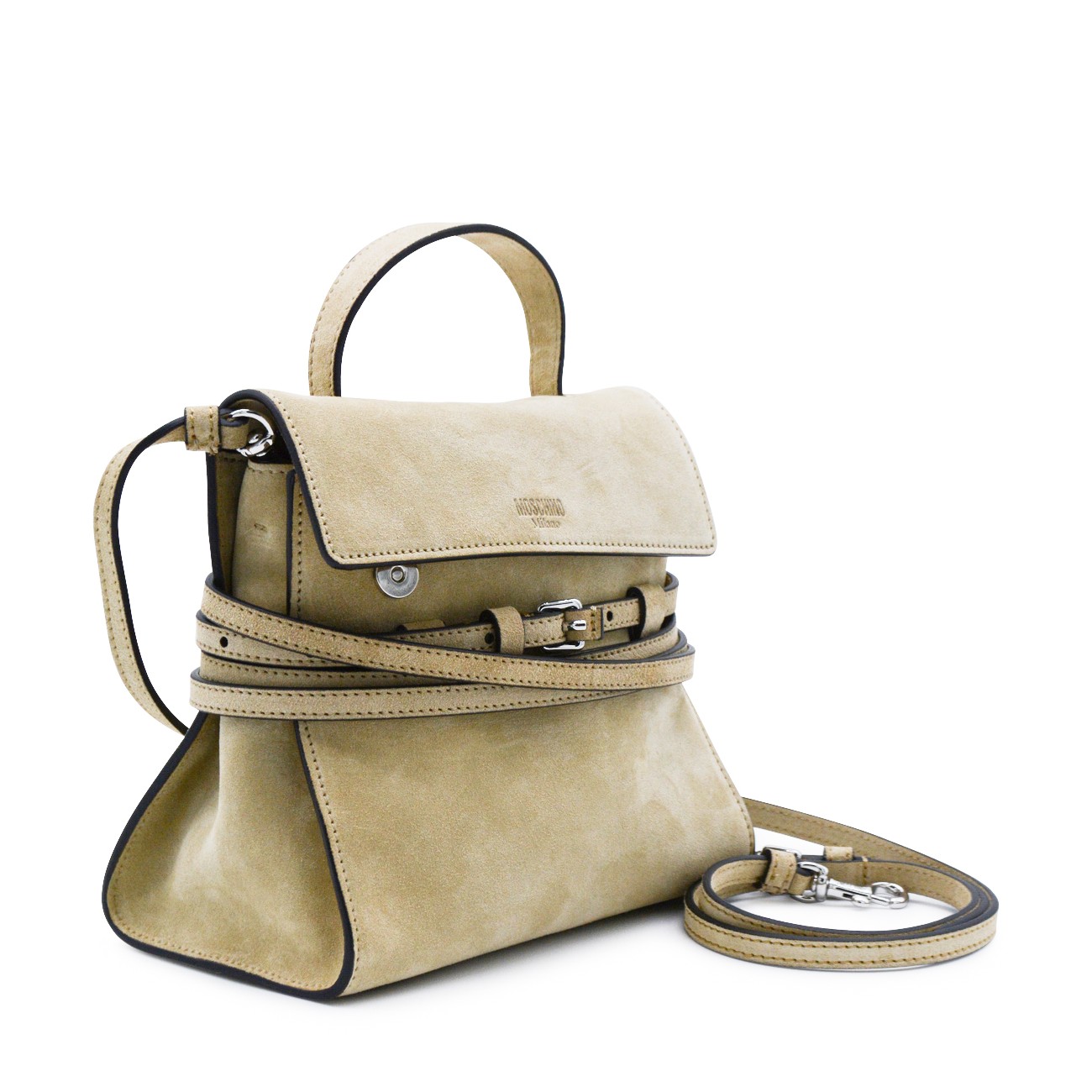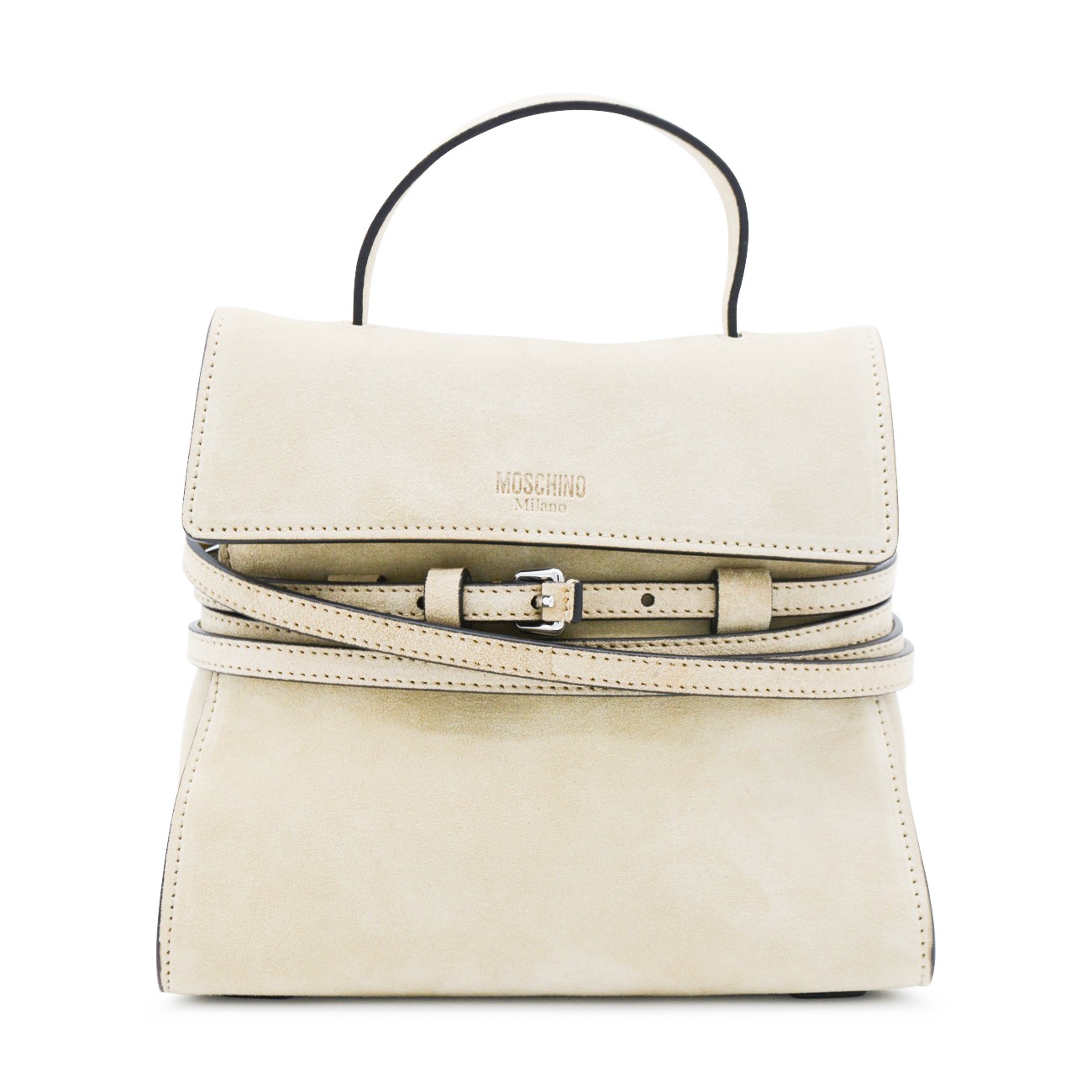 Light beige leather top handle bag from Moschino featuring top handle, buckled laces detailing, logo, foldover top closure and main compartment.