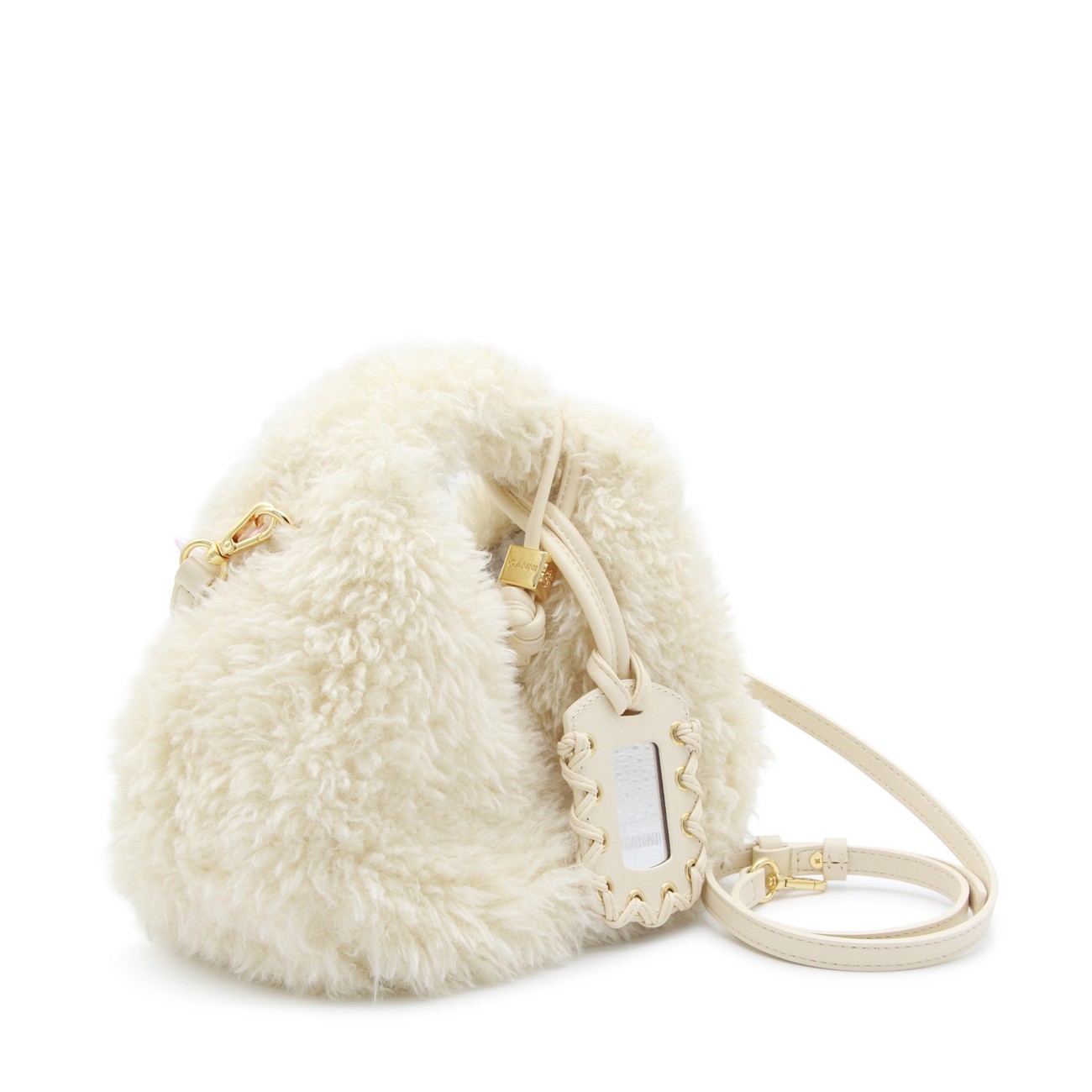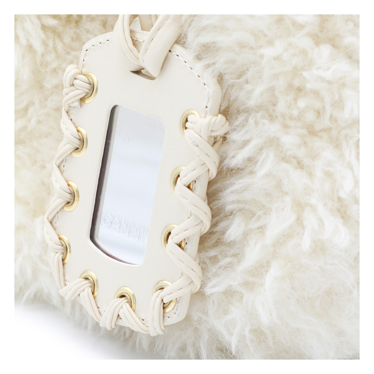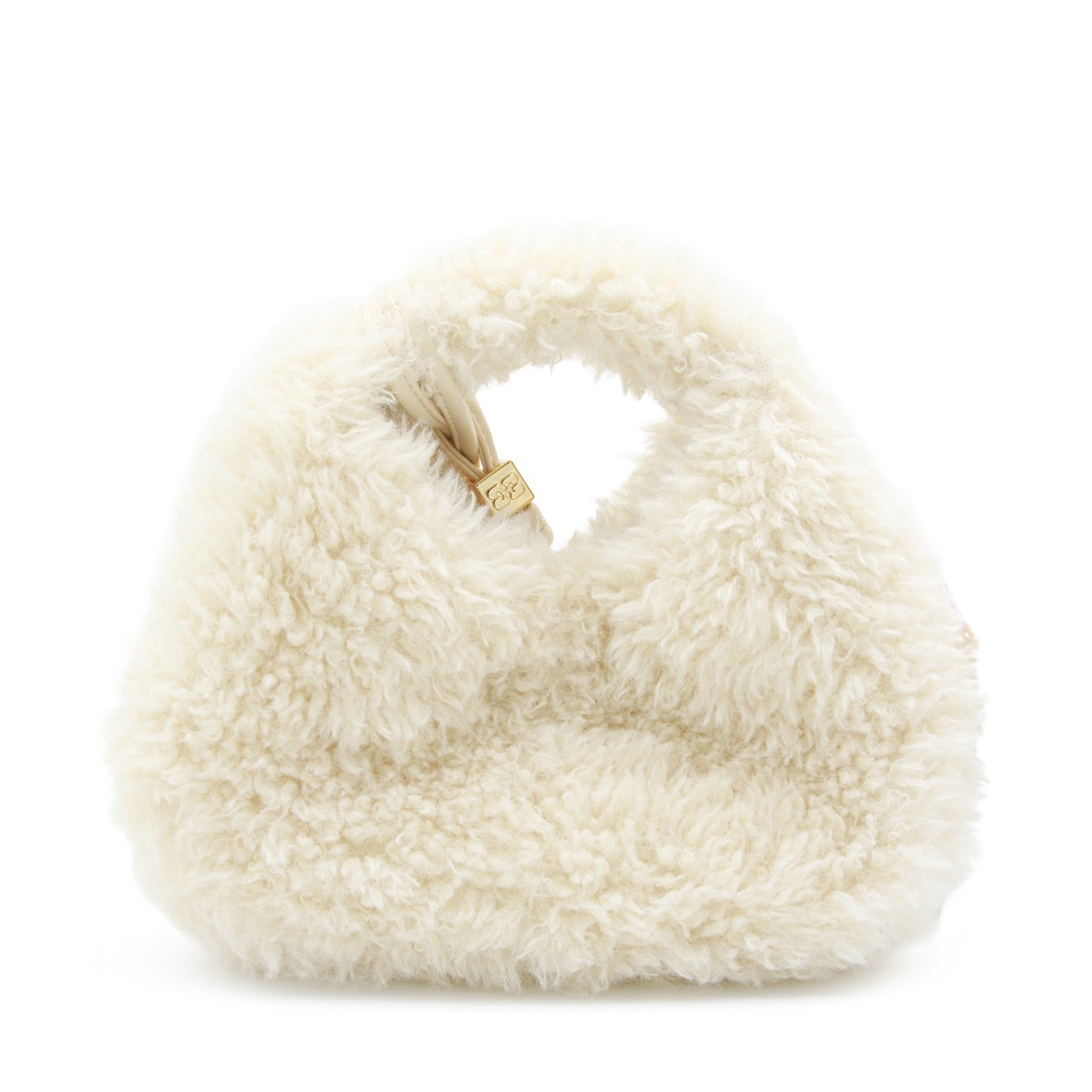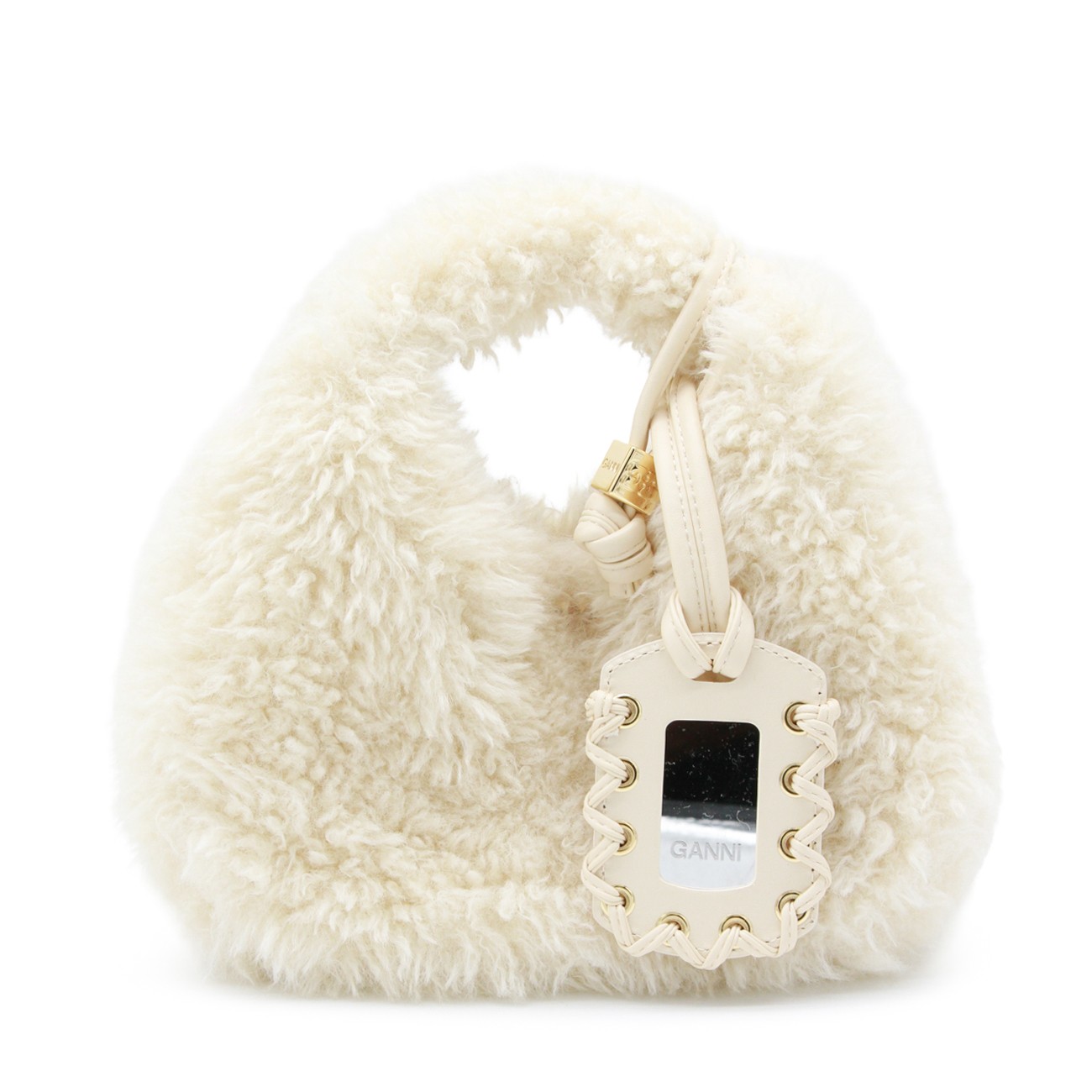 White Hobo Mini top handle bag from Ganni featuring all-over faux-fur, single handle, mirror pendant, removable shoulder strap and main compartment.