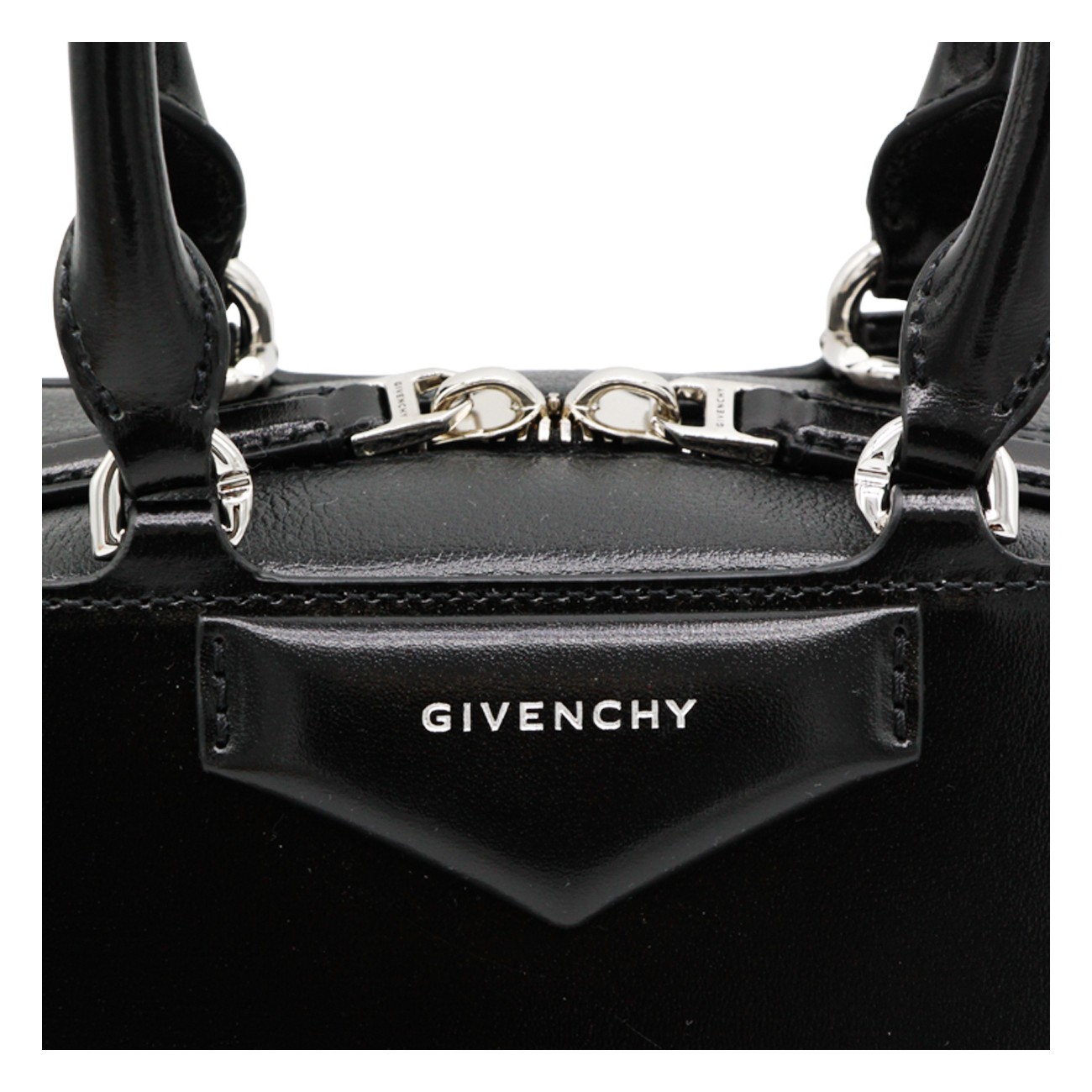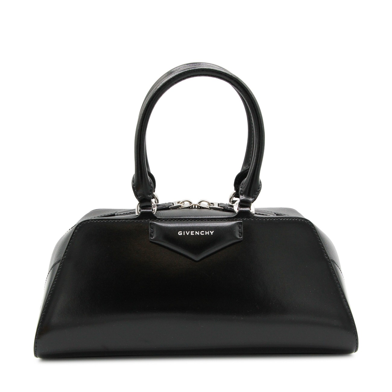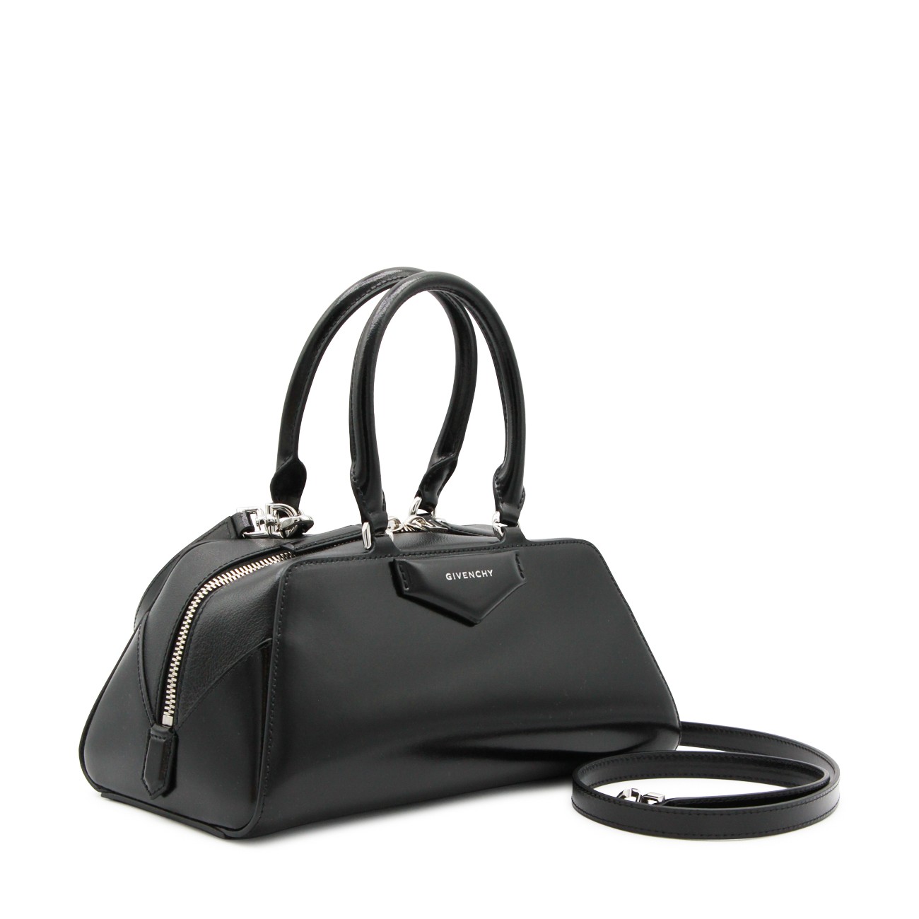 Black leather Antigona East-West top handle bag from Givenchy featuring top handle, adjustable and removable shoulder strap, double zip fastening and main compartment.