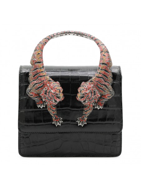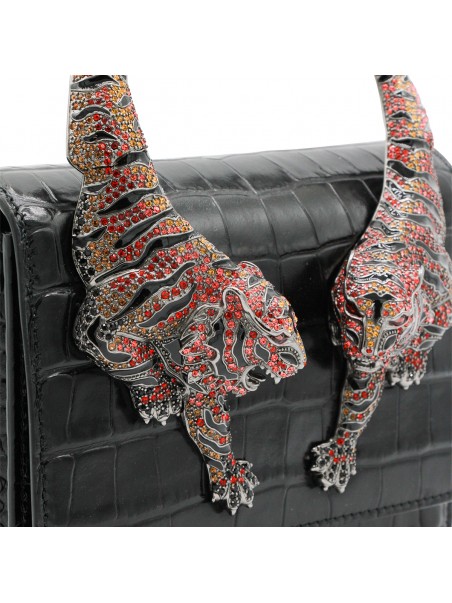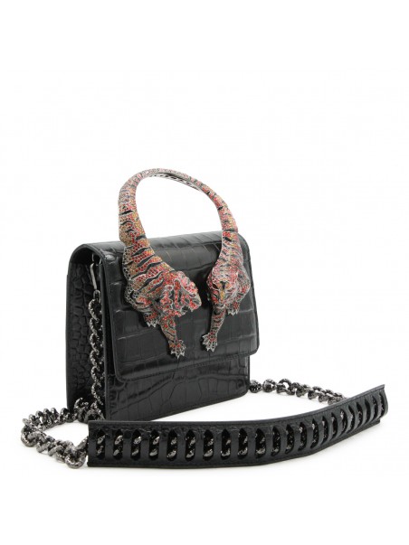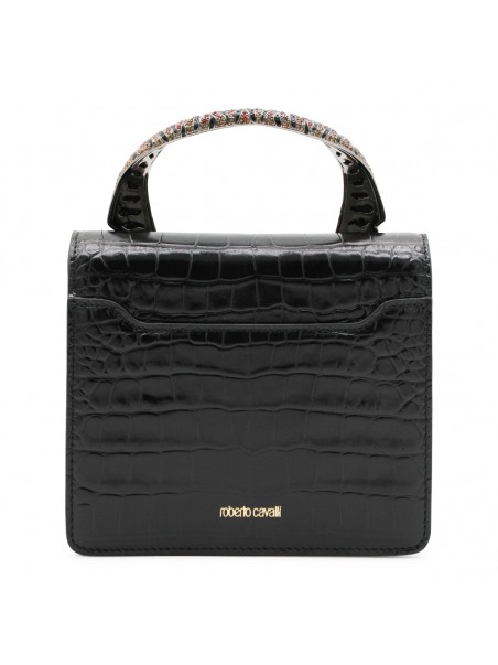 Black leather top handle bag from Roberto Cavalli featuring top handle, multicolor hardware, chain-link strap, frontal fastening and pocket.