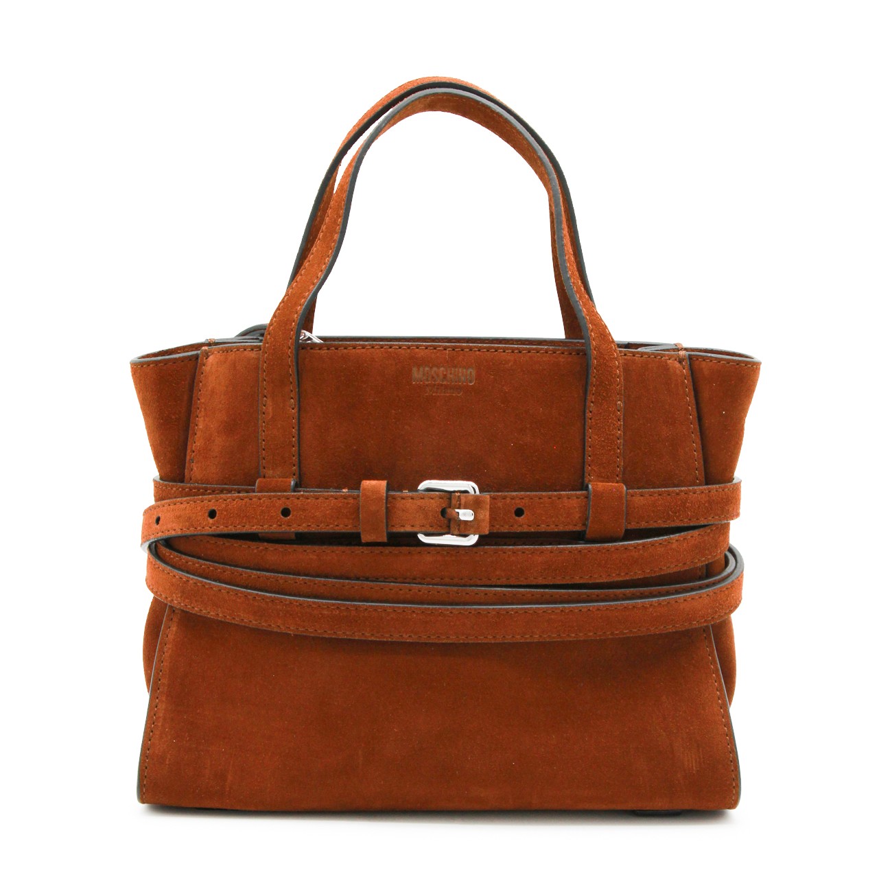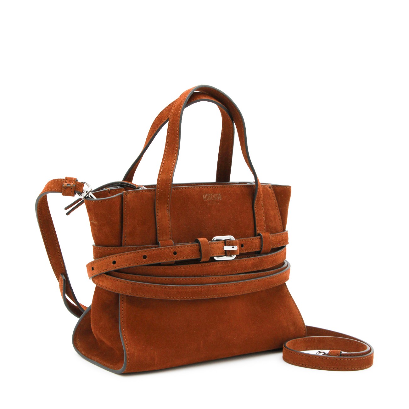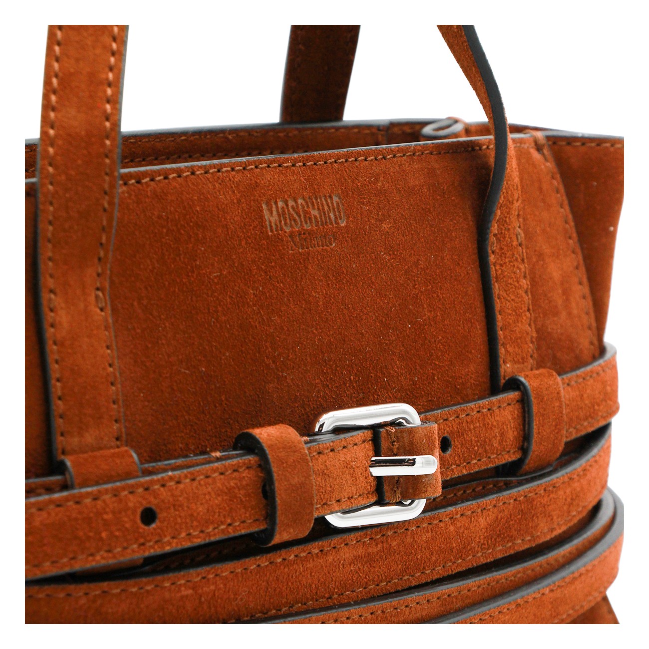 Brown leather Tie Me top handle bag from Moschino featuring top handles, adjustable strap, buckle details, magnetic closure and main compartment.