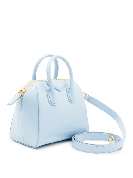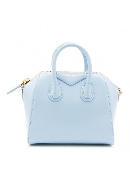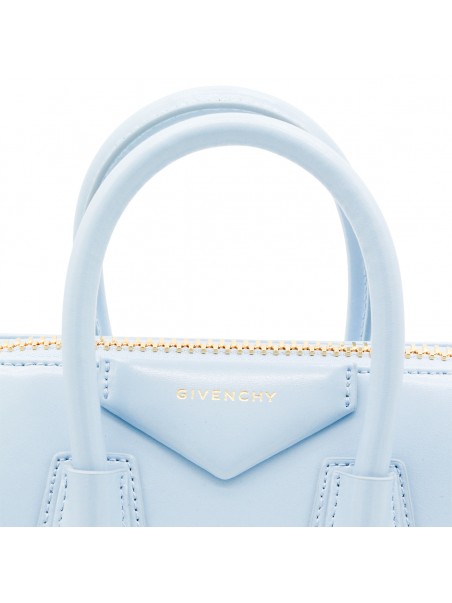 Light blue leather Antigona top handle bag from Givenchy featuring top handles, zip fastening, inside pocket and frontal logo.
