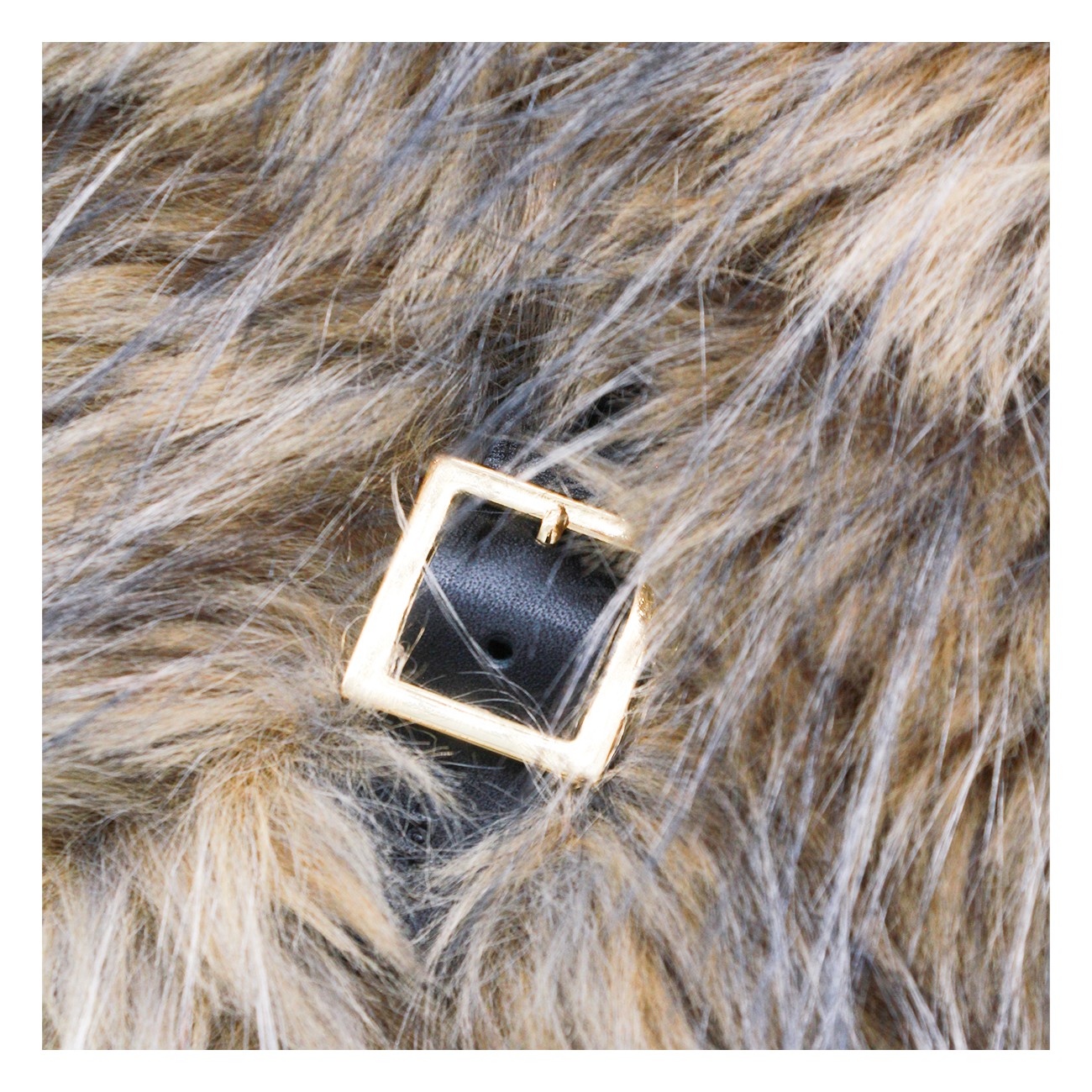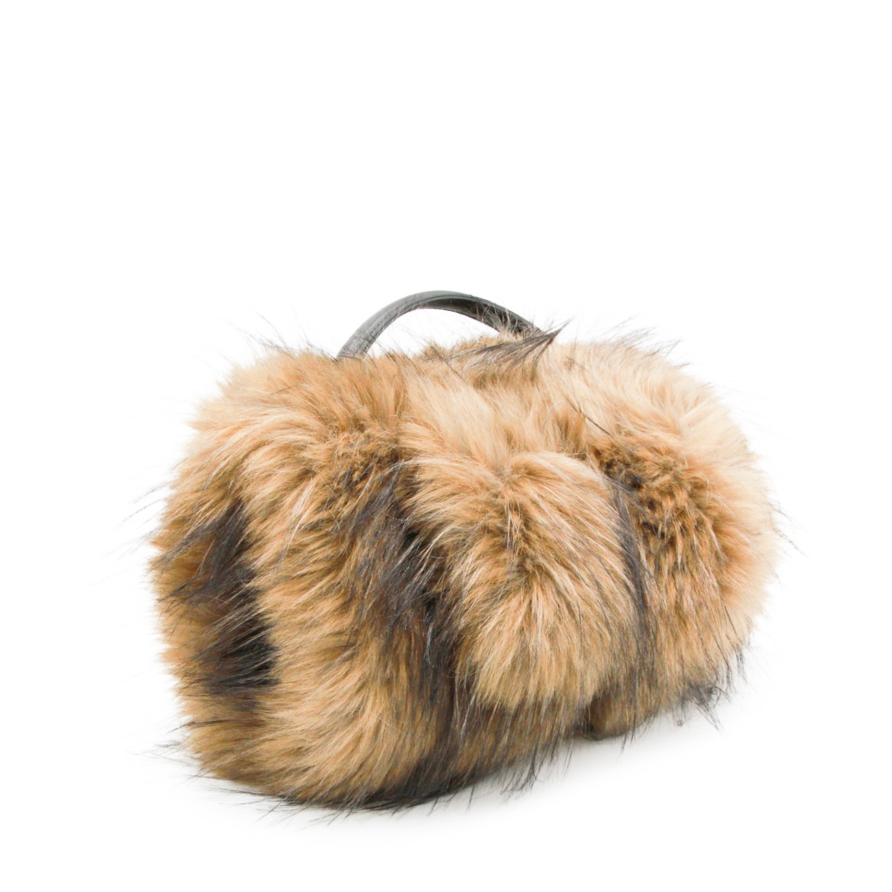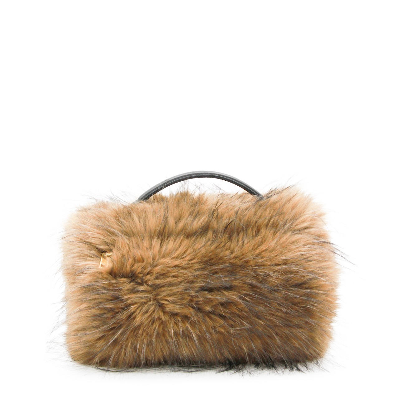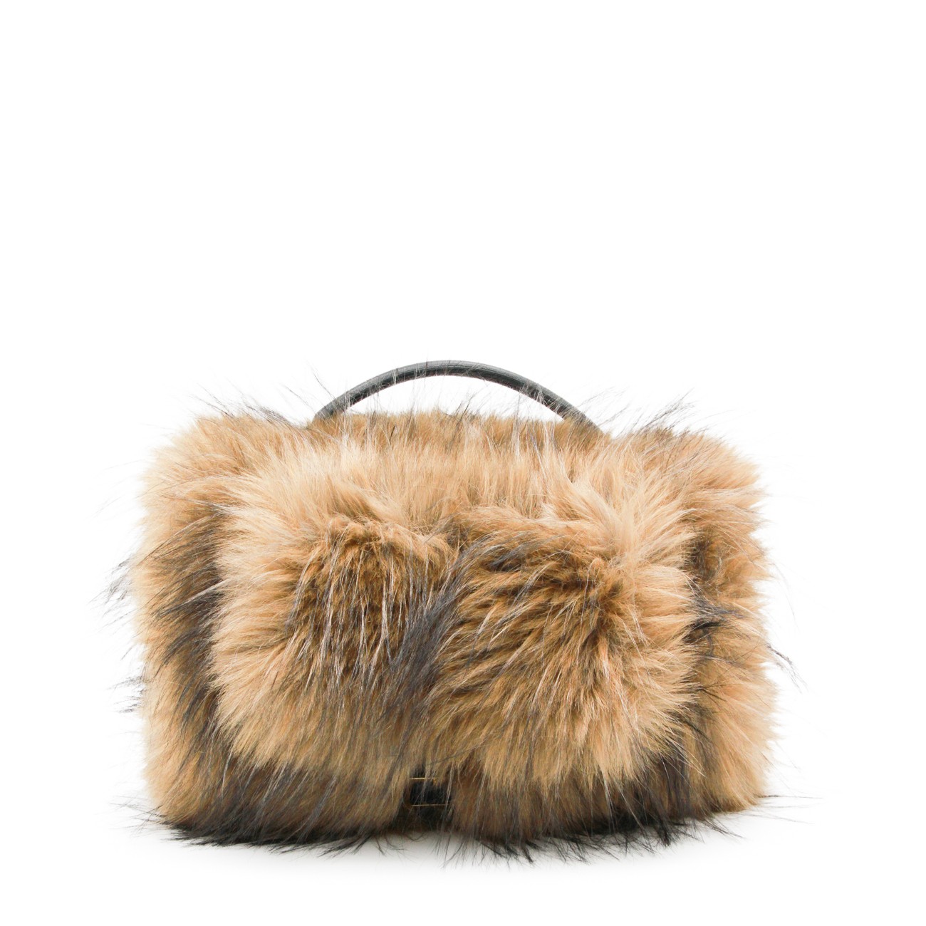 Beige faux fur bag from Sacai featuring single top handle, foldover top with closure and main compartment.