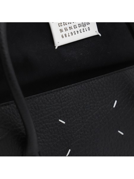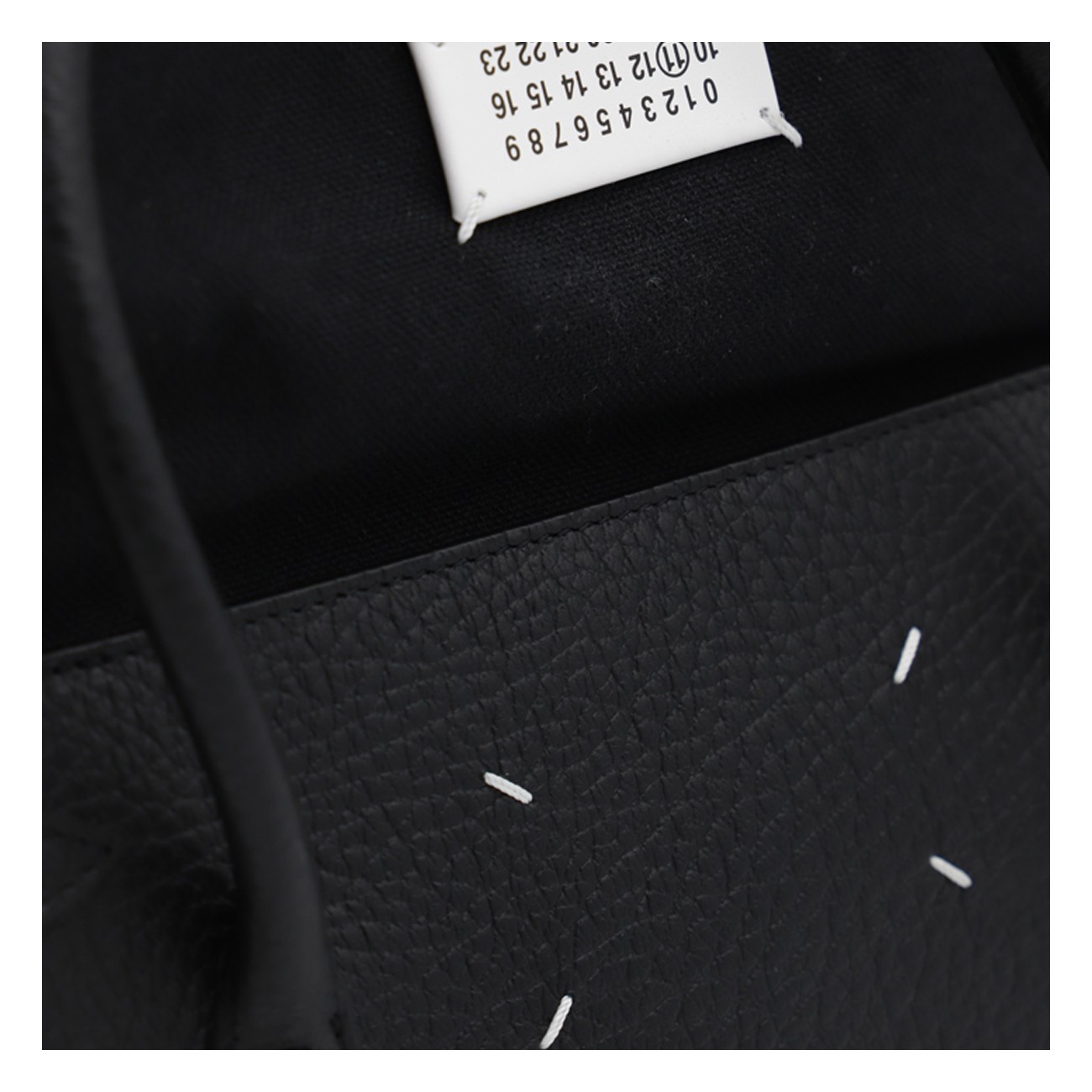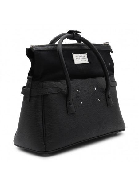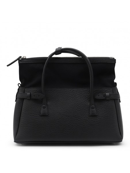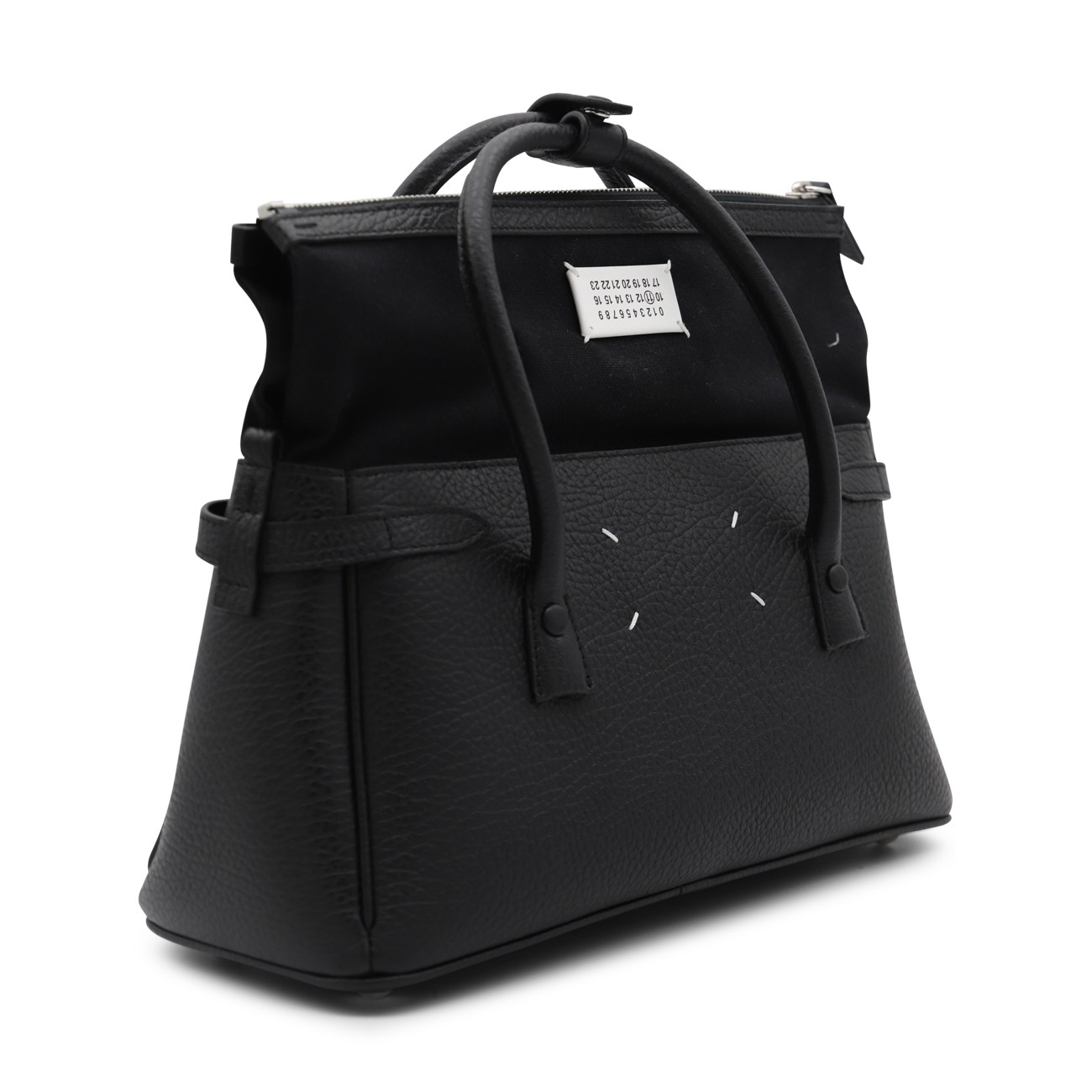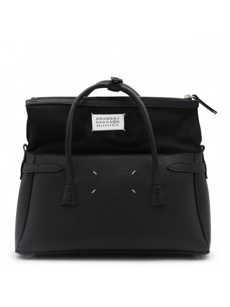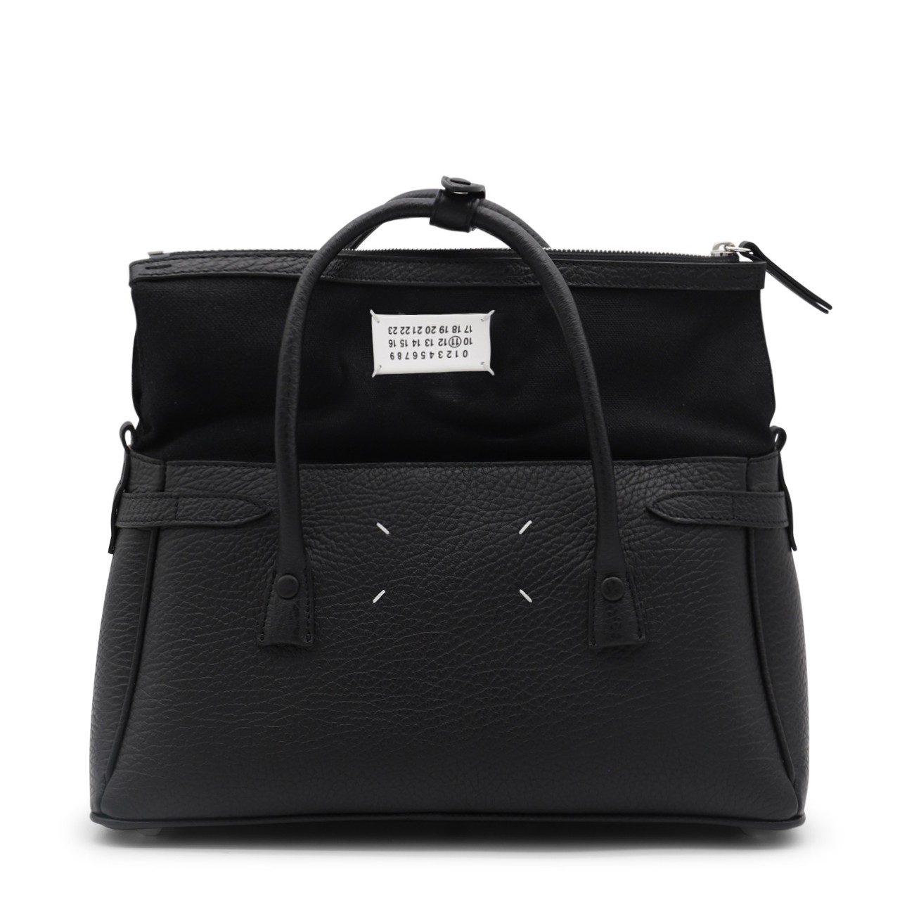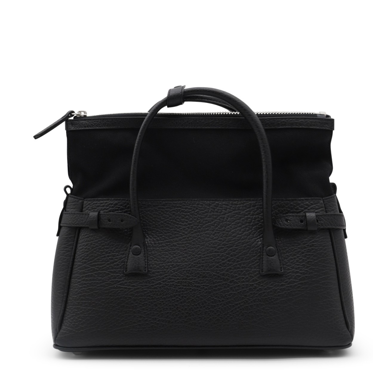 Black leather top handle bag from Maison Margiela featuring handles, logo, zip fastening and pockets.