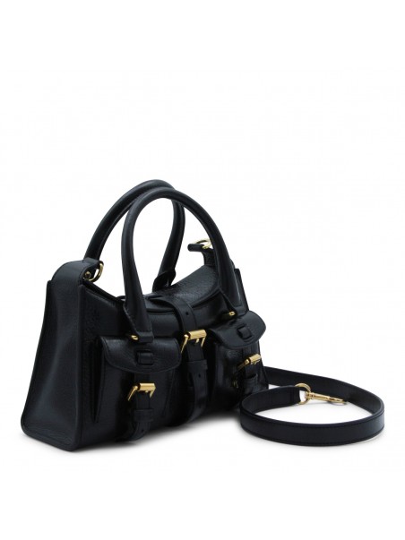 Black leather Mini Roxanne High Shine top handle bag from Mulberry featuring frontal fastening, gold tone hardware, adjustable and removable strap and pockets.