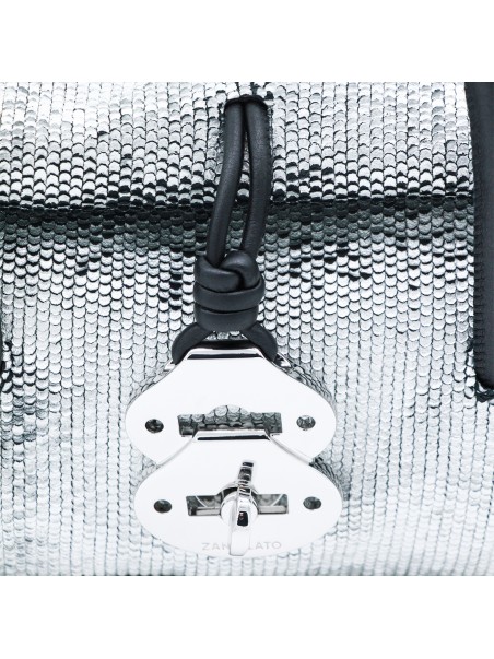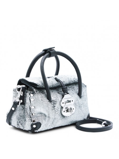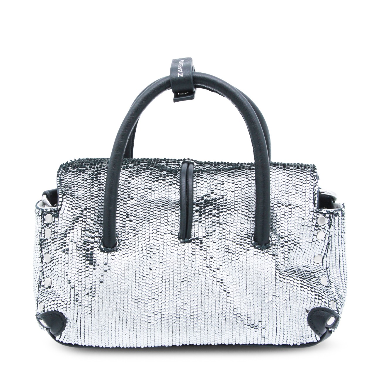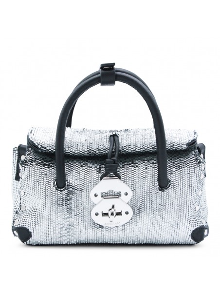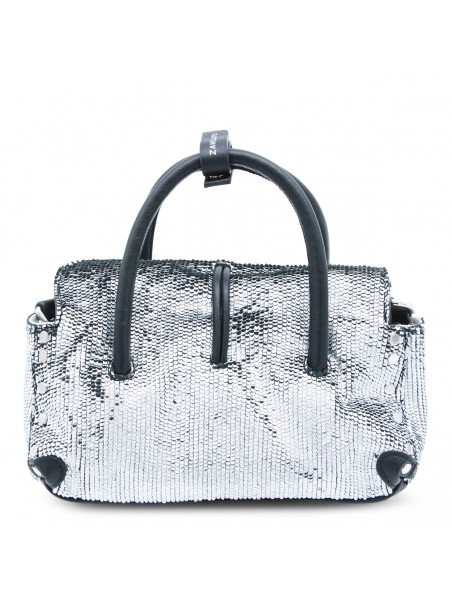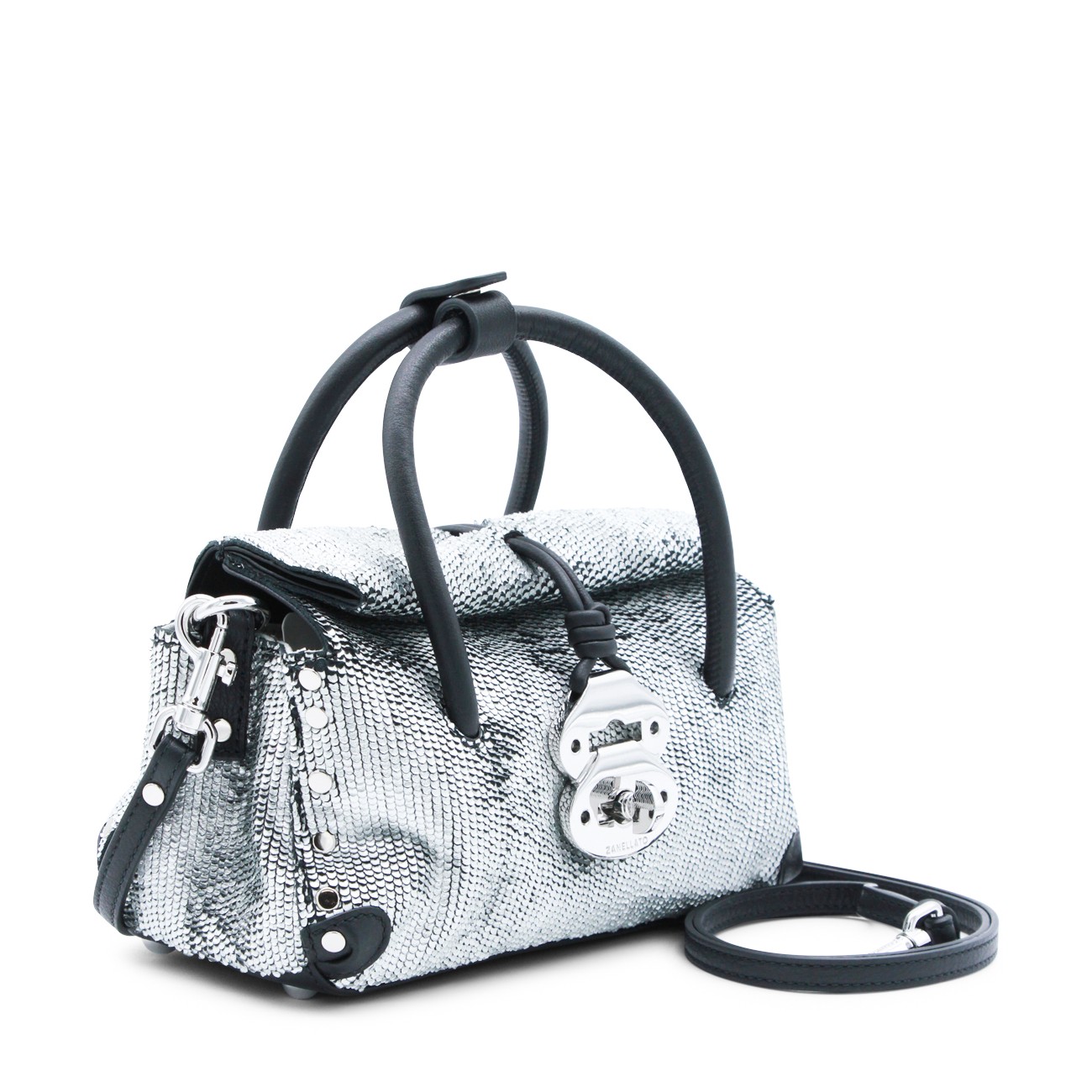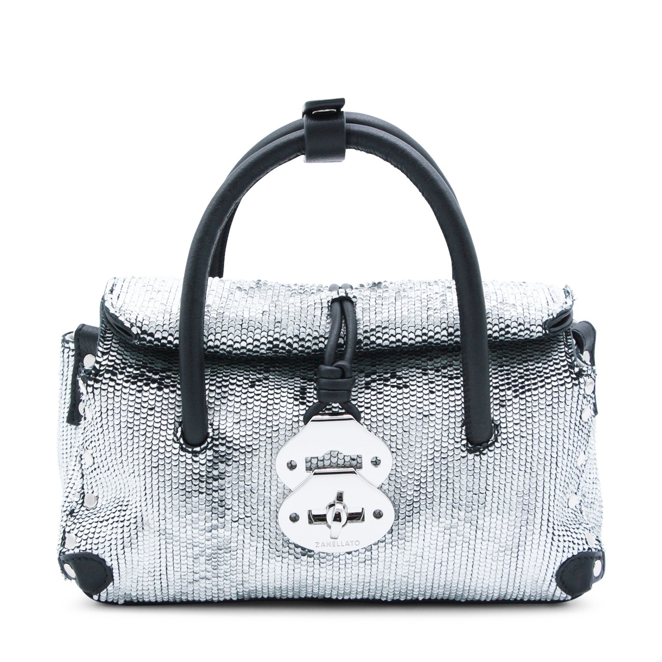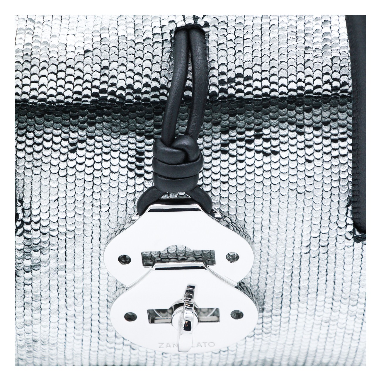 Silver leather Dotta Baby top handle bag from Zanellato featuring top handles, removable strap, frontal logo fastening, studs, silver tone hardware and all over details.