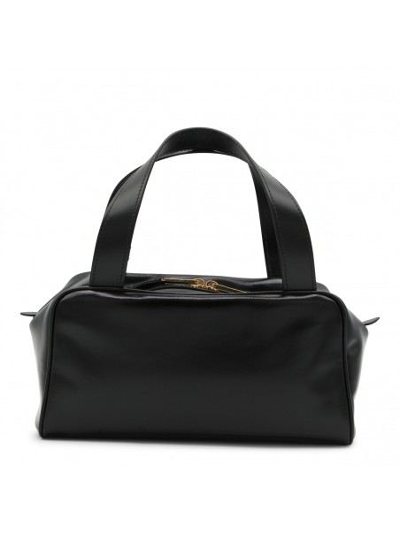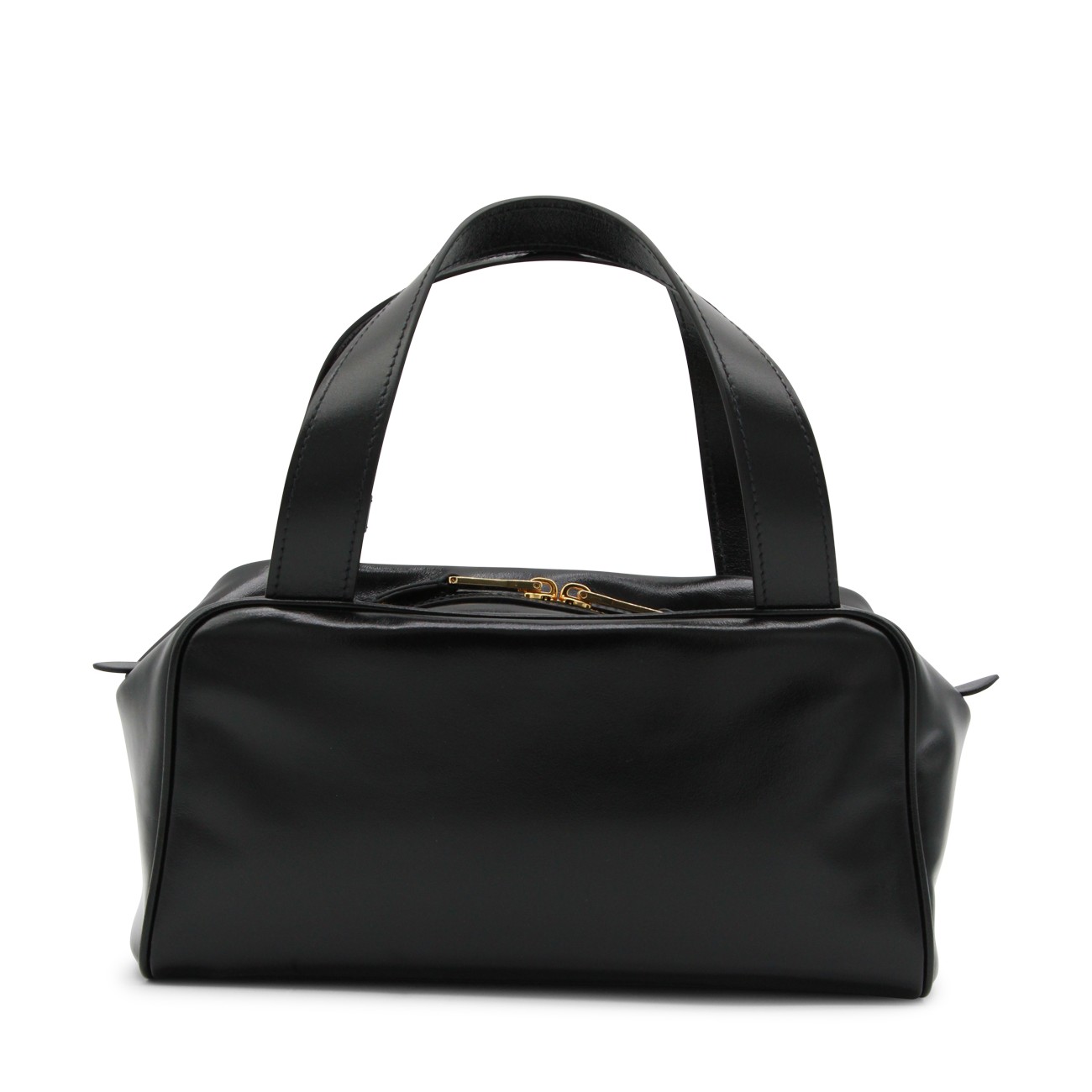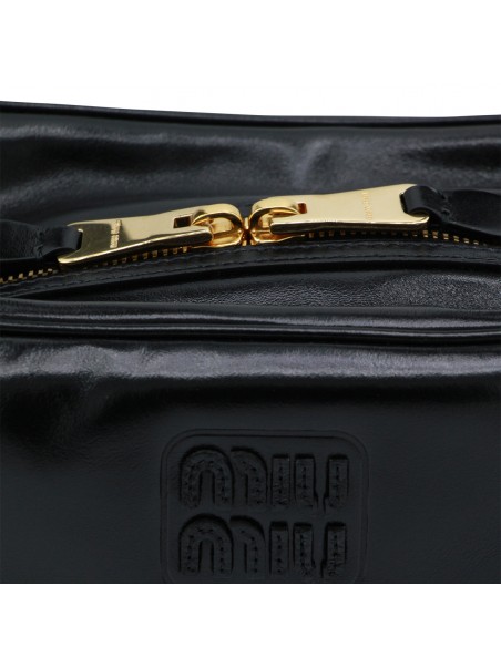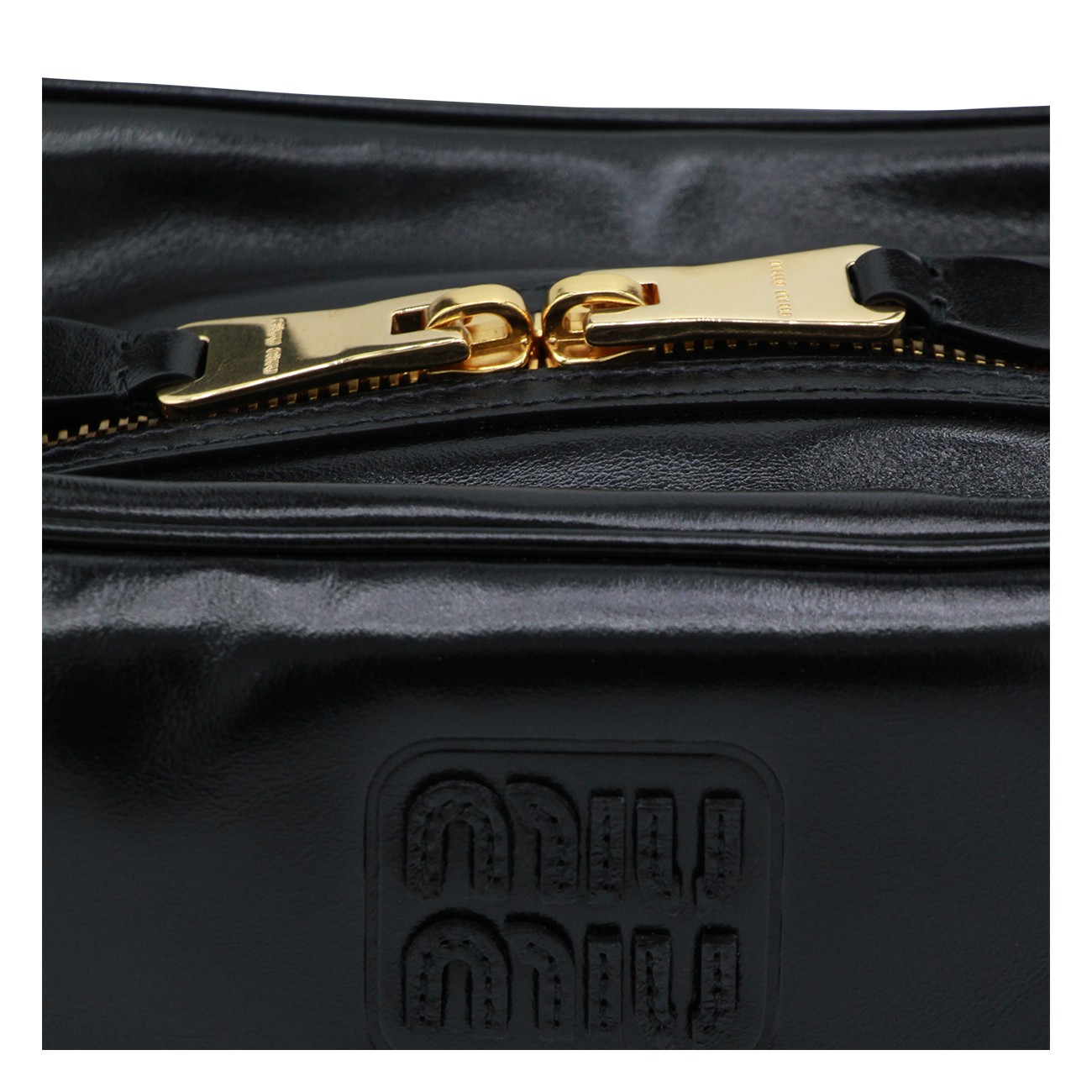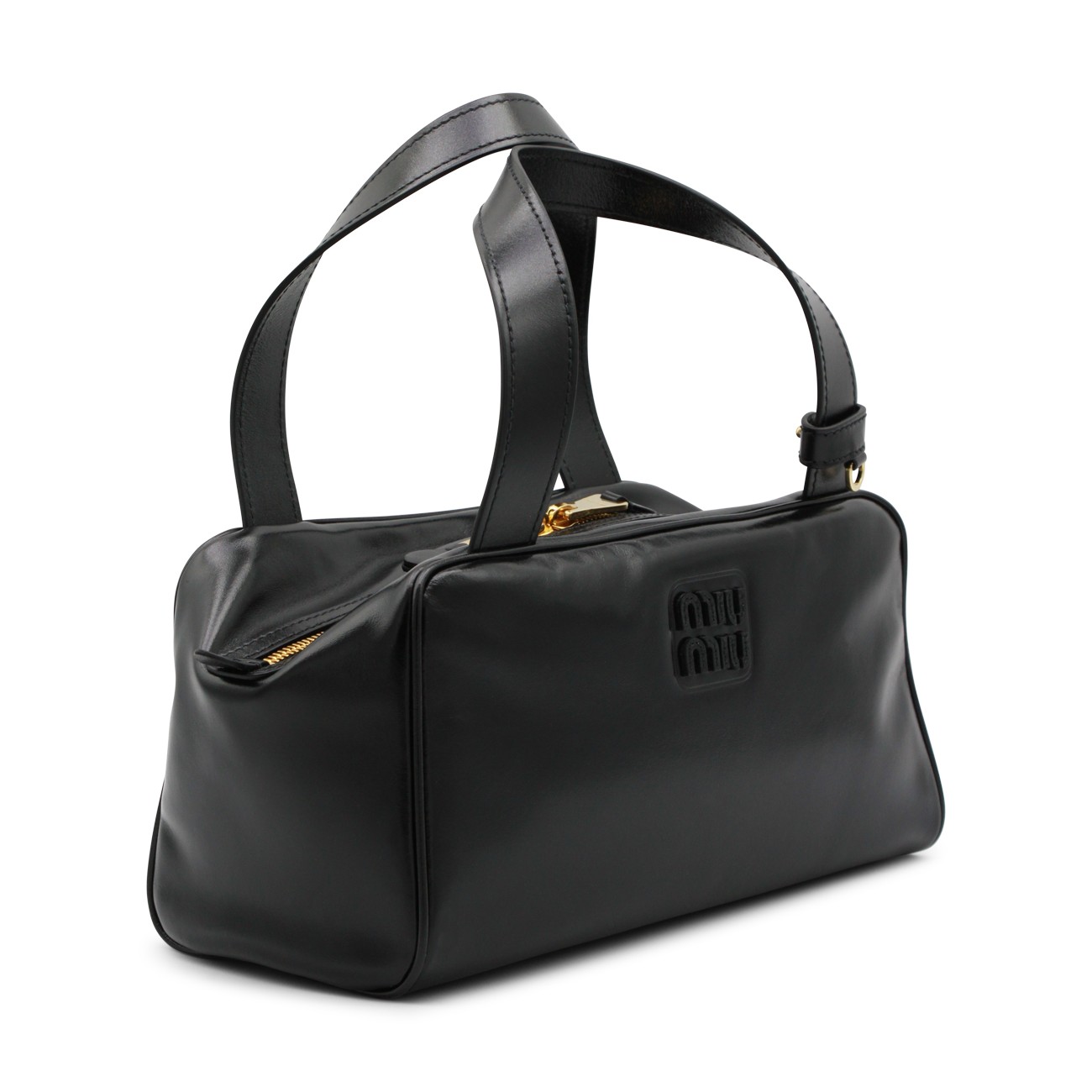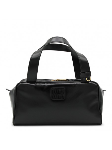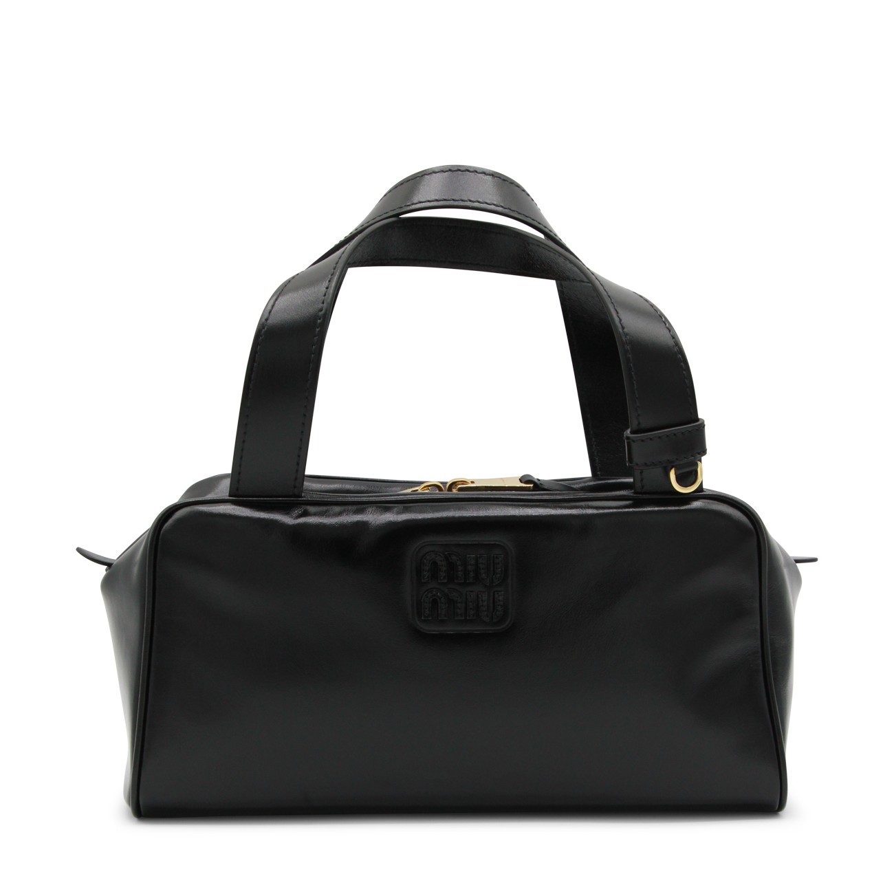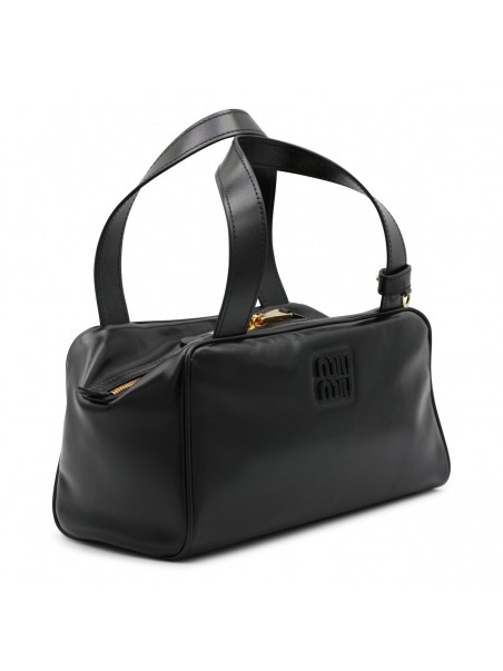 Black leather top handle bag from Miu Miu featuring top handles, zip fastening, main compartment, internal zip pocket and frontal logo detail.
