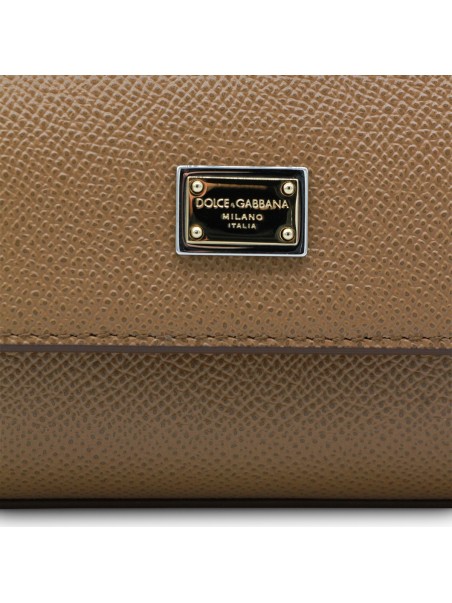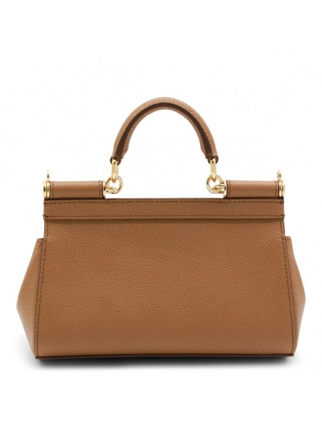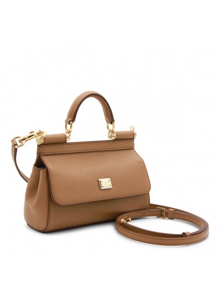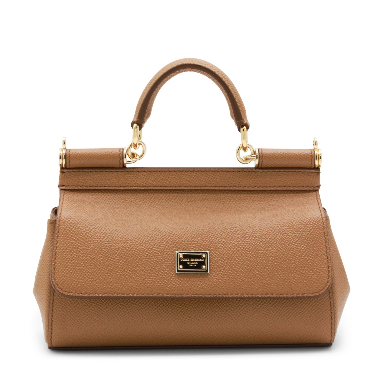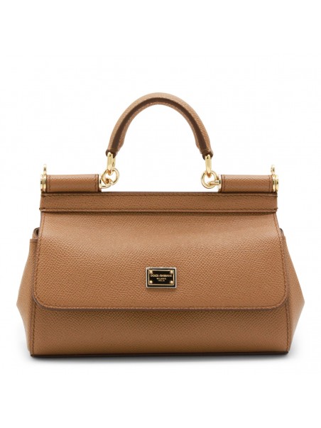Caramel leather Sicily Small top handle bag from Dolce & Gabbana featuring top handle, gold tone metal hardware, adjustable and removable shoulder strap, tuck-in closure, main compartment and internal zip pocket.