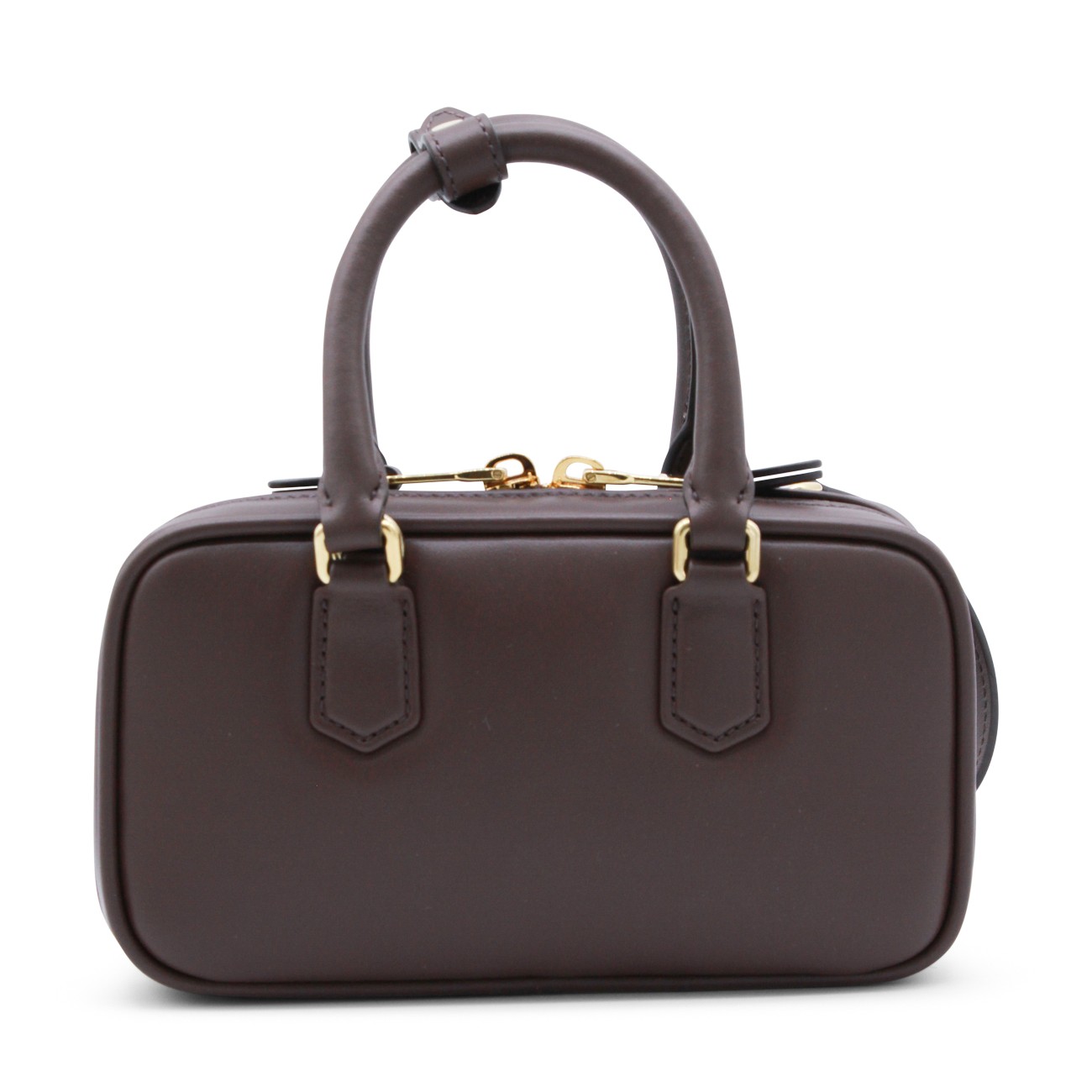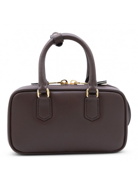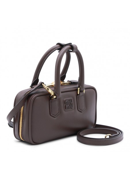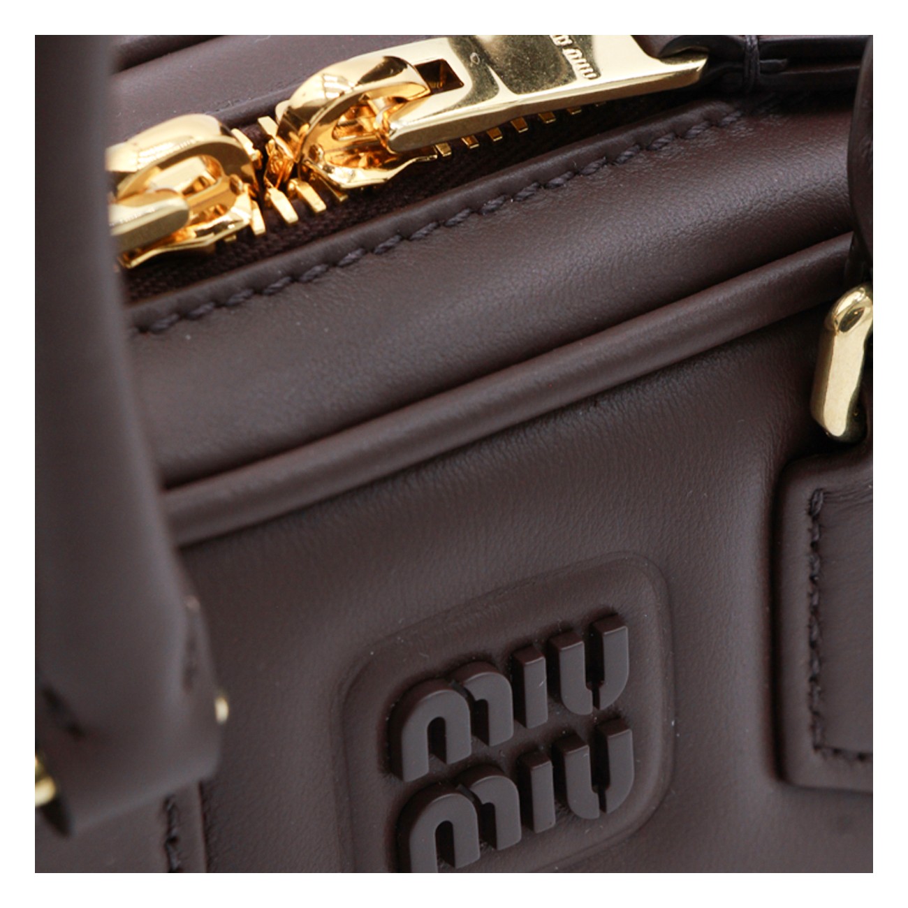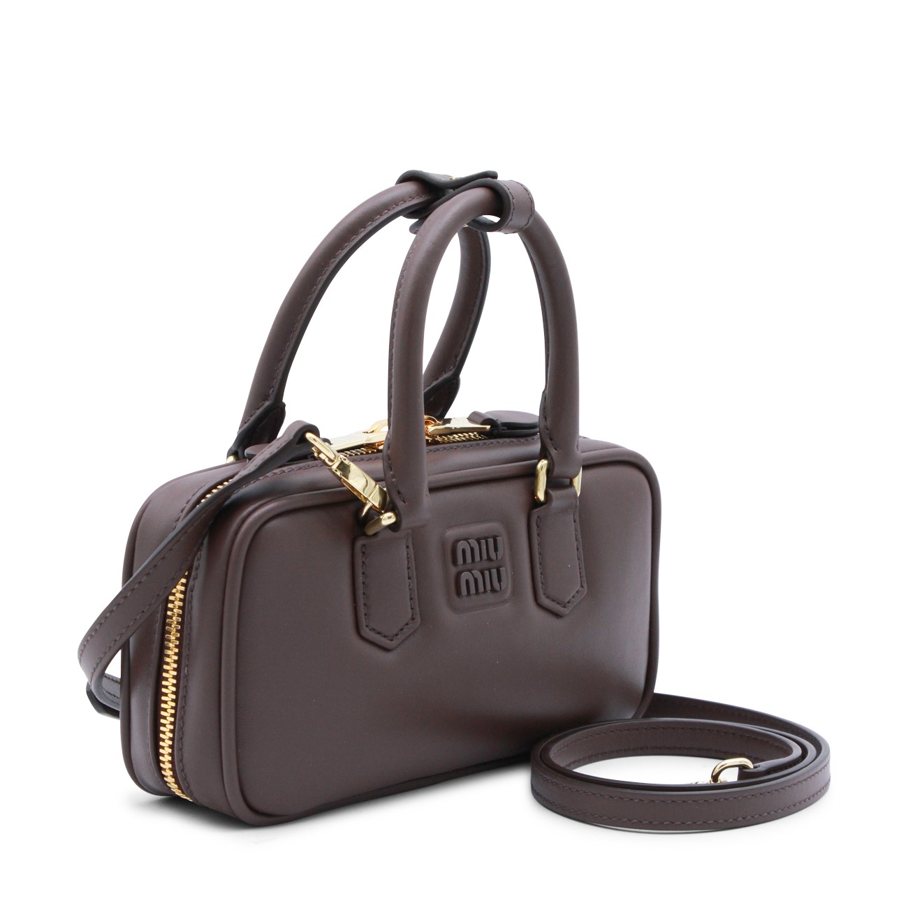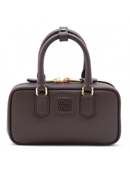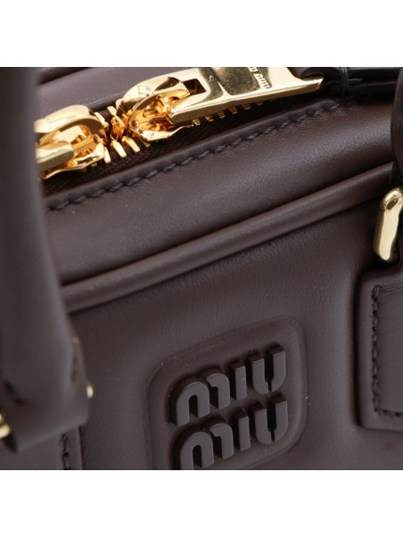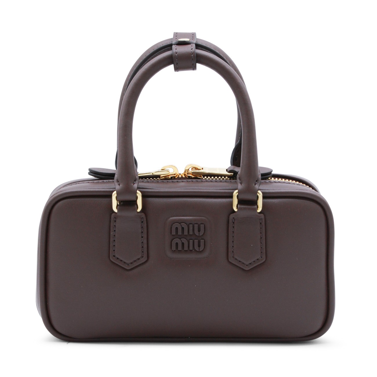 Dark brown leather top handle bag from Miu Miu featuring top handles, zip fastening, main compartment, internal zip pocket, golden hardware and frontal logo detail.