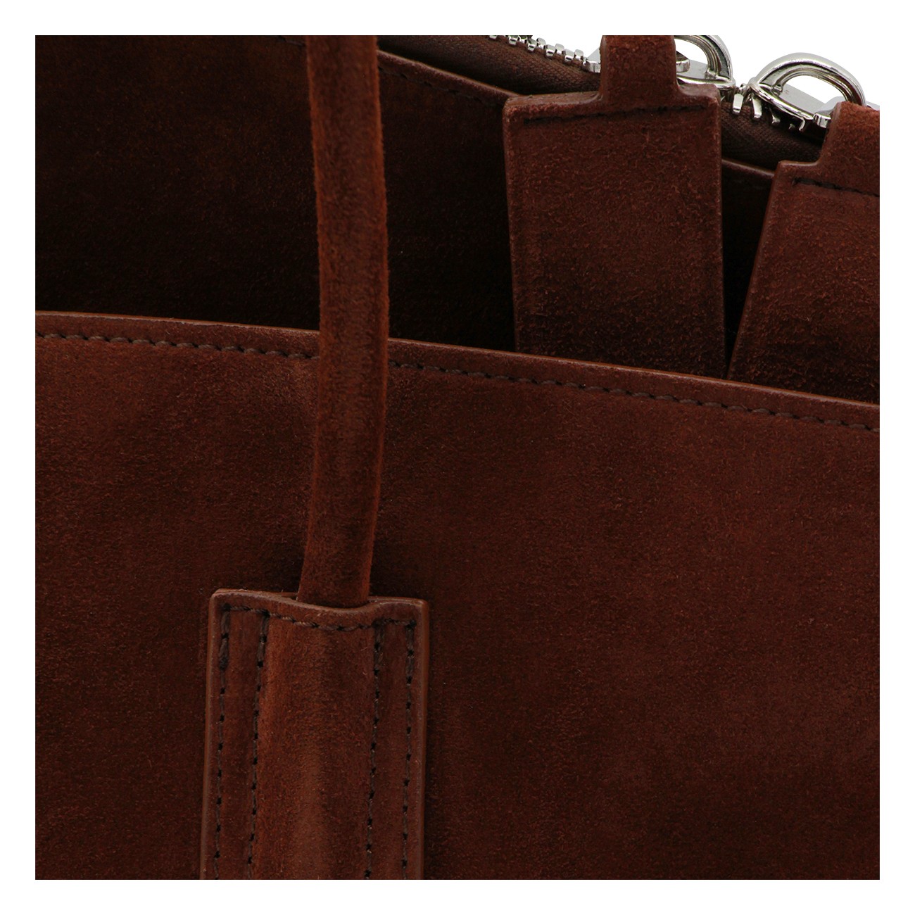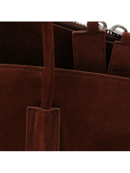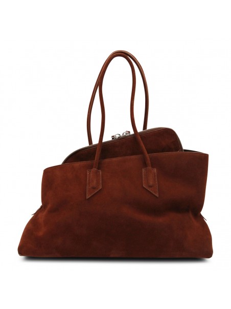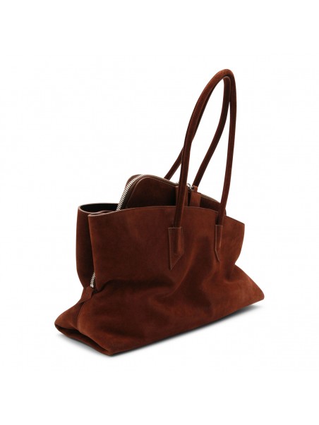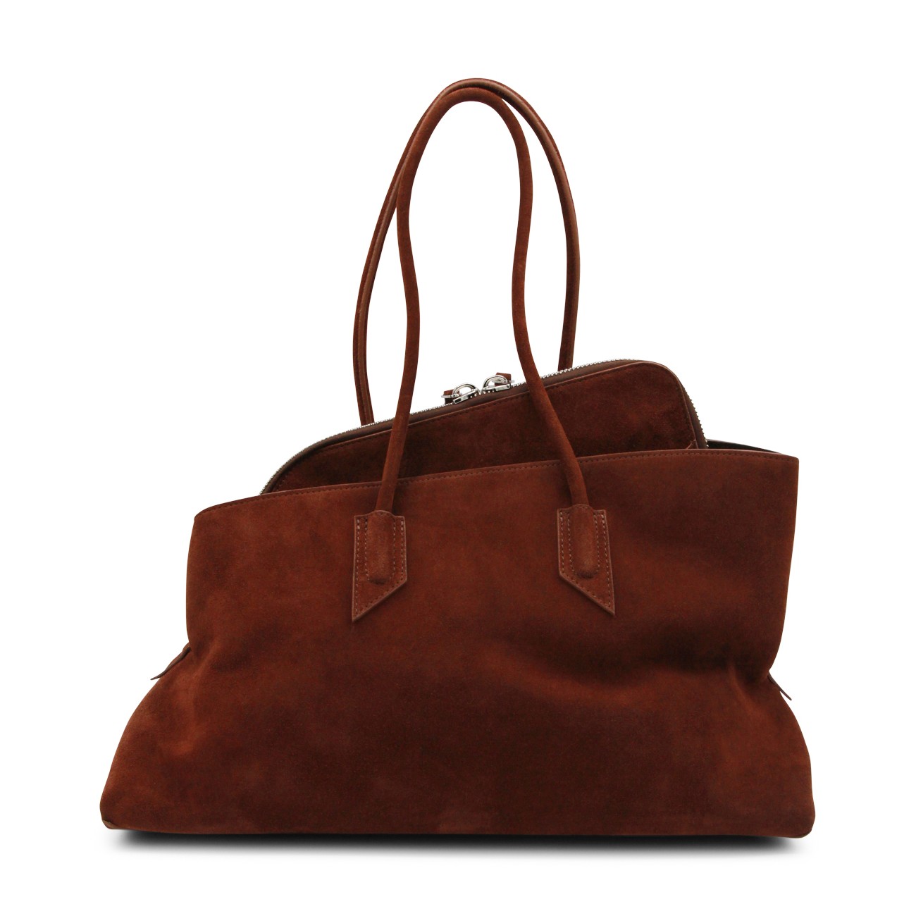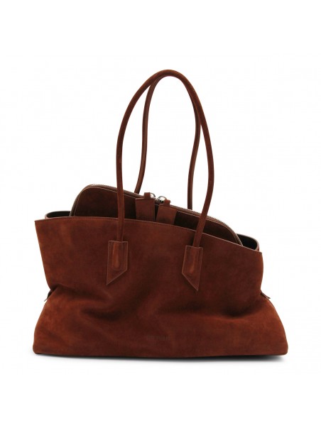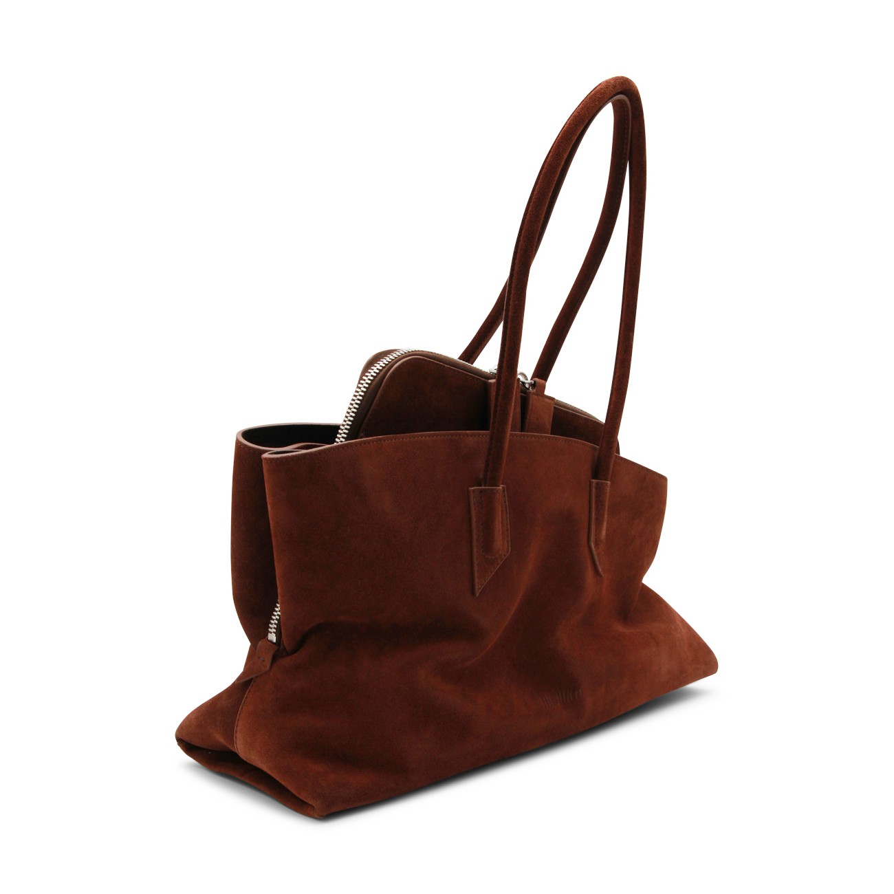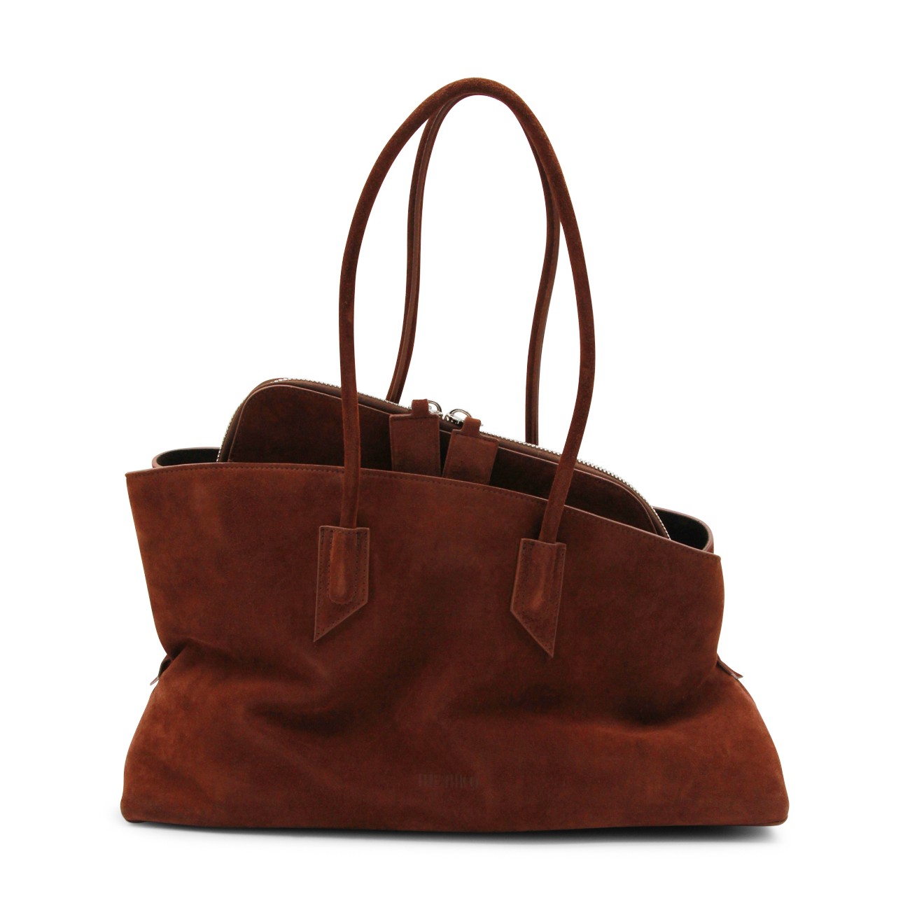 Brown leather top handle bag from The Attico featuring top handles, zip fastening and irregular shape.