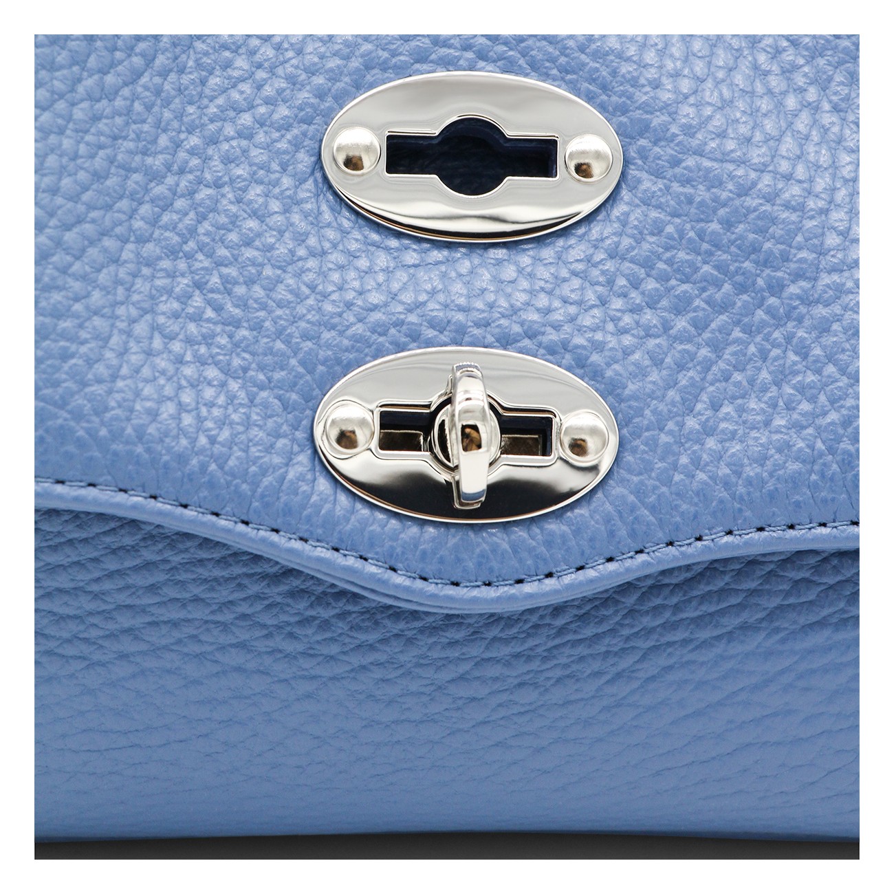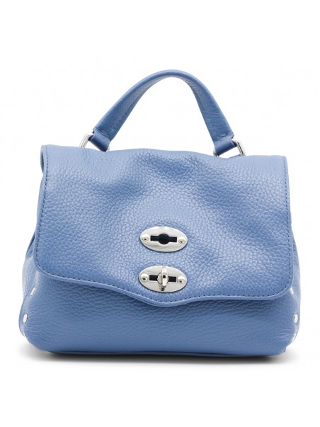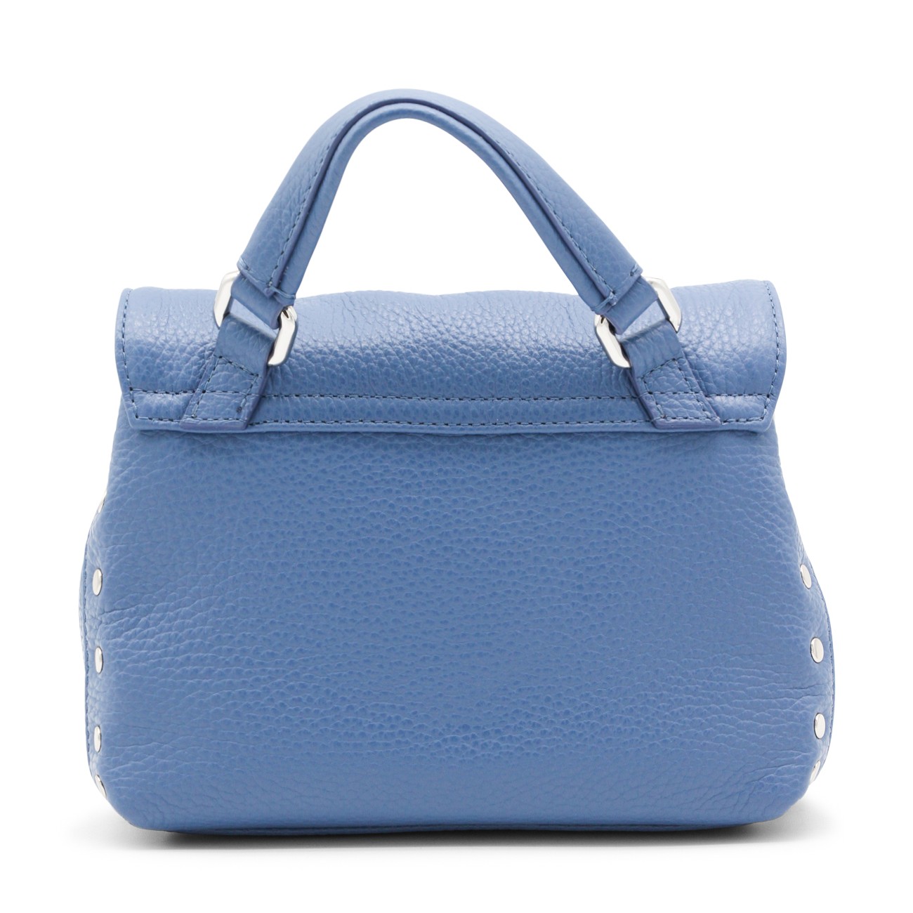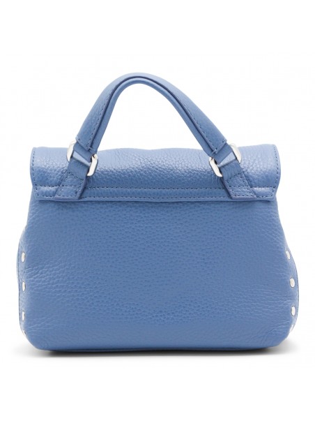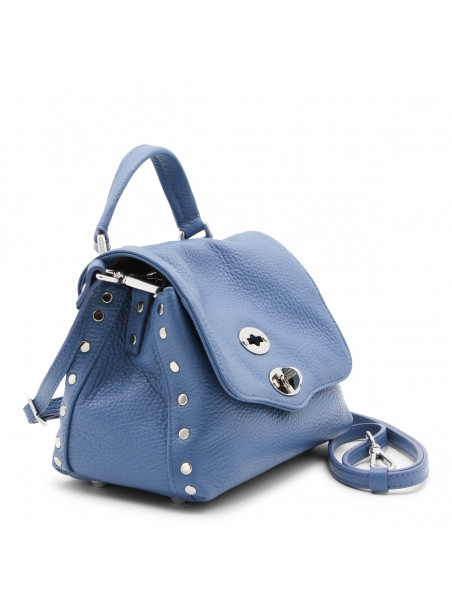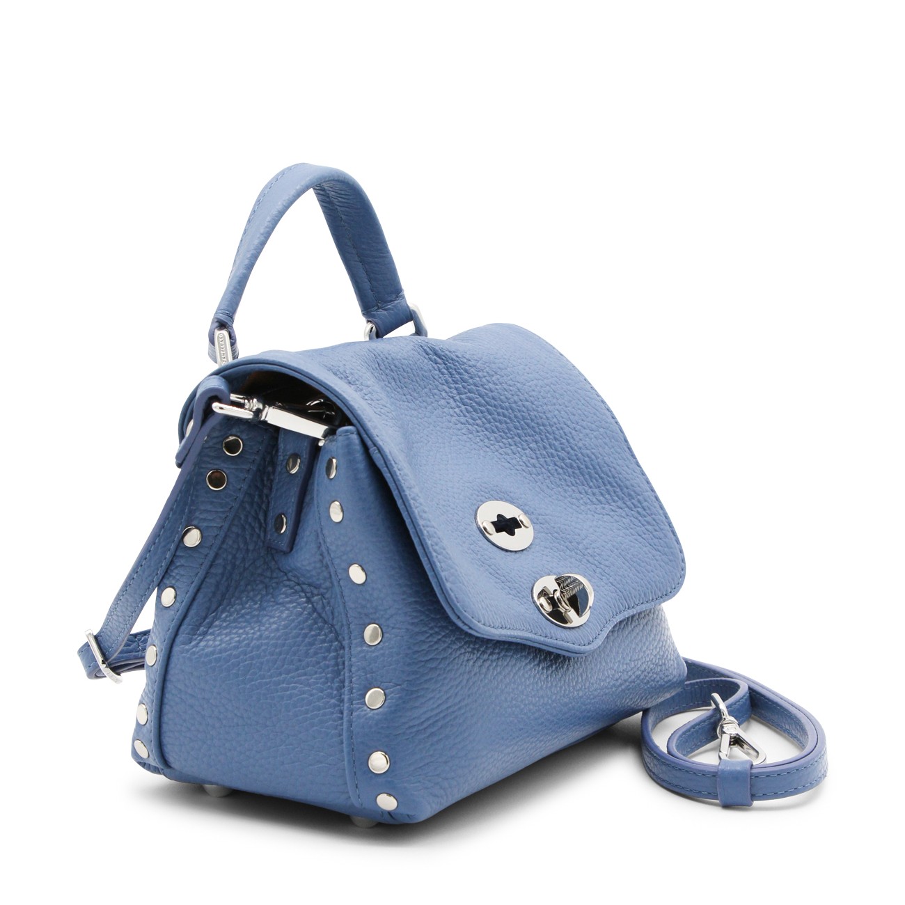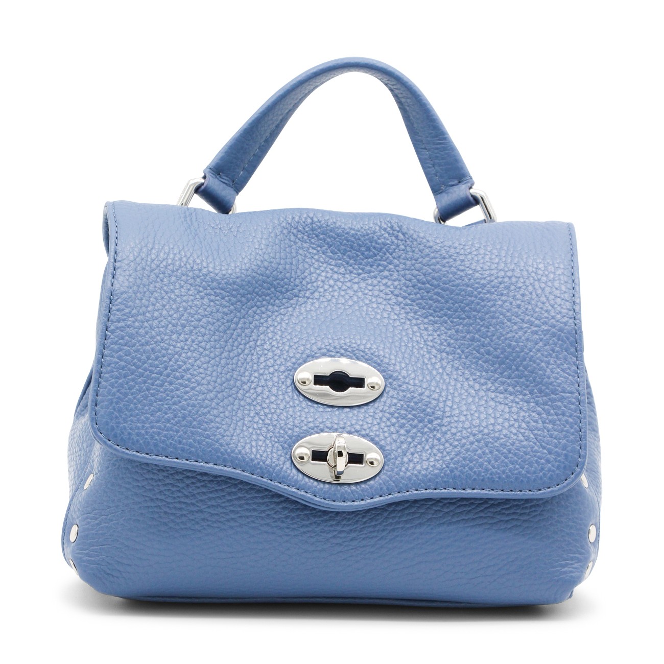 Blue leather Postina top handle bag from Zanellato featuring pebbled texture, silver-tone stud detailing, silver-tone hardware, internal logo patch, single flat top handle, detachable shoulder strap, foldover top, main compartment and internal slip pocket.