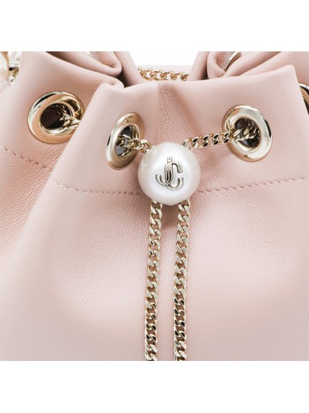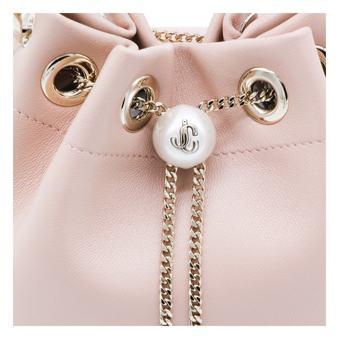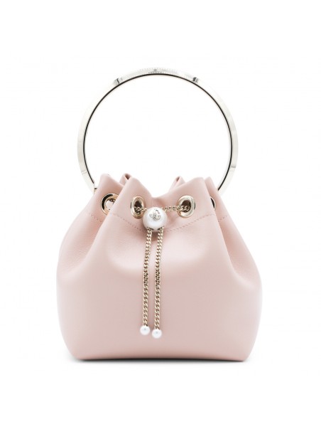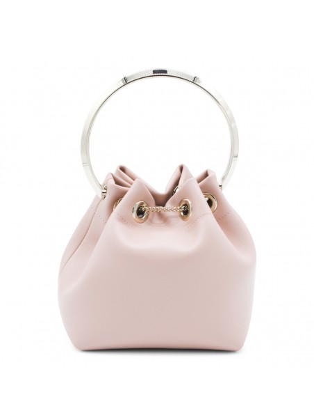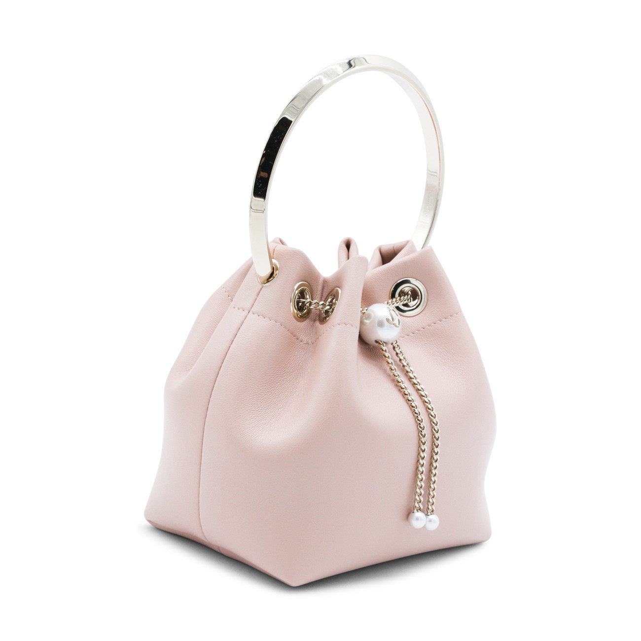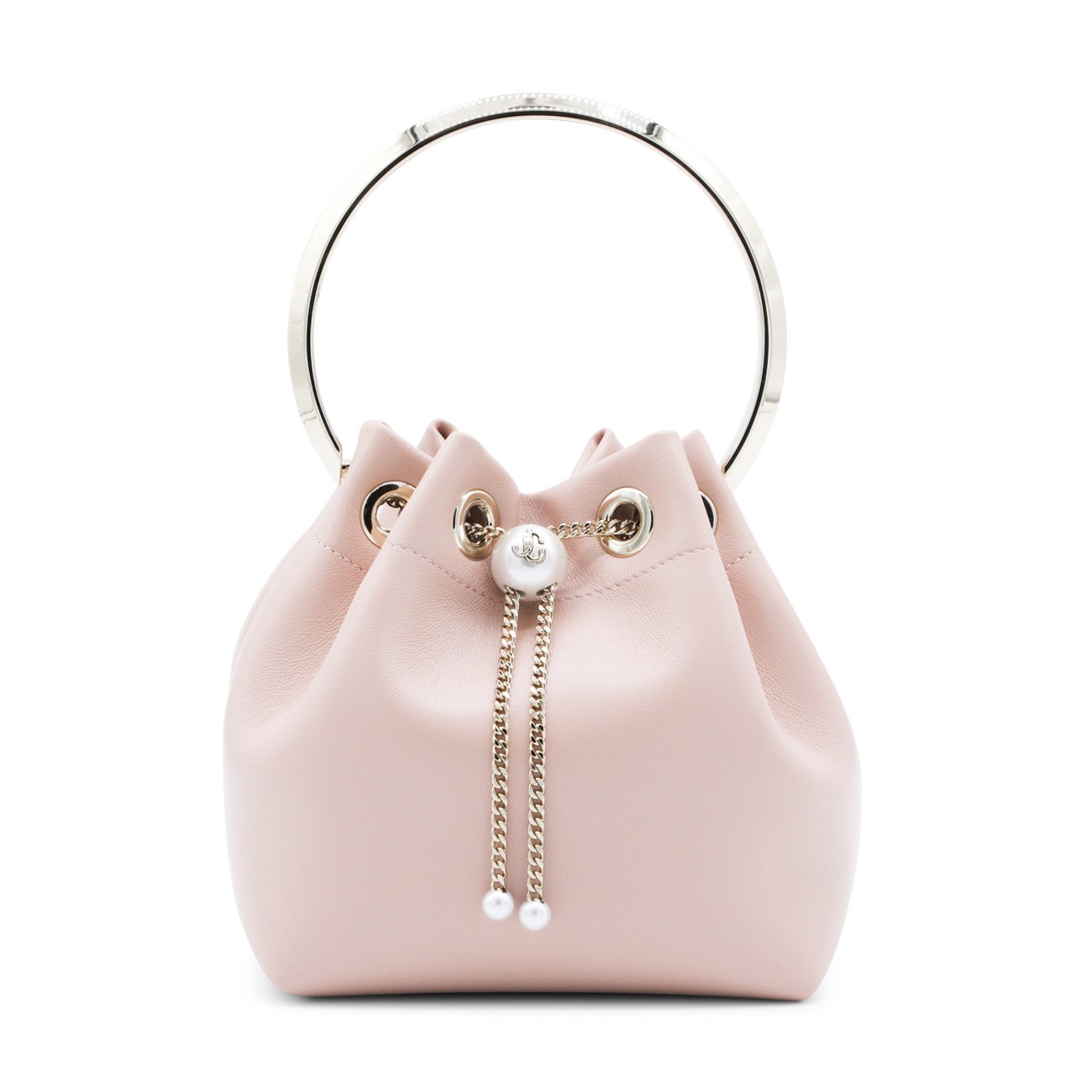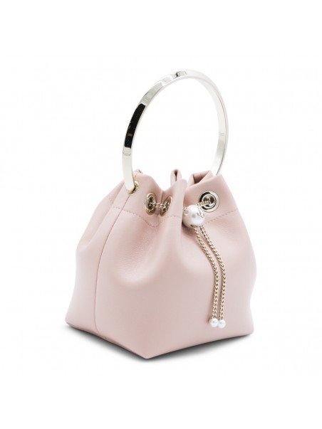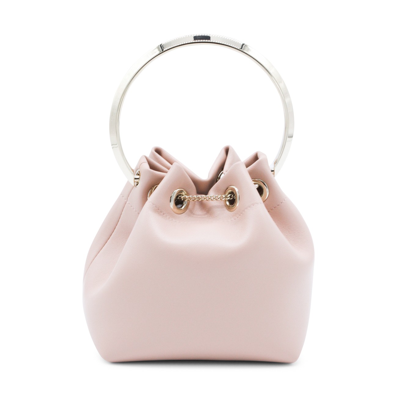 Pink top handle bag from Jimmy Choo featuring top handle, main compartment, godl tone hardware and chain lace fastening.