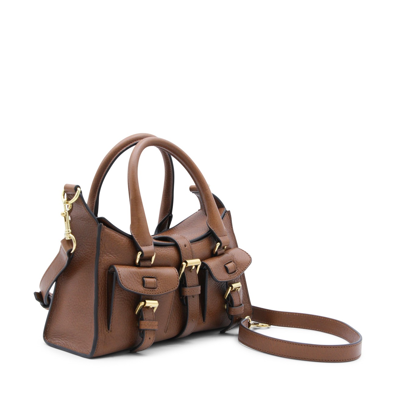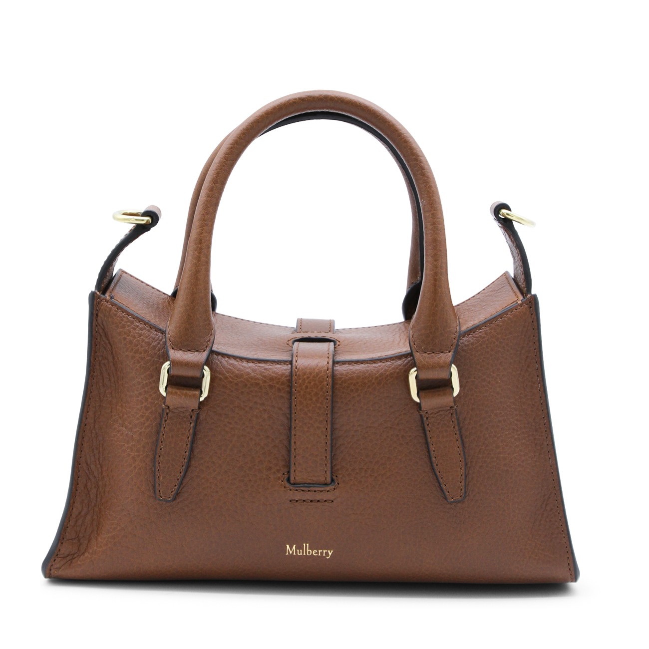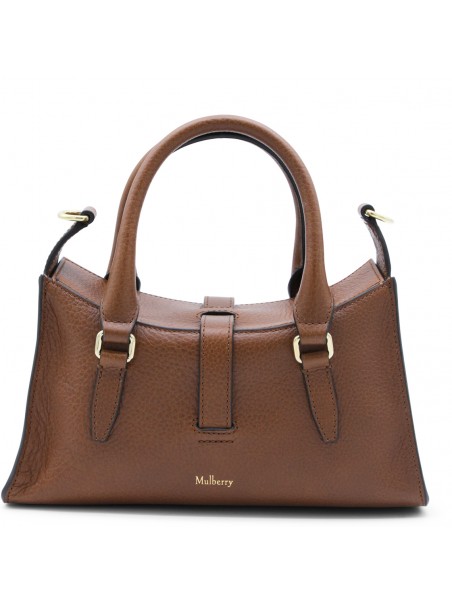 Brown leather Mini Roxanne Heritage top handle bag from Mulberry featuring top handles, removable and adjustable strap, external front pockets with magnetic closure, internal pocket, buckle detailing and Mulberry Heritage Check lining.
